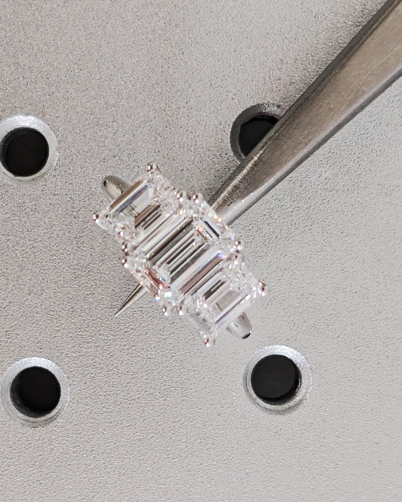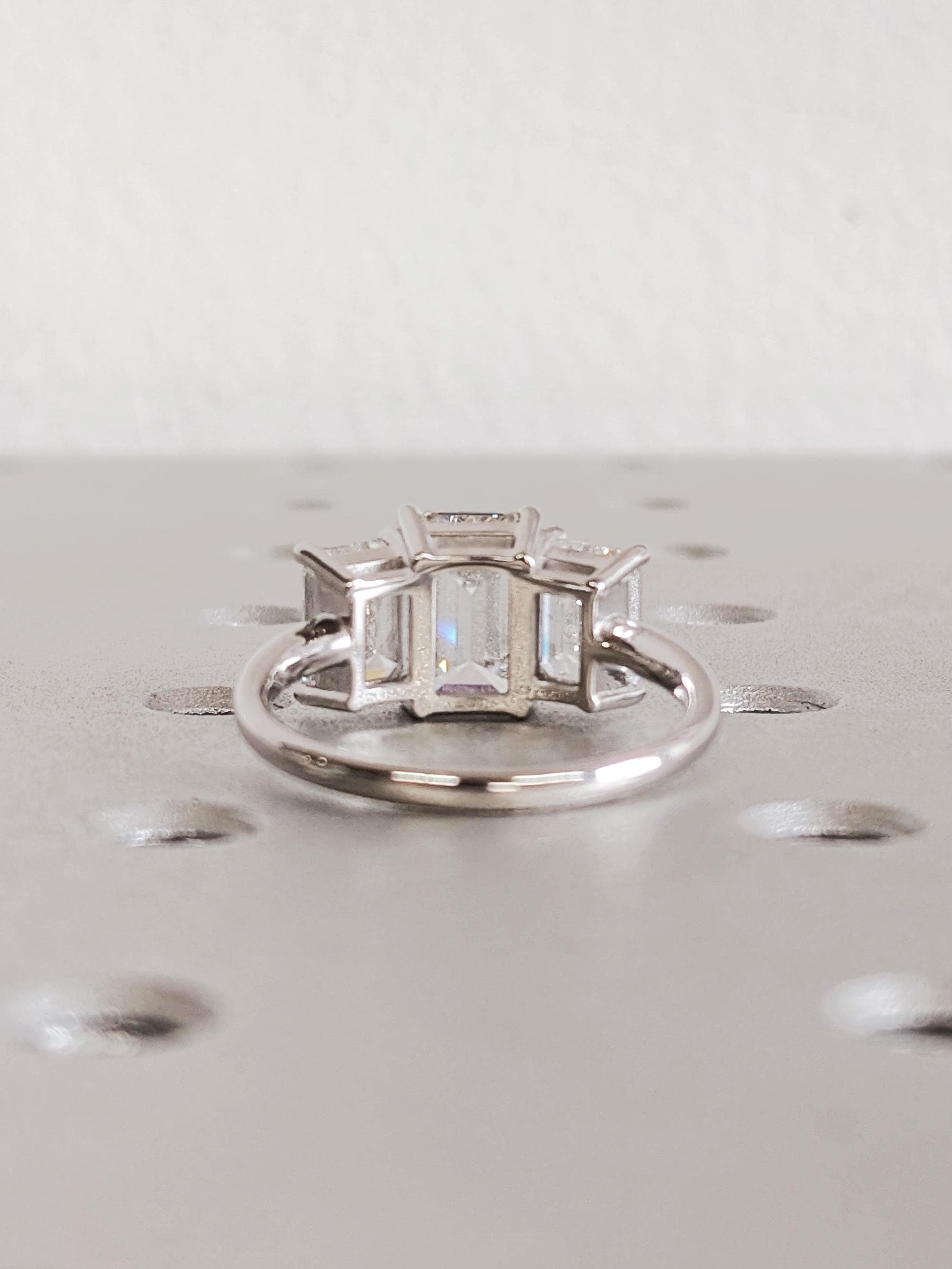 This ring showcases a stunning emerald cut Moissanite arranged in a sleek, modern silhouette, creating a clean geometric look. The side stones can be customized in Natural Diamond, Lab Diamond or Moissanite, allowing you to tailor the sparkle to your preference.