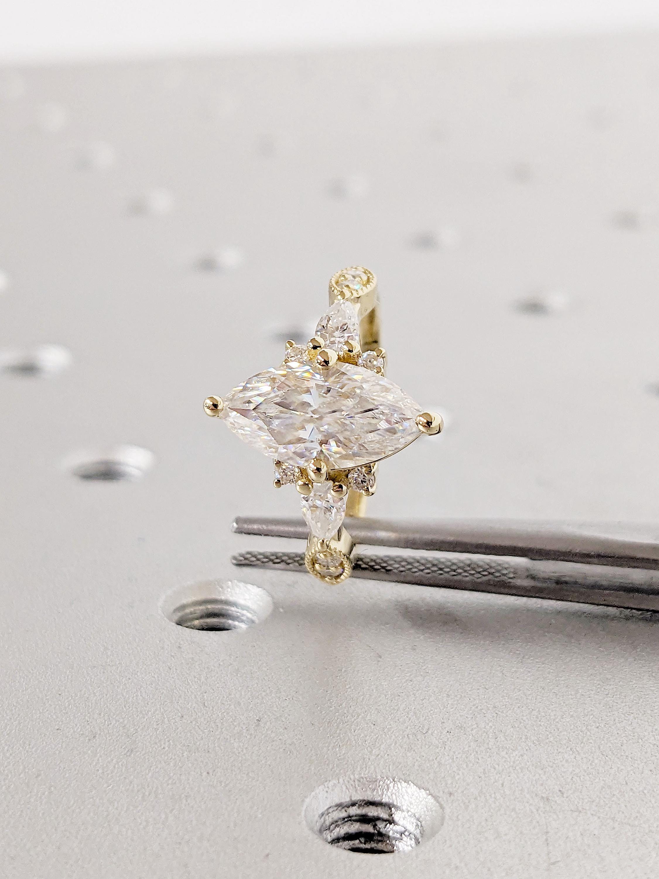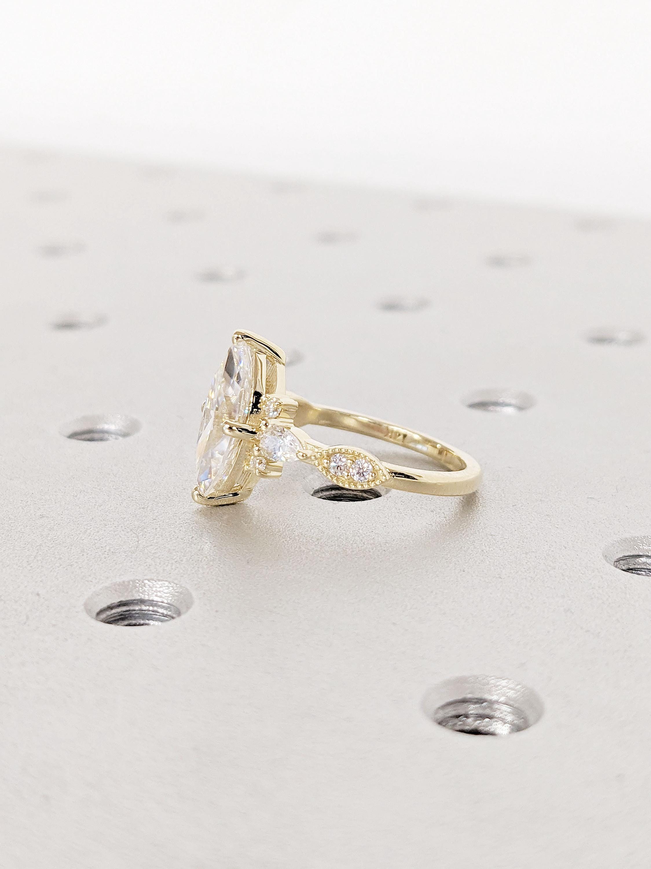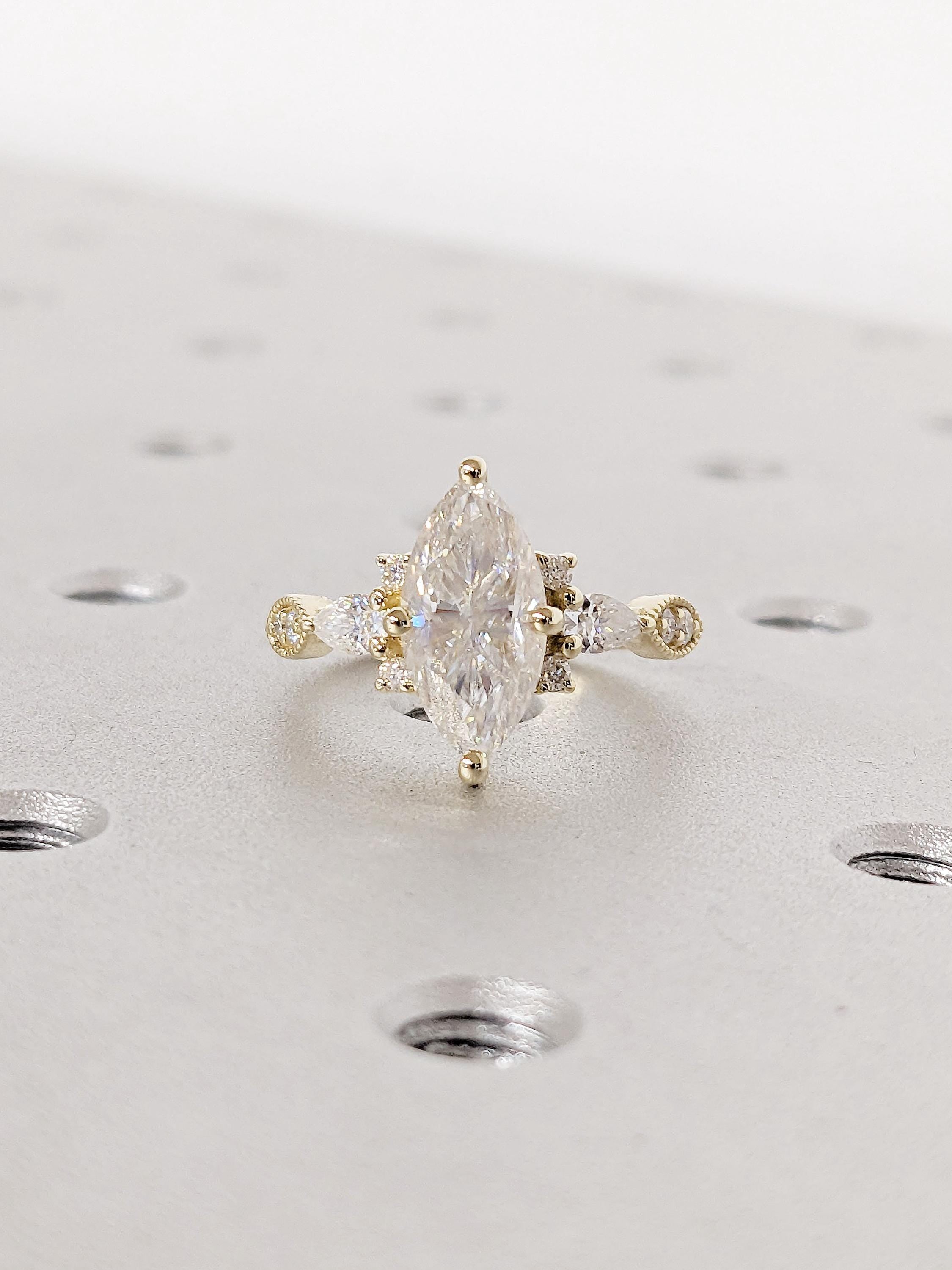 A vintage inspired statement ring, features a marquise cut Lab Diamond focal stone, accented by round and pear cut side stones available in natural diamonds, lab diamonds or moissanites of your choice. With delicate hand engraved milgrain detailing, this fashionable jewelry effortlessly complements your style for any occasion.