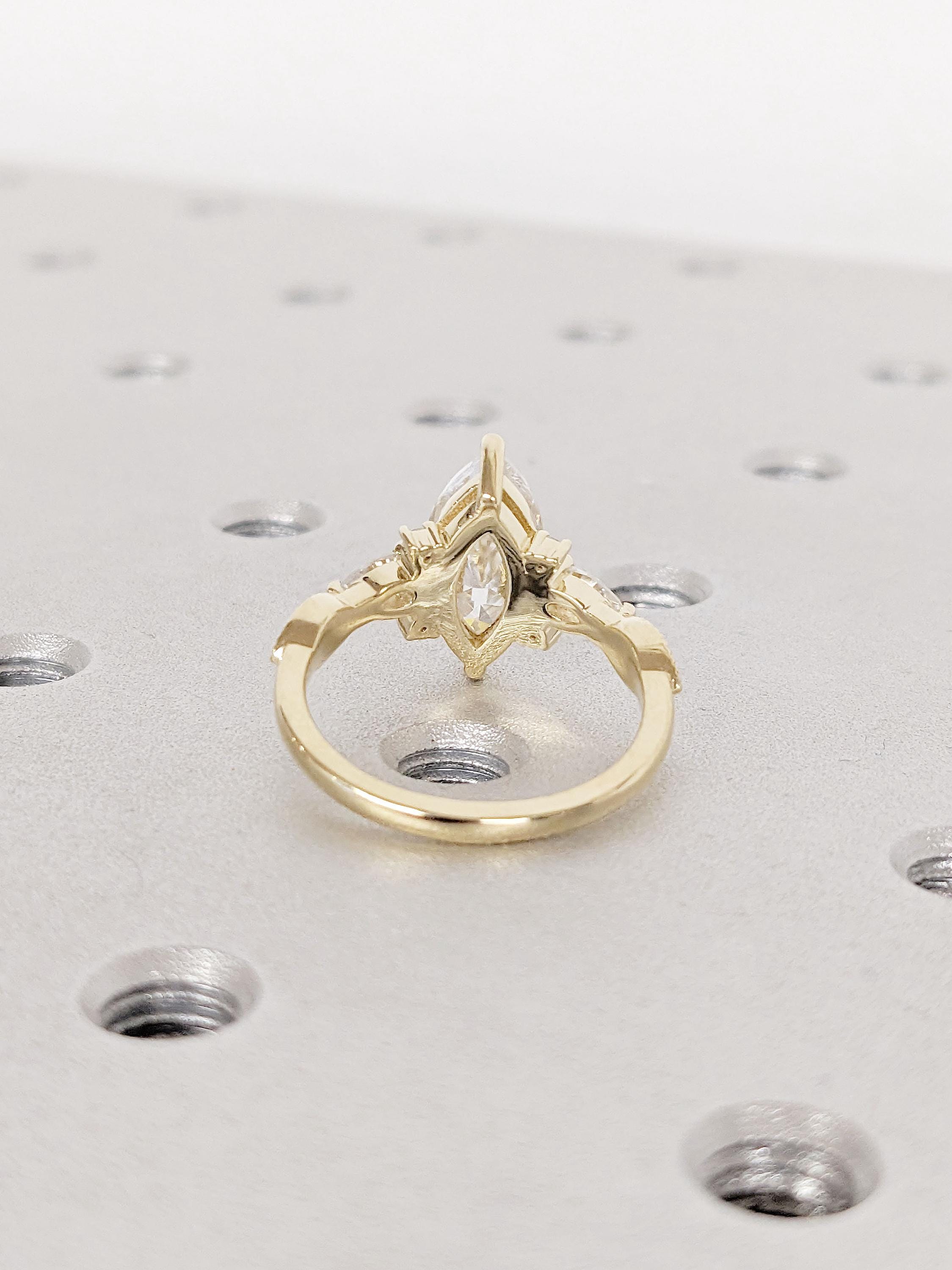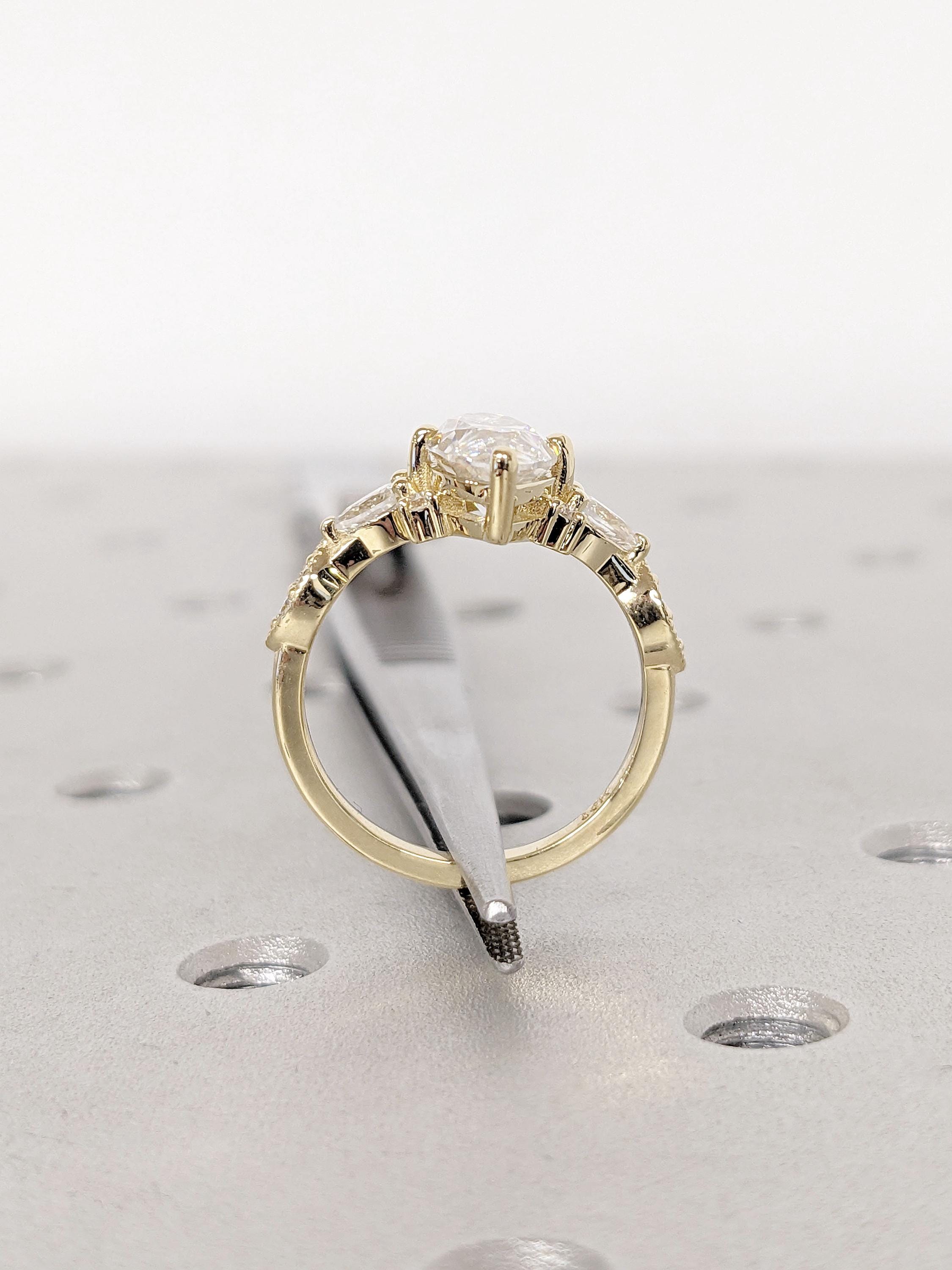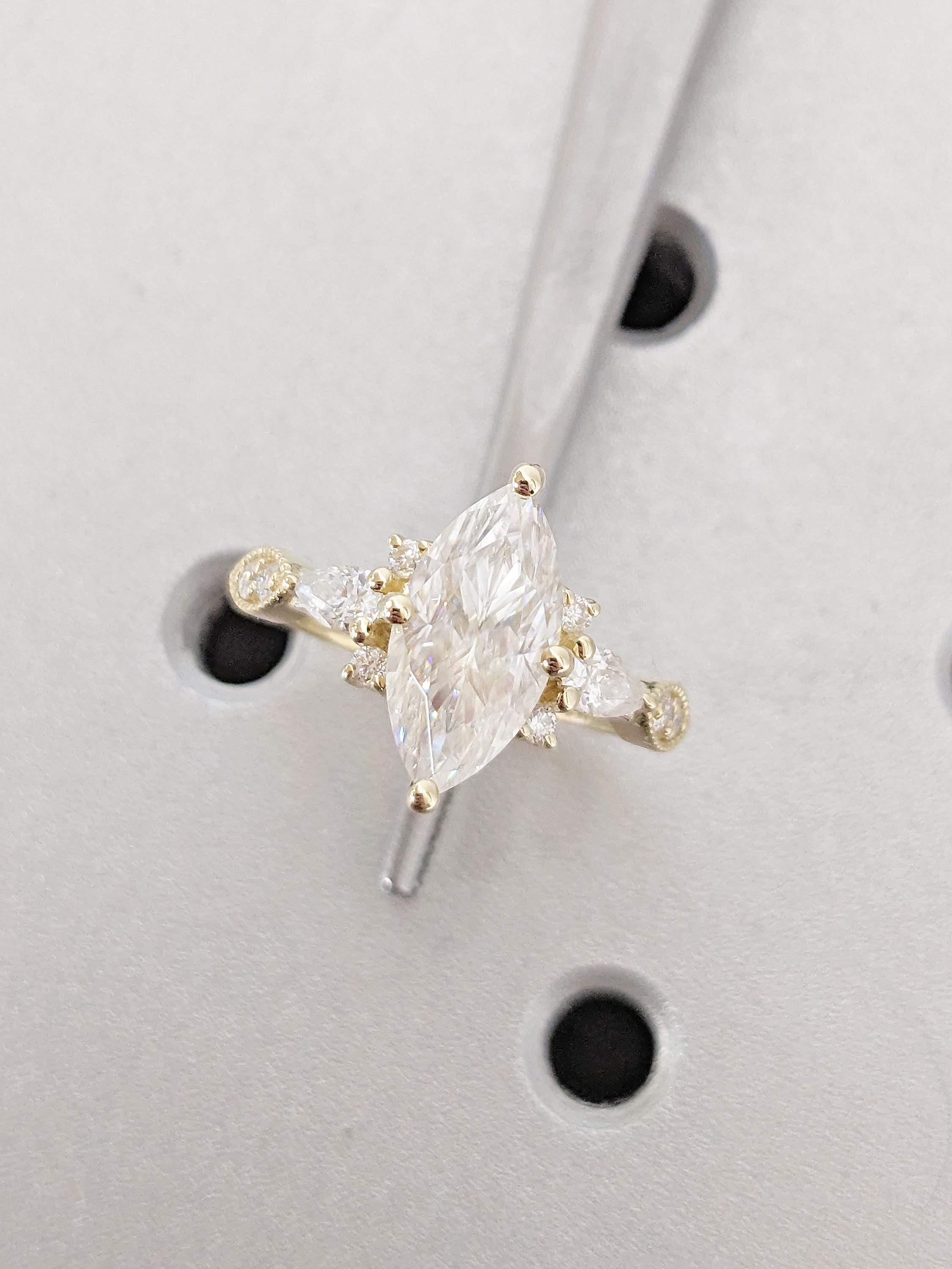 A vintage inspired statement ring, features a marquise cut Lab Diamond focal stone, accented by round and pear cut side stones available in natural diamonds, lab diamonds or moissanites of your choice. With delicate hand engraved milgrain detailing, this fashionable jewelry effortlessly complements your style for any occasion.