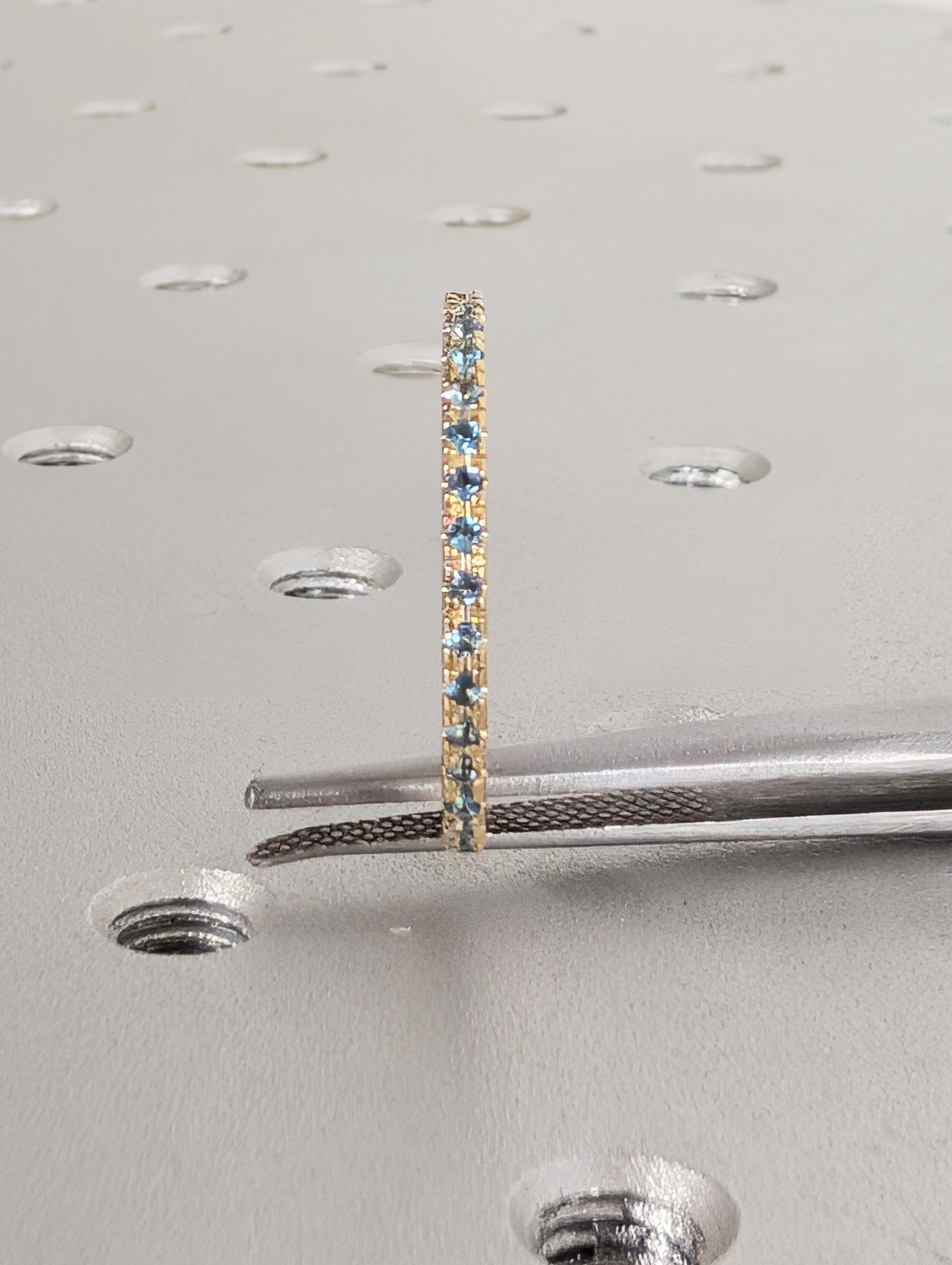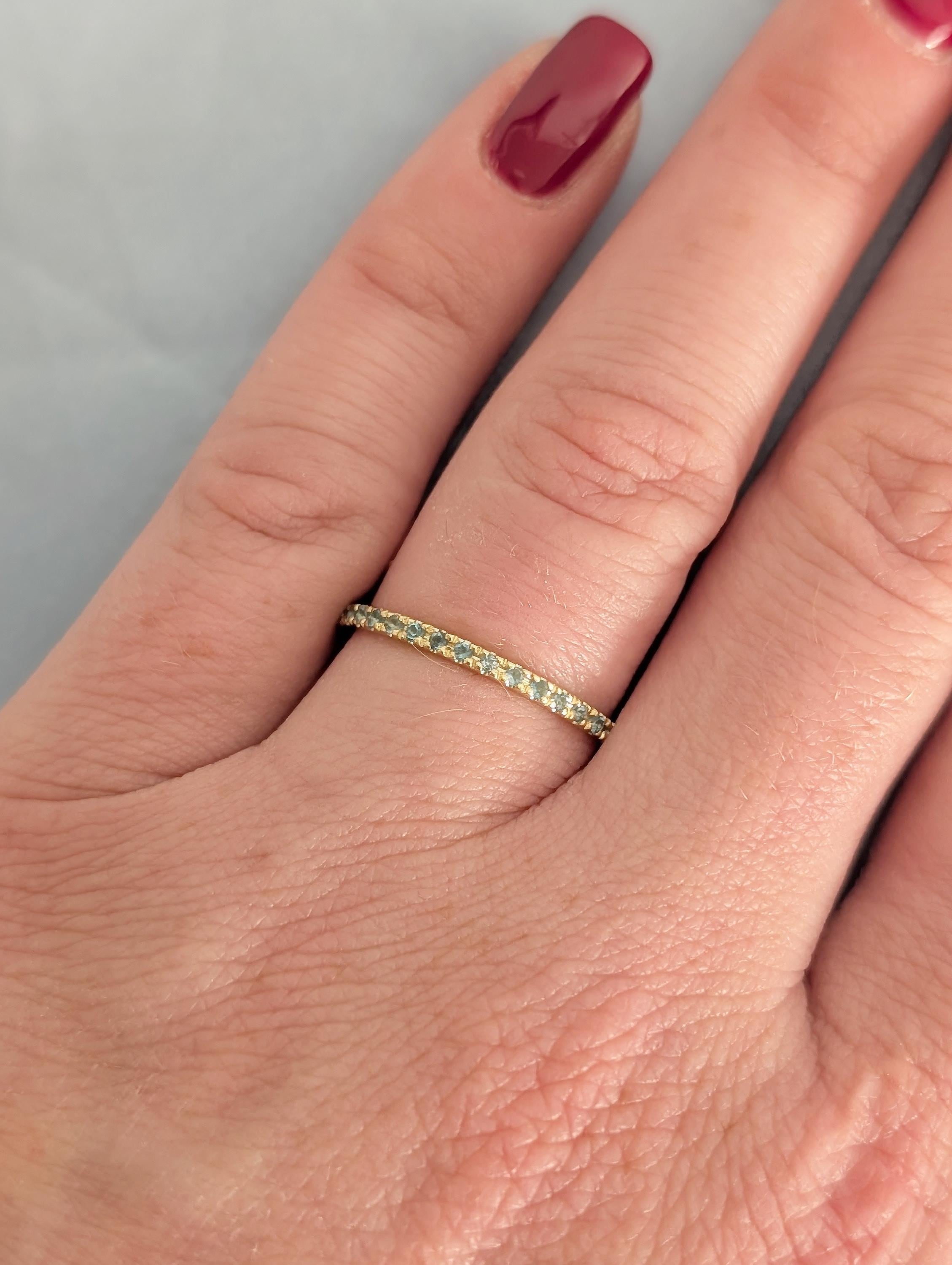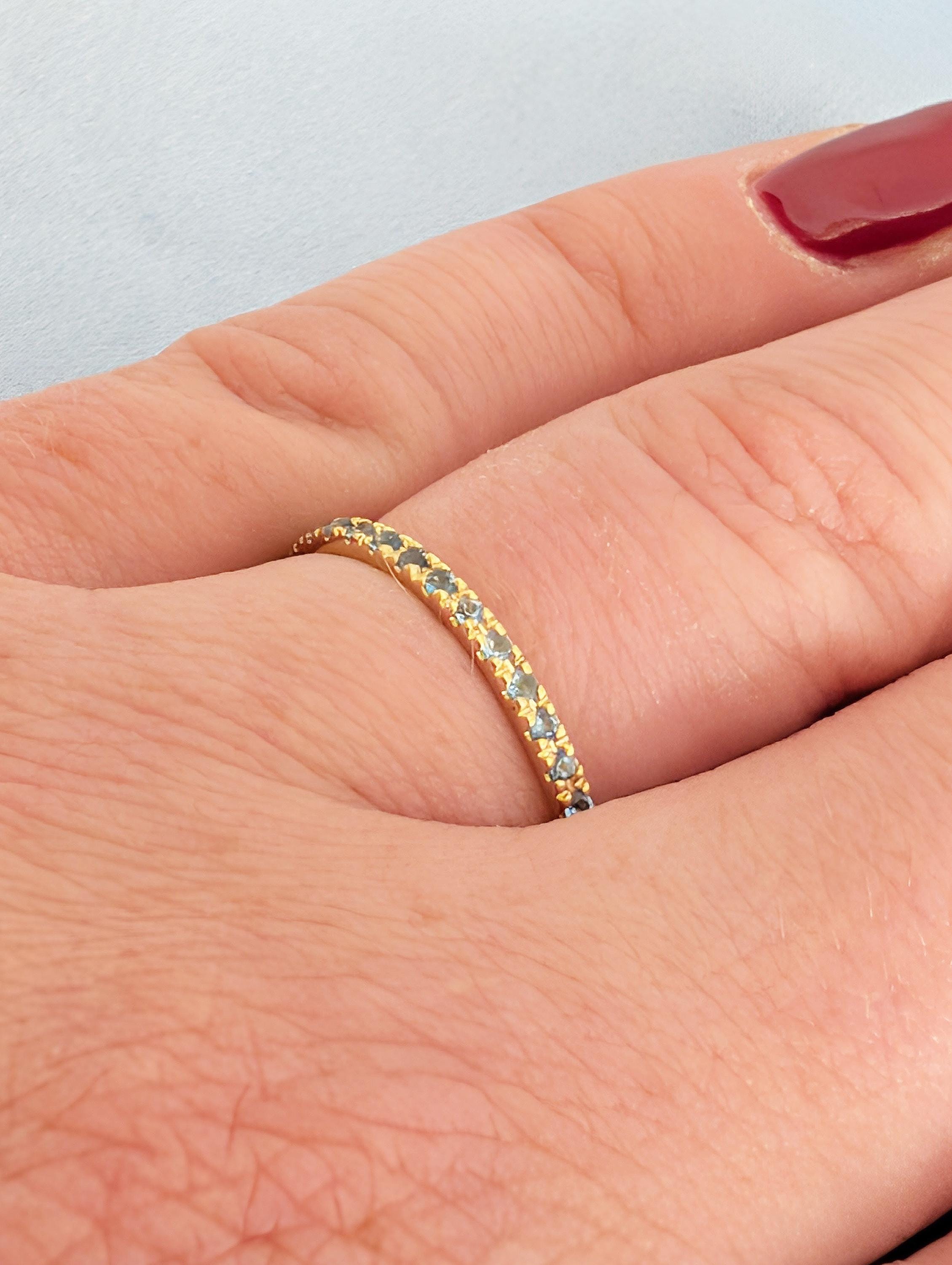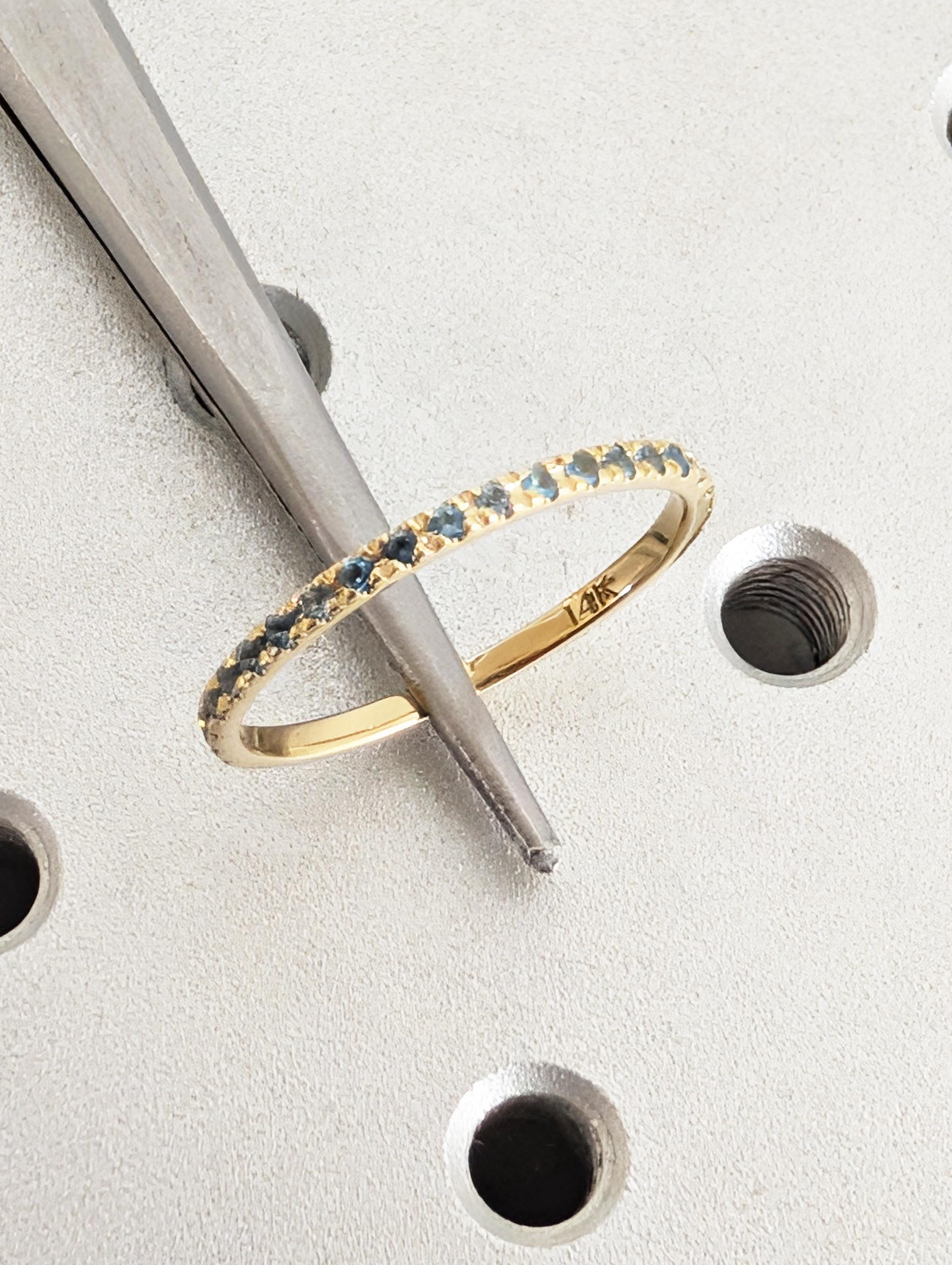This delicate wedding band features a round of Natural Blue Topaz stones that shimmer with cool, bright blue tones. Designed to sit comfortably on its own or stack perfectly with an engagement ring, the slender band has an elegant and timeless look. The blue topaz subtle sparkle and refined style make this ring a lovely everyday piece or a meaningful symbol of love and connection.