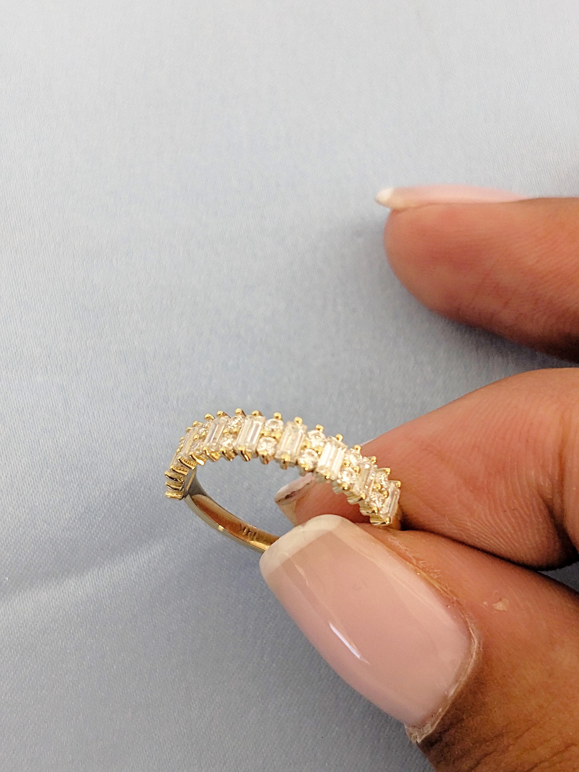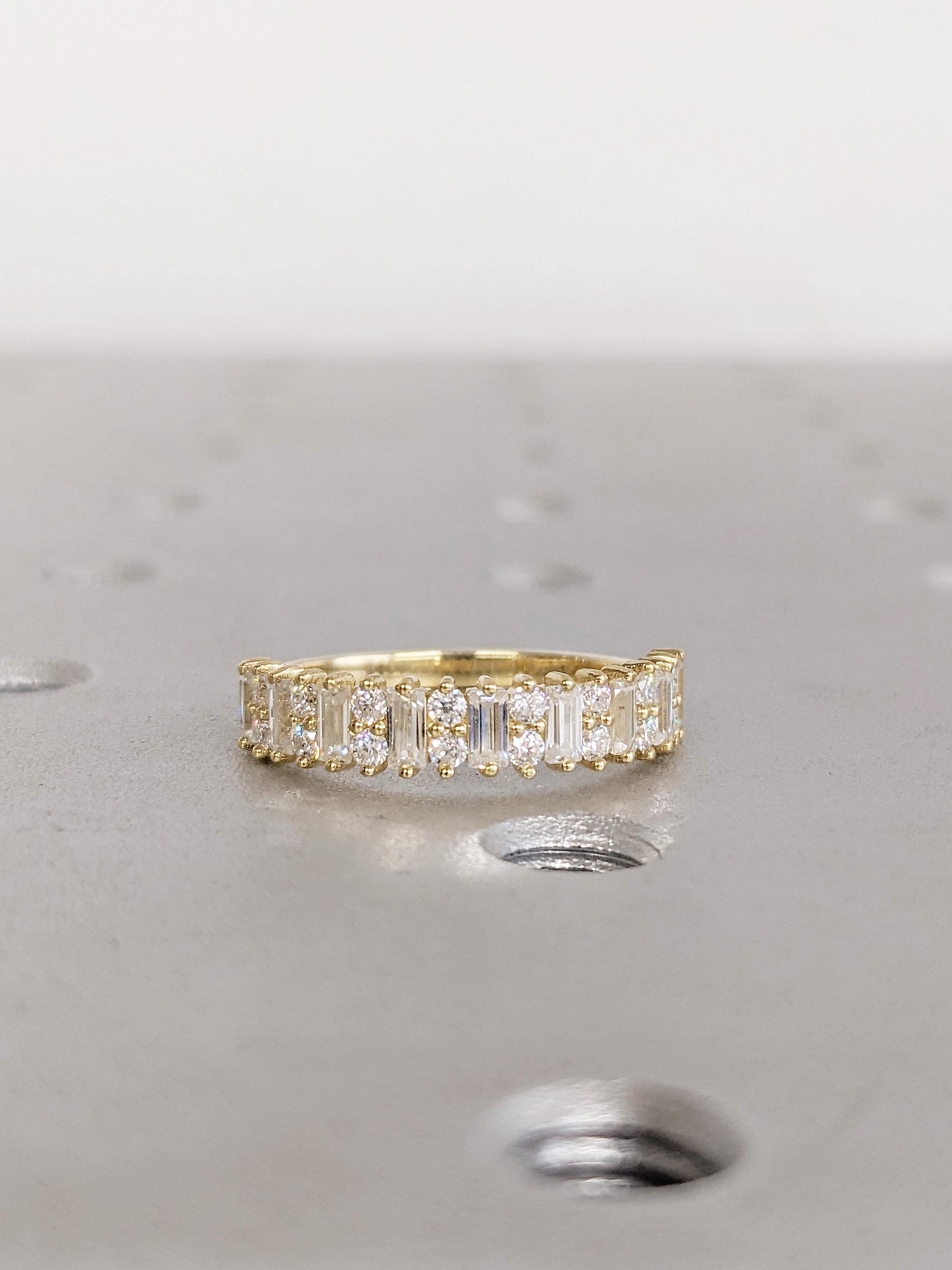 This elegant wedding band has baguette and round side stones available in Natural Diamond, Lab Grown Diamond, or Moissanite, set beautifully in prong settings. The refined design and brilliant sparkle make it perfect as a matching ring, bridal band, or anniversary gift, adding timeless elegance to every occasion.