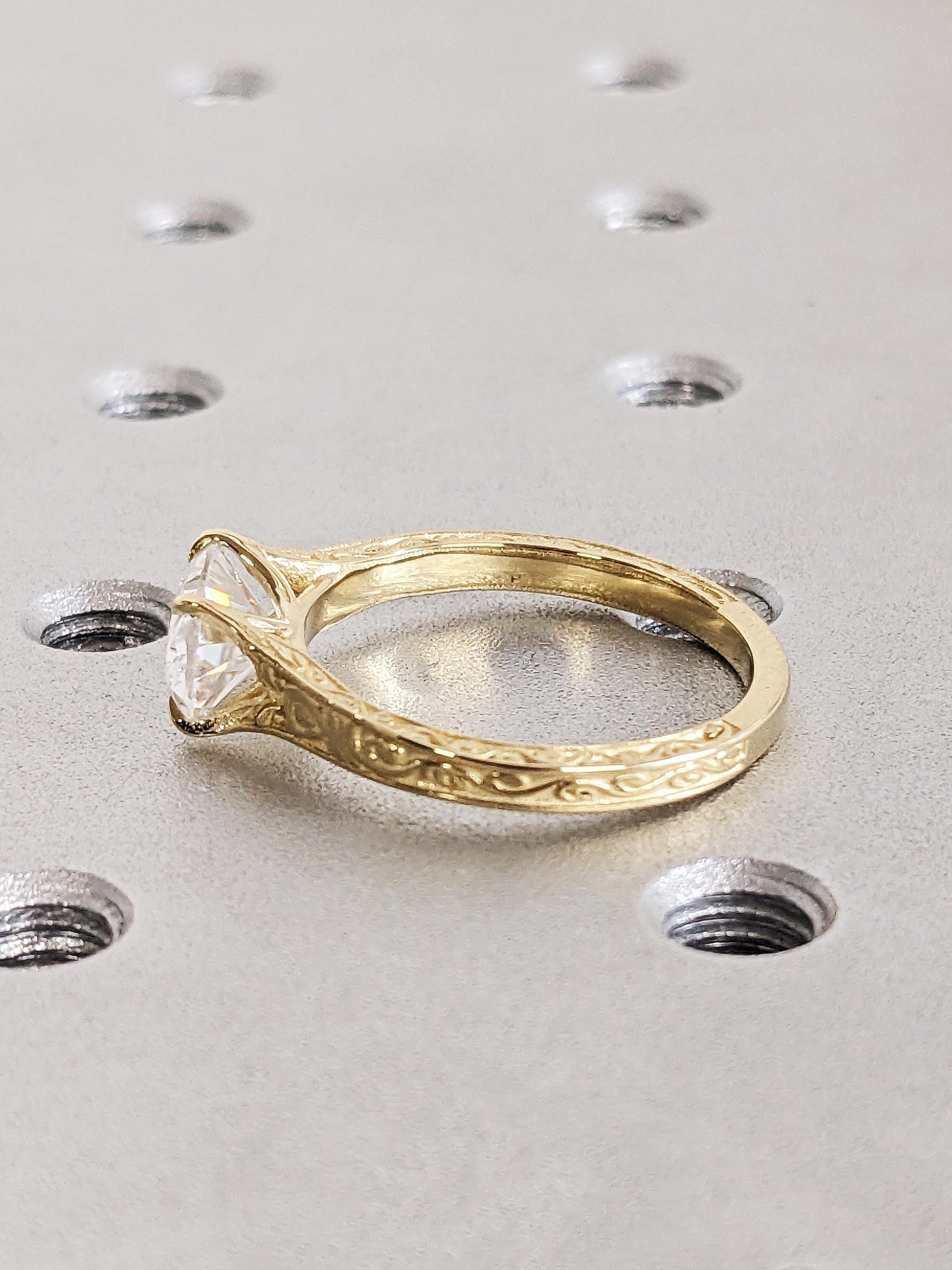This vintage engagement ring features a brilliant oval Lab Diamond set in an elegant east west setting and secured with refined talon prongs, creating a graceful silhouette. The band is adorned with intricate filigree engraving, adding depth, texture and an antique charm to the design.