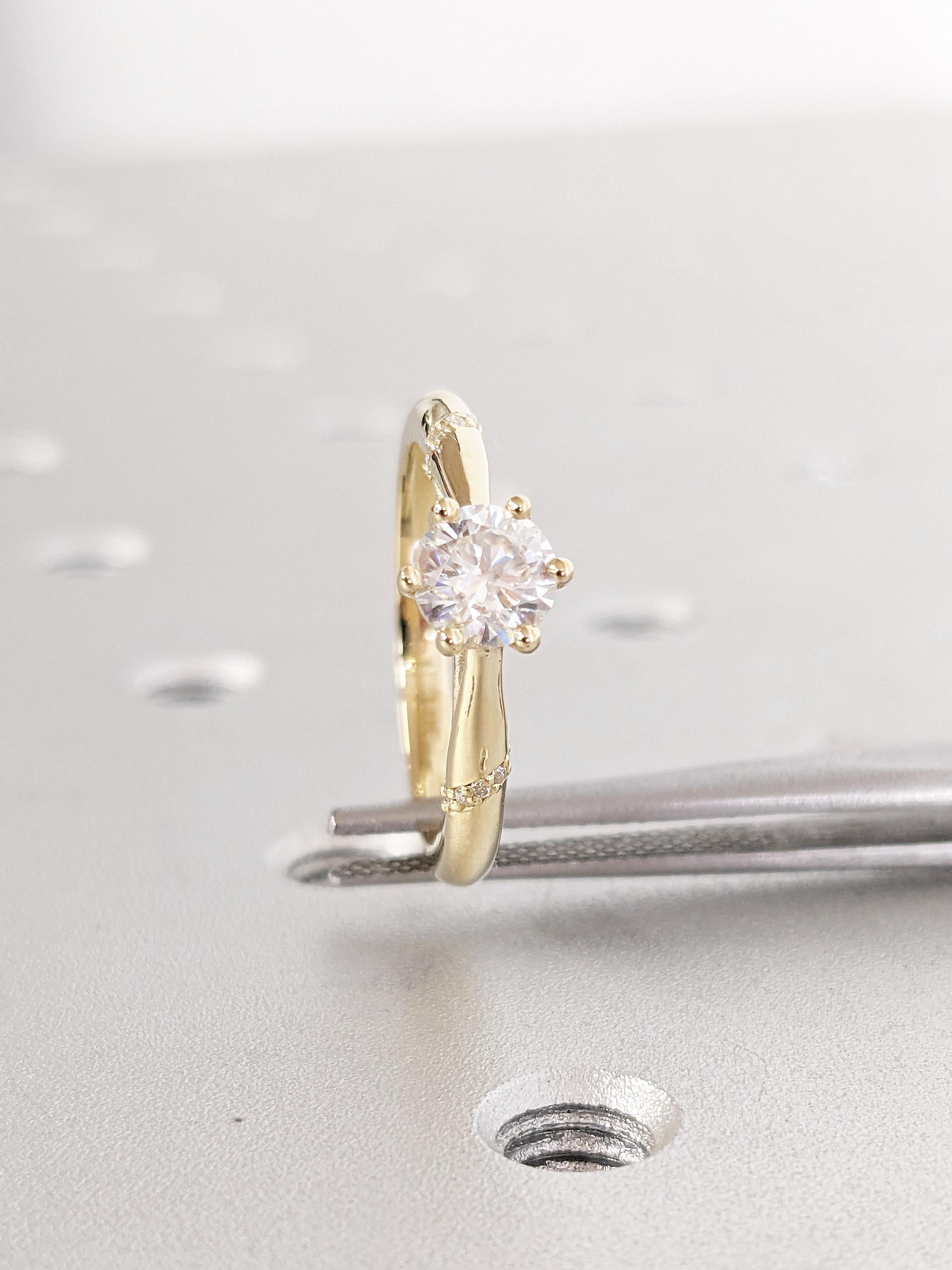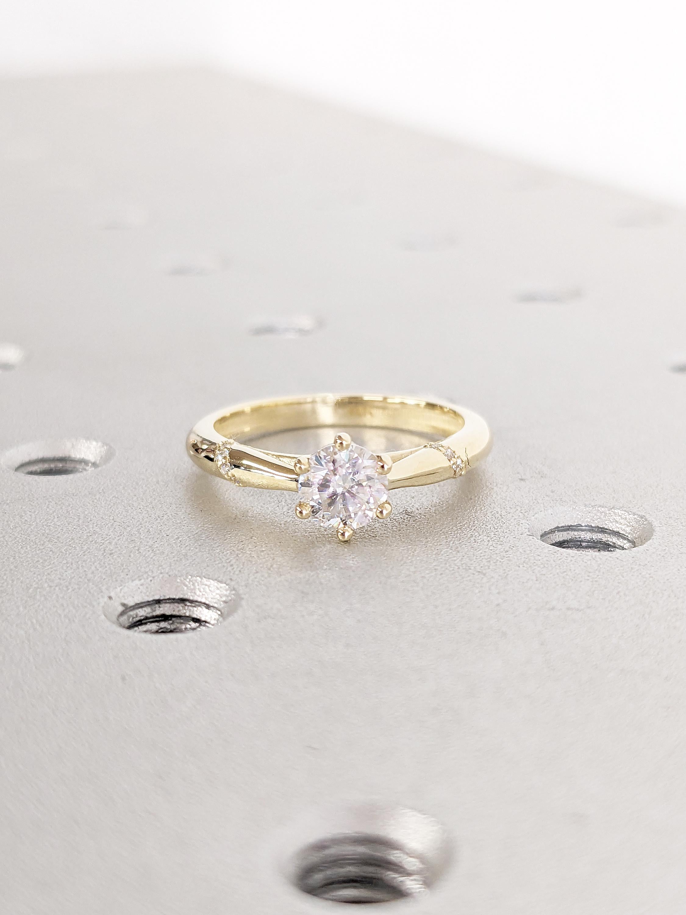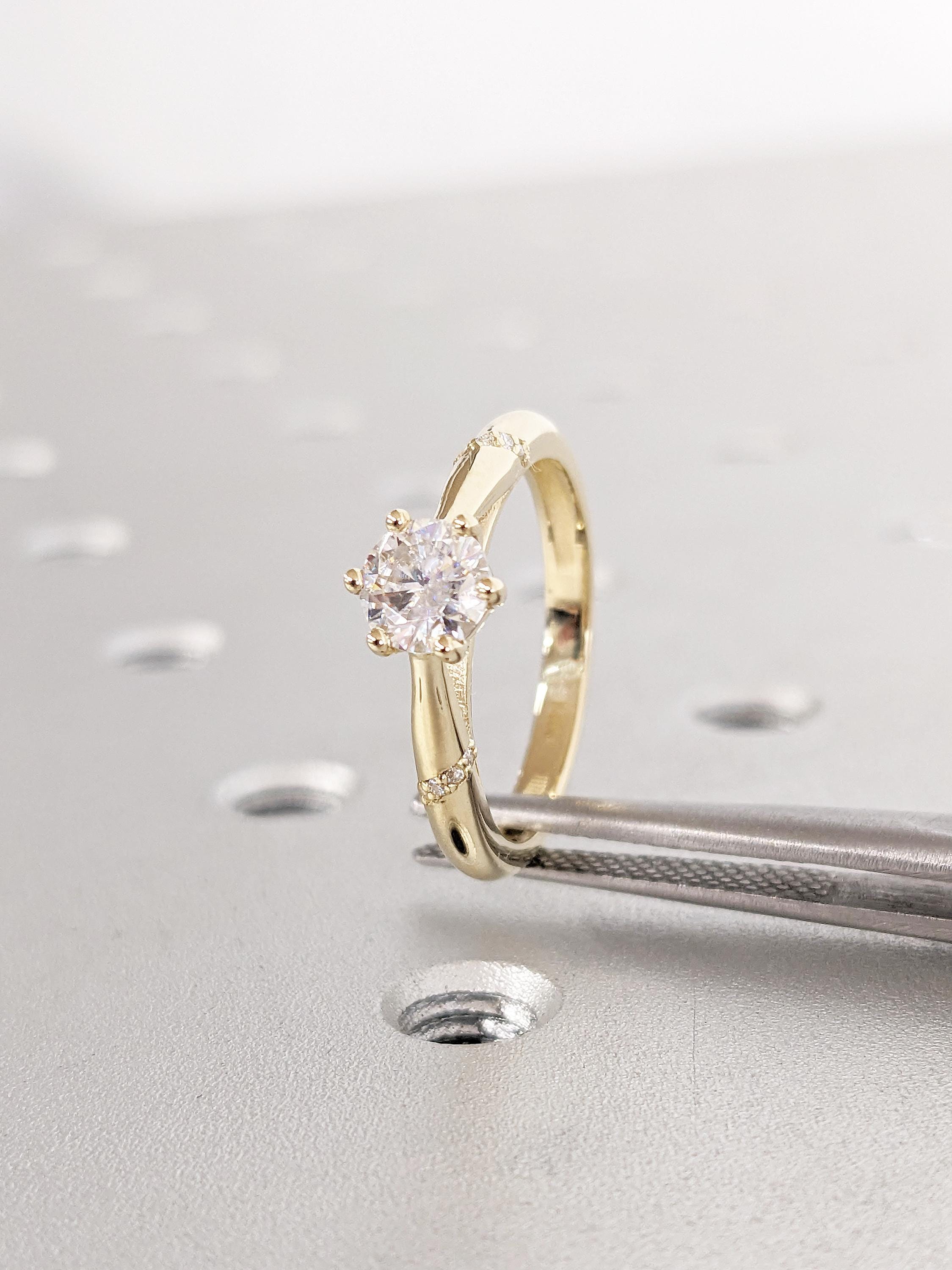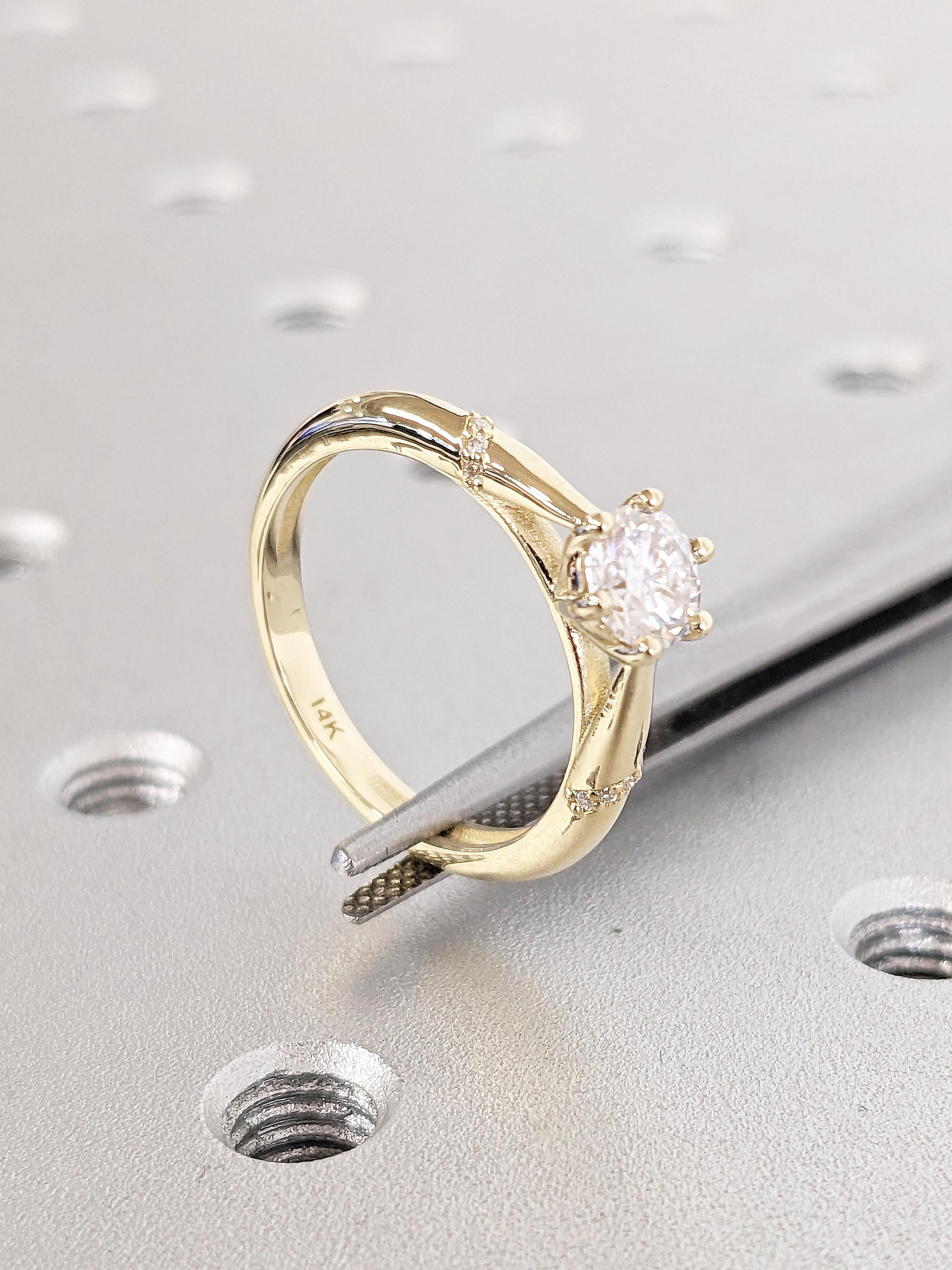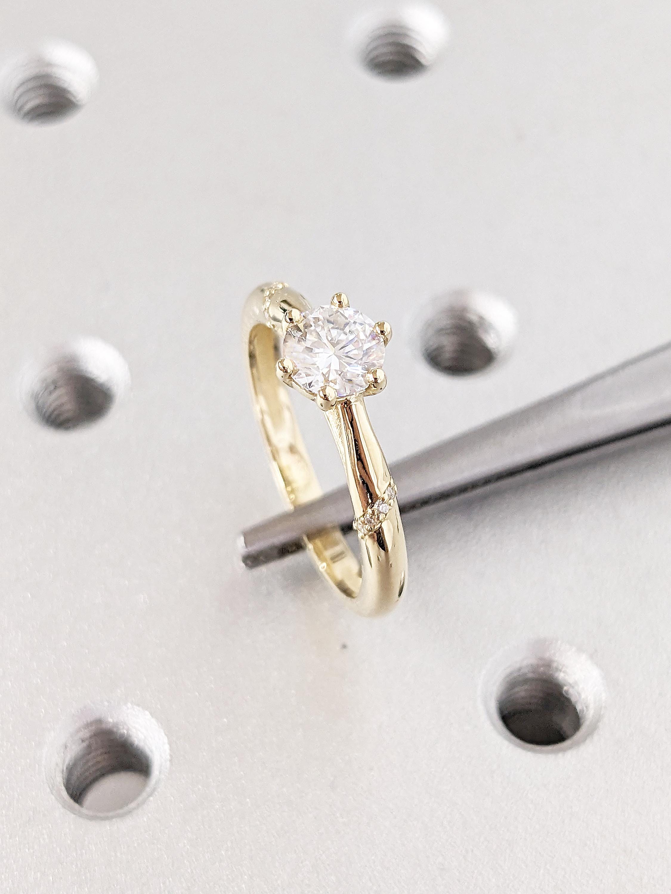This exquisite engagement ring features a dazzling round cut Moissanite center stone, elegantly set in a lustrous gold band. The delicate accents along the band can be customized with Natural Diamonds, Lab-Grown Diamonds, or Moissanites, allowing for a personalized touch of brilliance. This ring is designed with a timeless yet modern aesthetic, showcasing intricate detailing and refined craftsmanship, making it a perfect symbol of love and commitment.