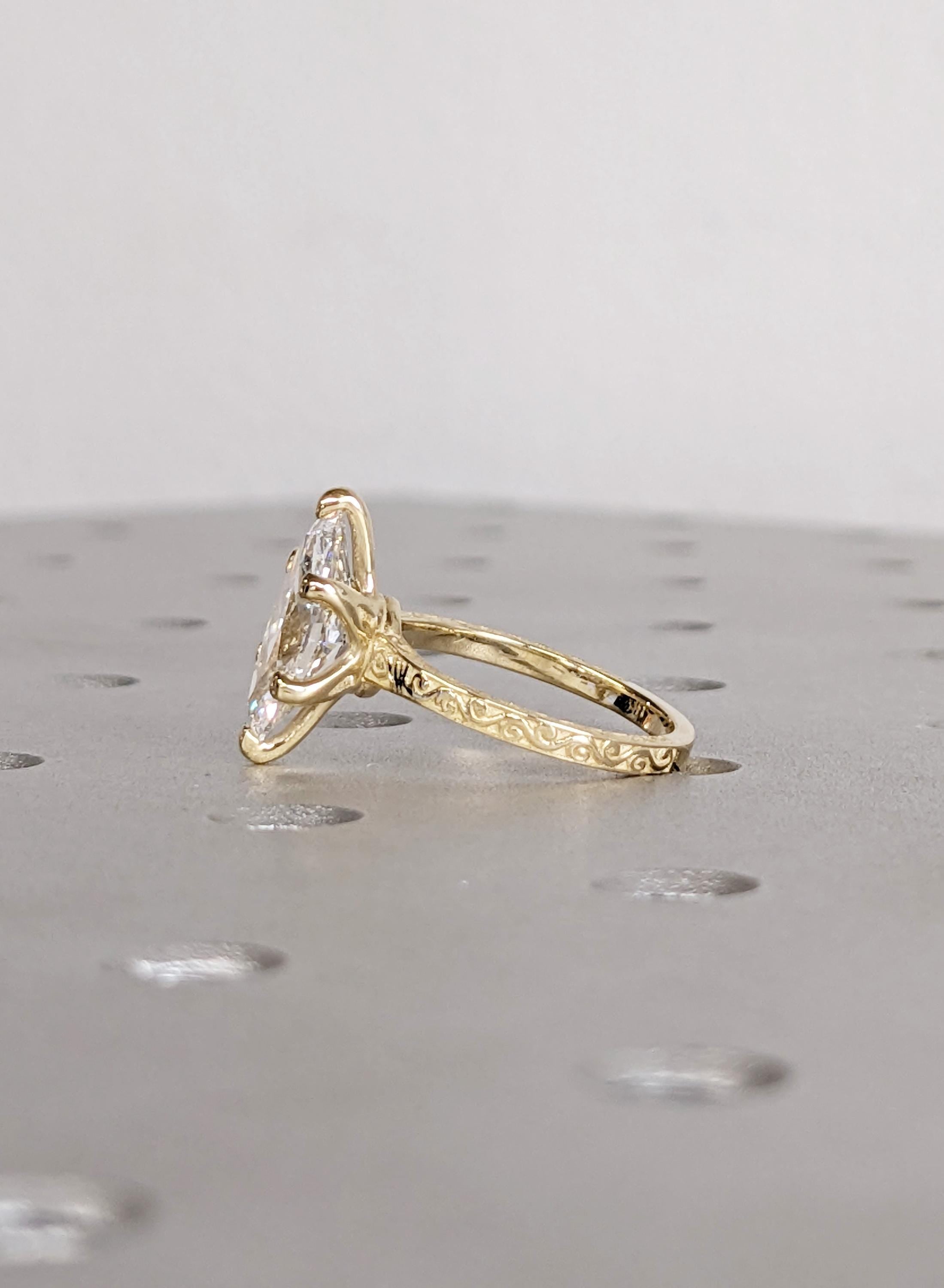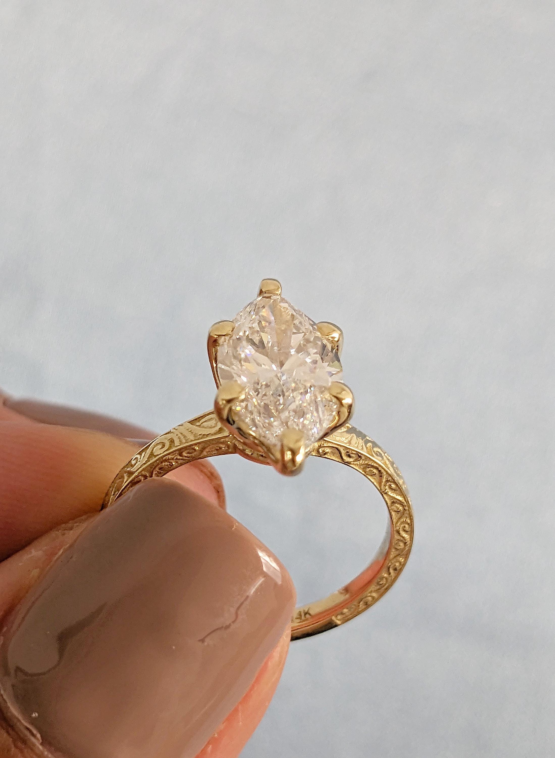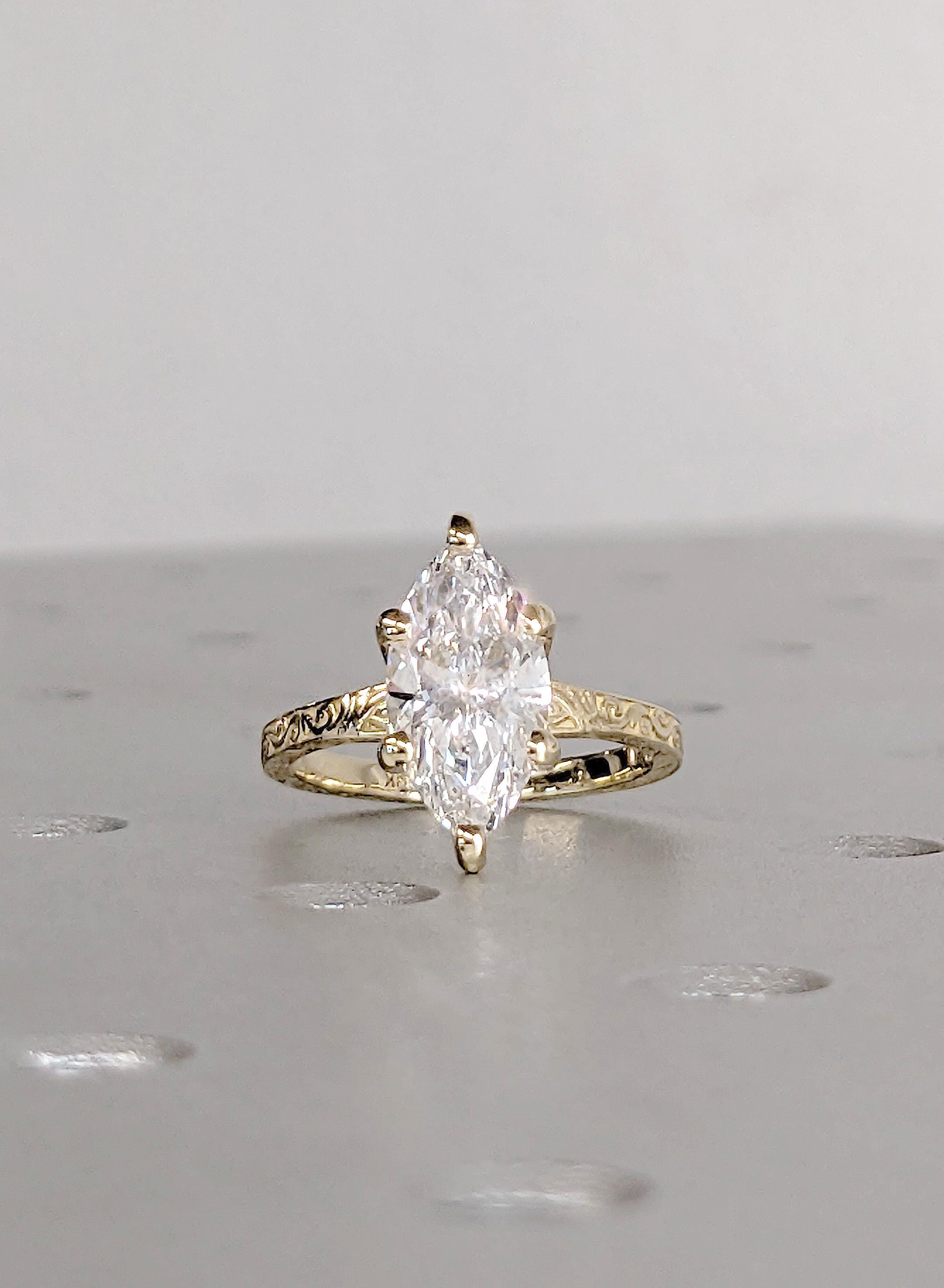 14K Yellow Gold Marquise Moissanite Ring, Filigree Engagement Ring, Vintage Style Bridal Solitaire, Wedding Anniversary Promise Ring For Her