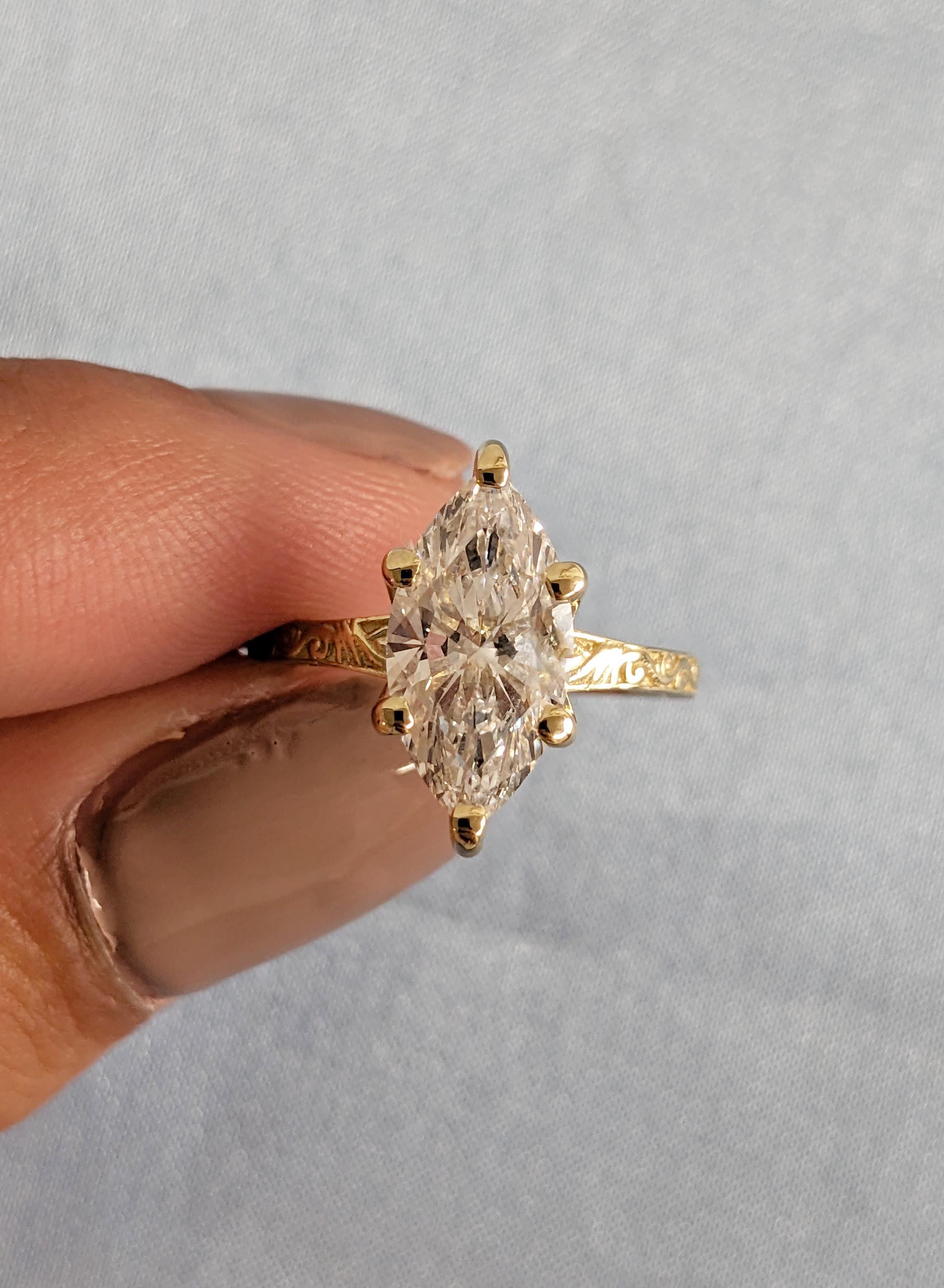 This Moissanite marquise cut engagement ring is set in a prong setting and finished with delicate filigree detail along the band. The long shape reflects light softly, while the vintage-inspired pattern adds quiet character. Balanced and elegant, it makes a thoughtful choice for engagements, anniversaries, or a meaningful gift meant to be worn and loved every day.