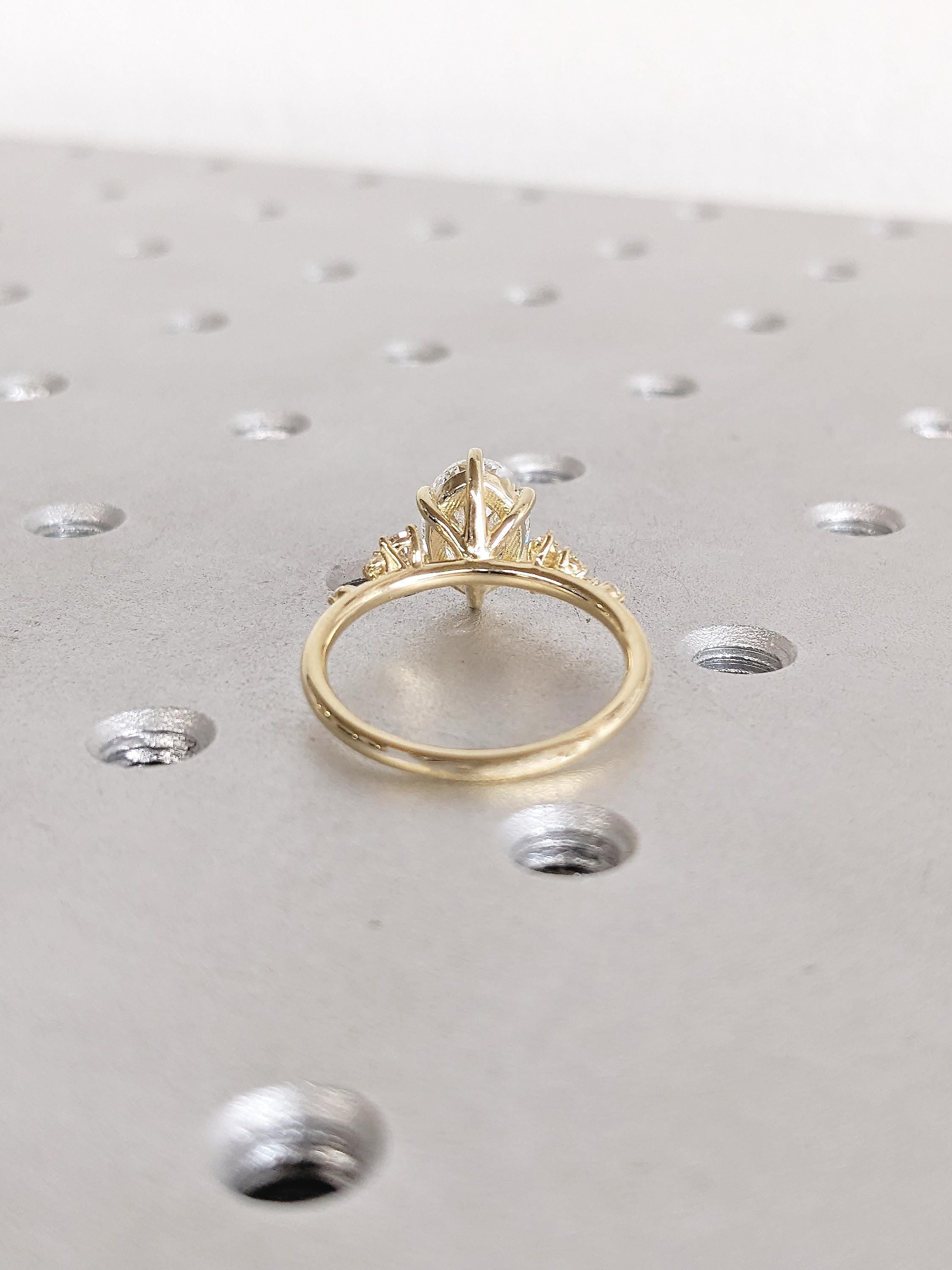 Celebrate the next chapter of your life with our elegantly designed engagement ring, showcasing an oval cut Moissanite center stone in prong setting. Adorned by a cluster of exquisite Natural Diamonds, Lab Grown Diamonds or Moissanites that glisten like freshly fallen snow, this meticulously handcrafted ring is the perfect symbol of your everlasting love.
