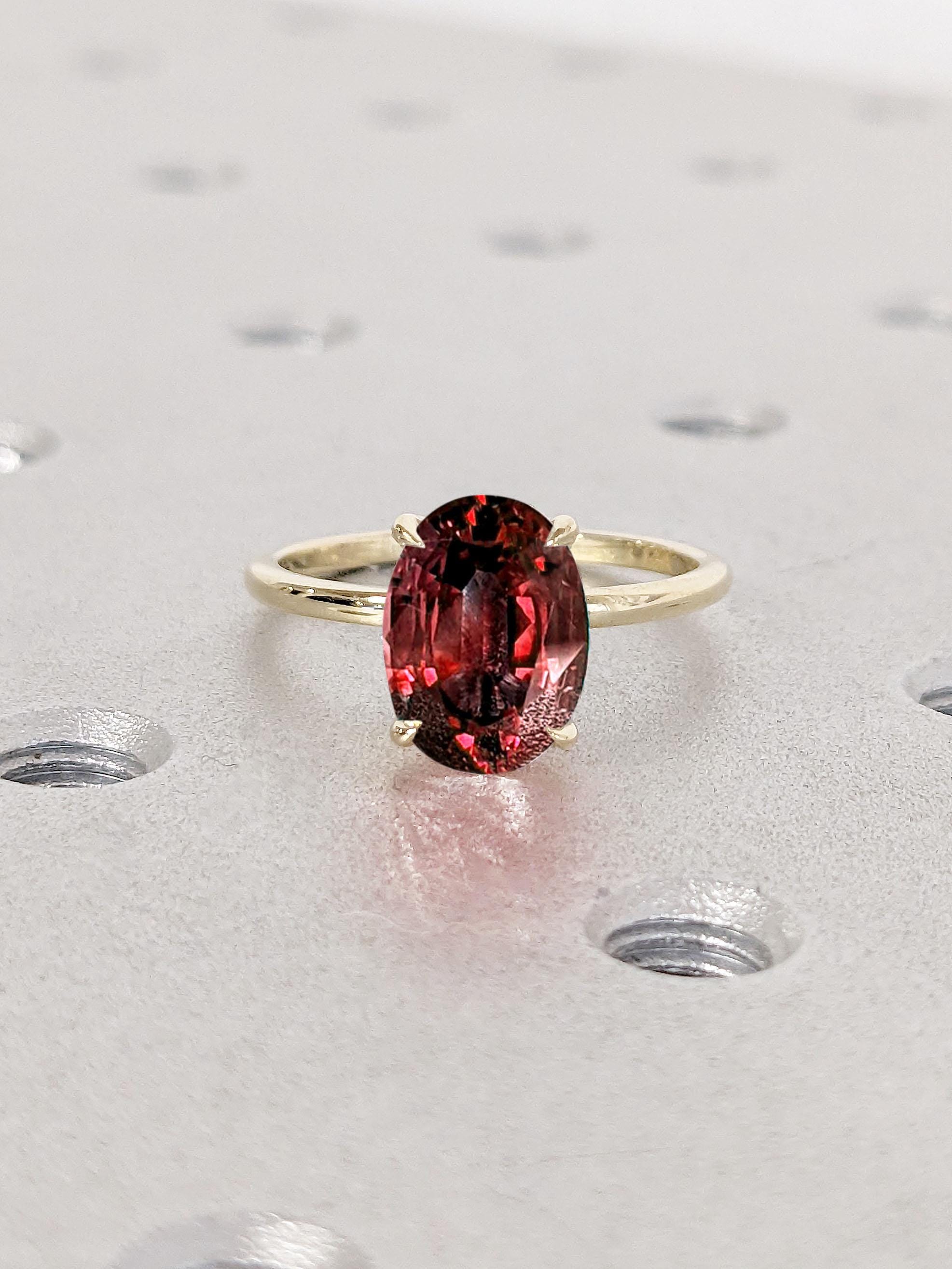 A timeless solitaire ring, features an oval cut Lab Ruby center stone, elegantly held on a tulip style open basket with talon prong setting, on a delicate thin band of 1.5mm width. This minimalist nature inspired jewelry, makes a great gift for engagement, wedding anniversary or birthday.