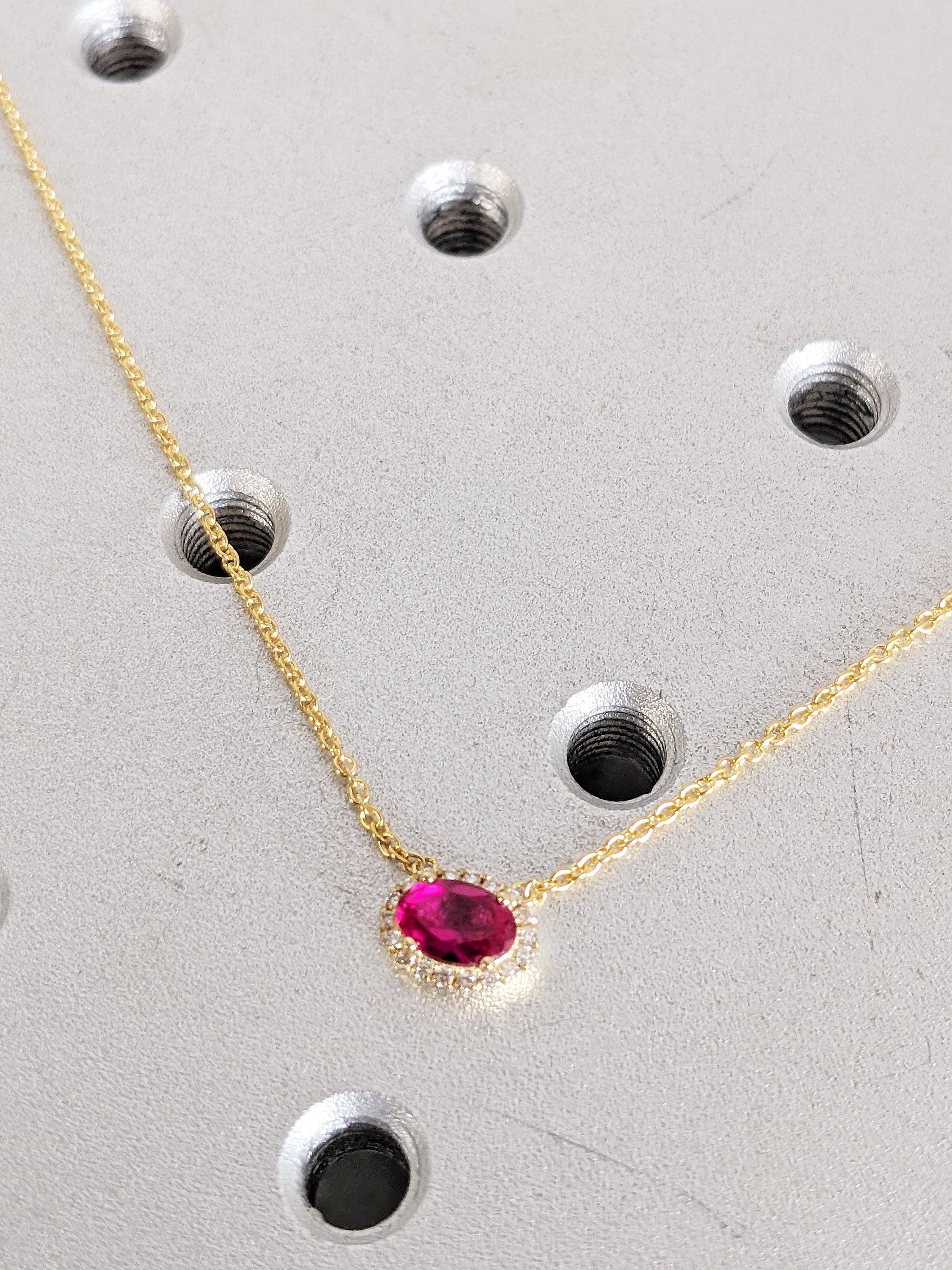 This Oval Cut Lab Ruby necklace is set in a secure prong setting and surrounded by Lab Grown Diamond, Natural Diamond, or Moissanite side stones in round cuts arranged in a delicate pave halo. Its brilliant red hue and refined sparkle make it an ideal choice for weddings, anniversaries, birthdays, or elegant everyday wear.