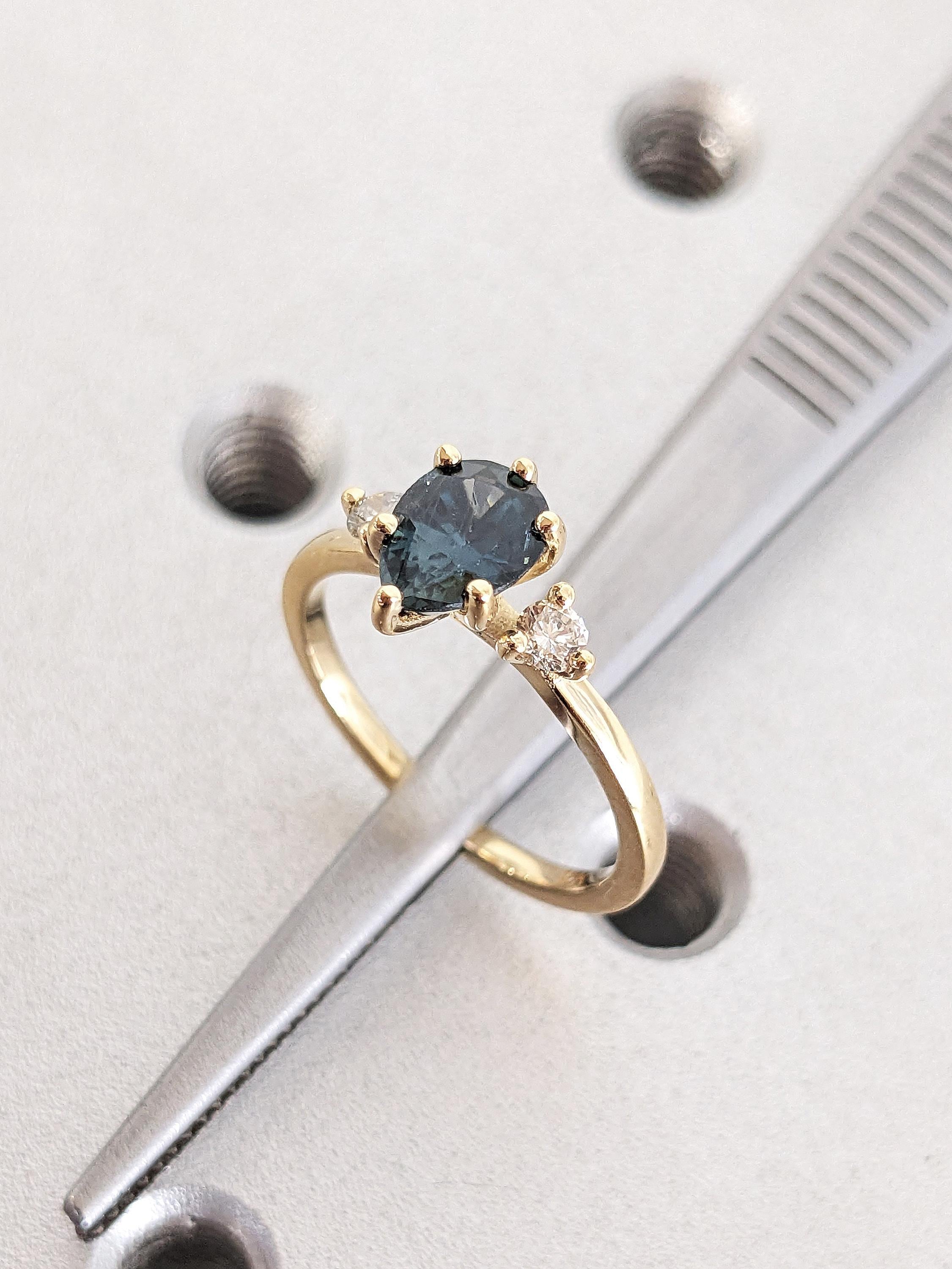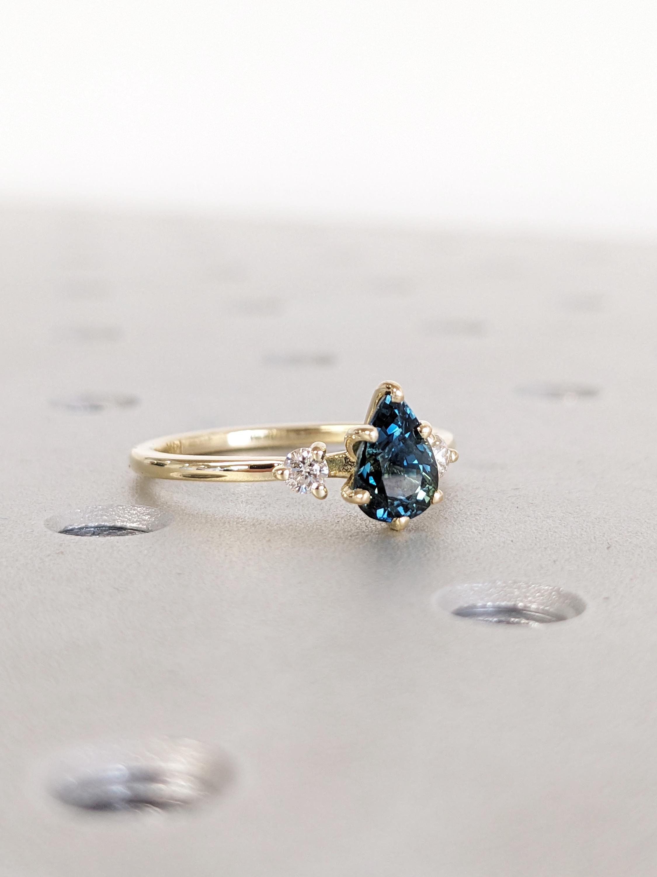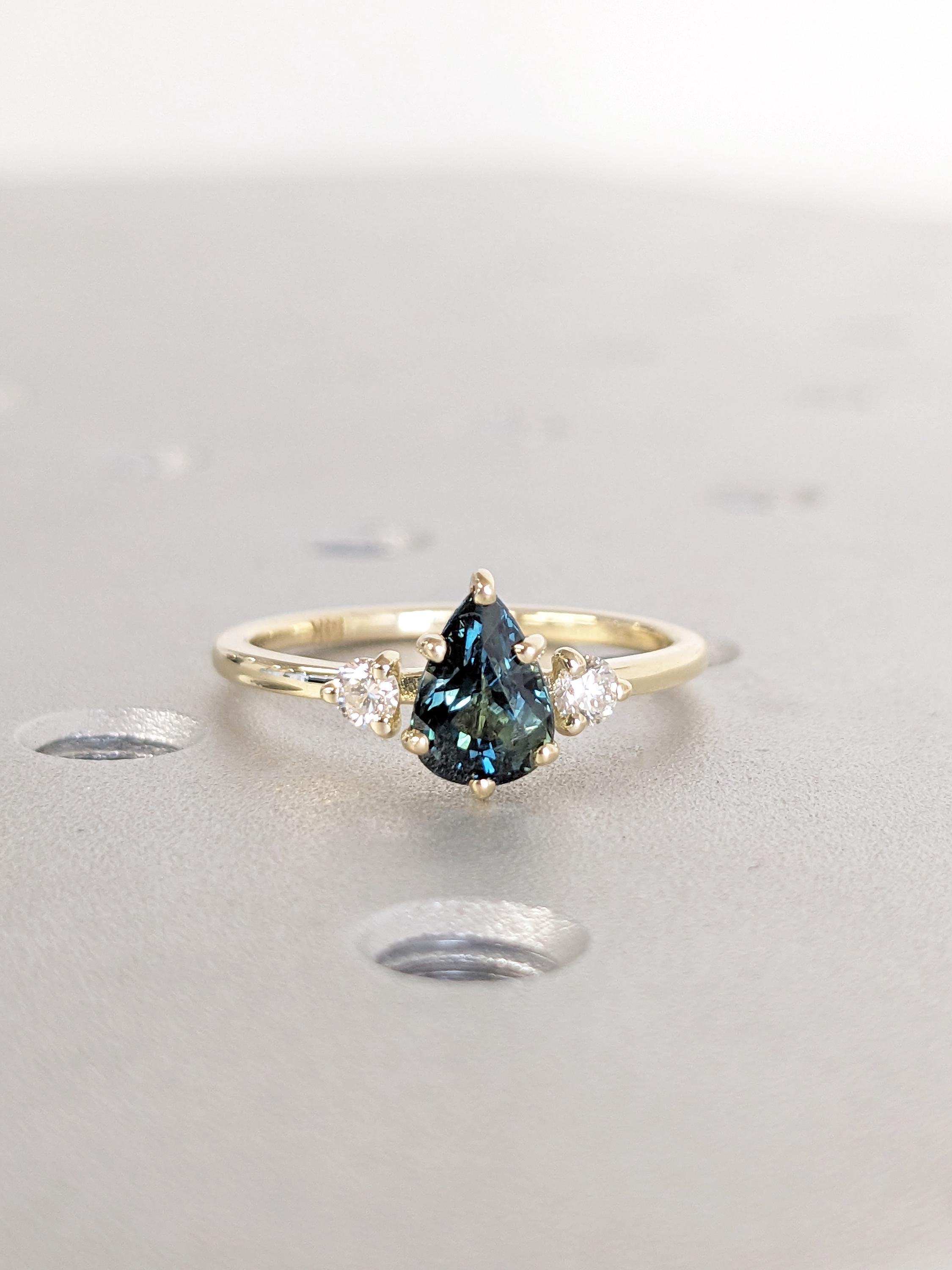14K Yellow Gold Pear Peacock Sapphire Ring, Art Deco Teal Sapphire Engagement Ring, Three Stone Wedding Ring, Custom Gold Vintage Ring
