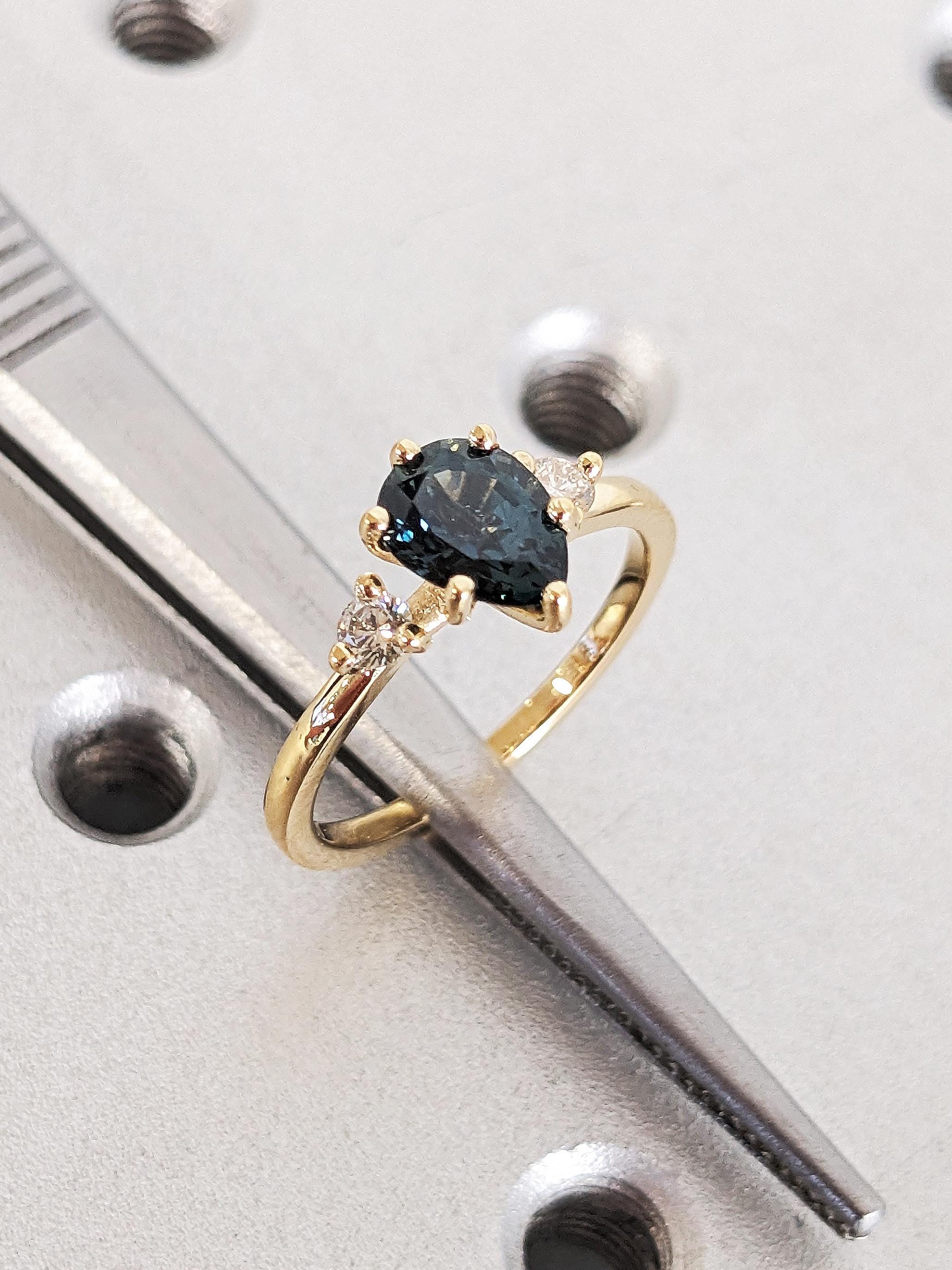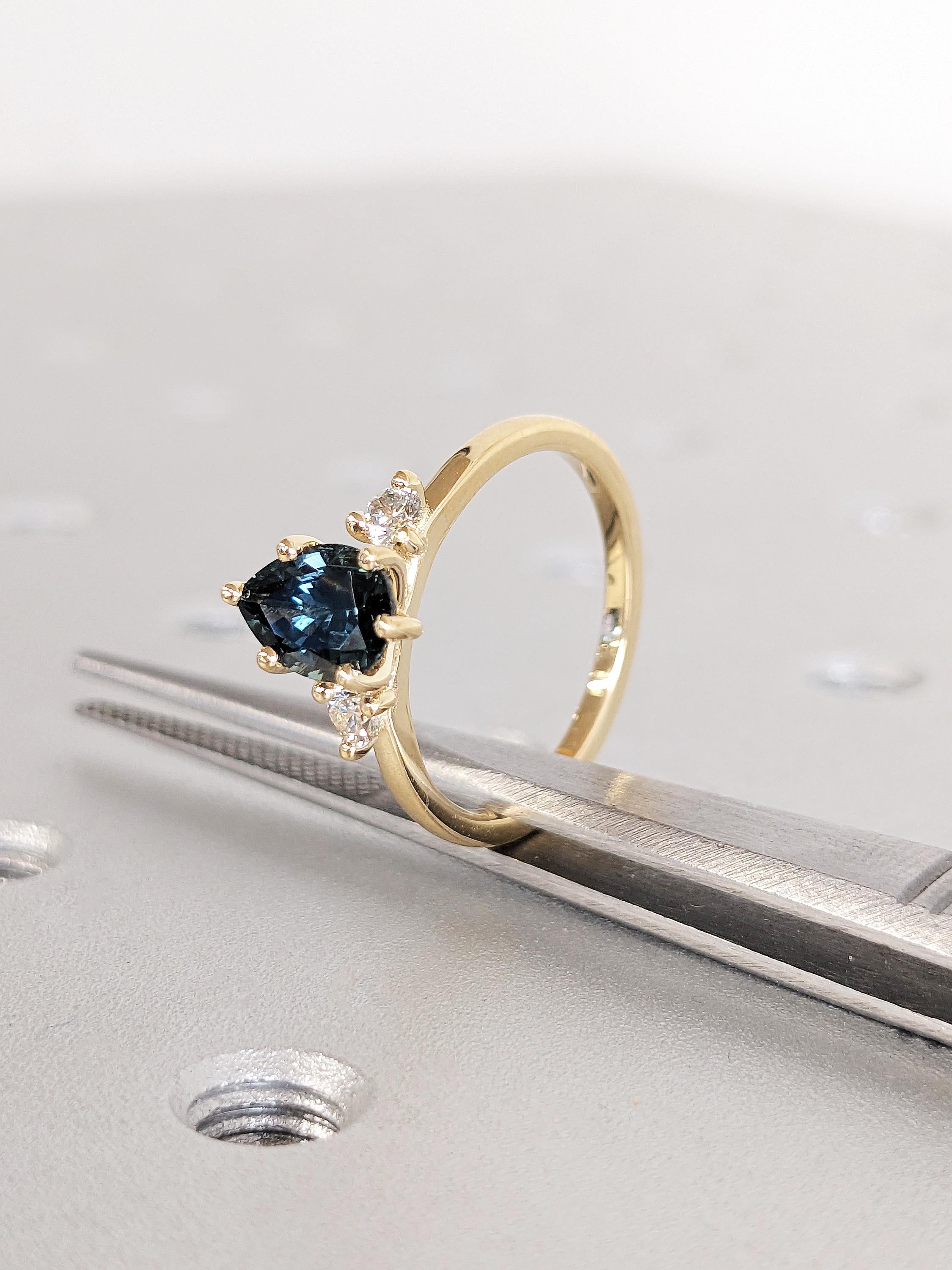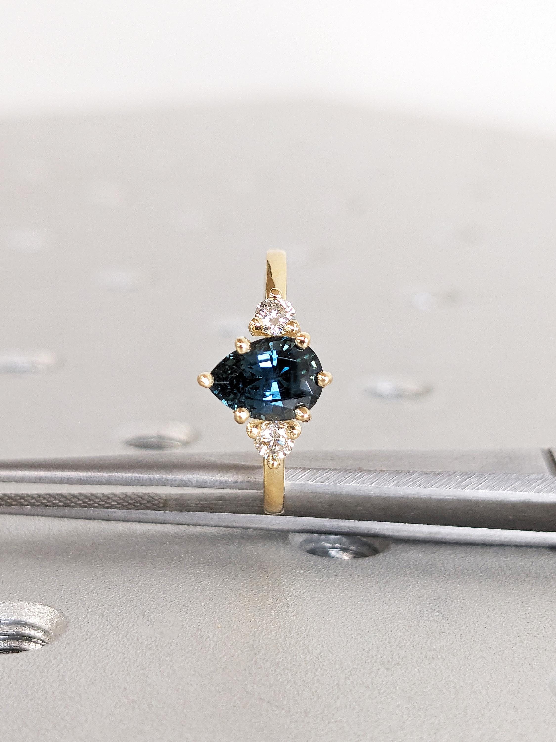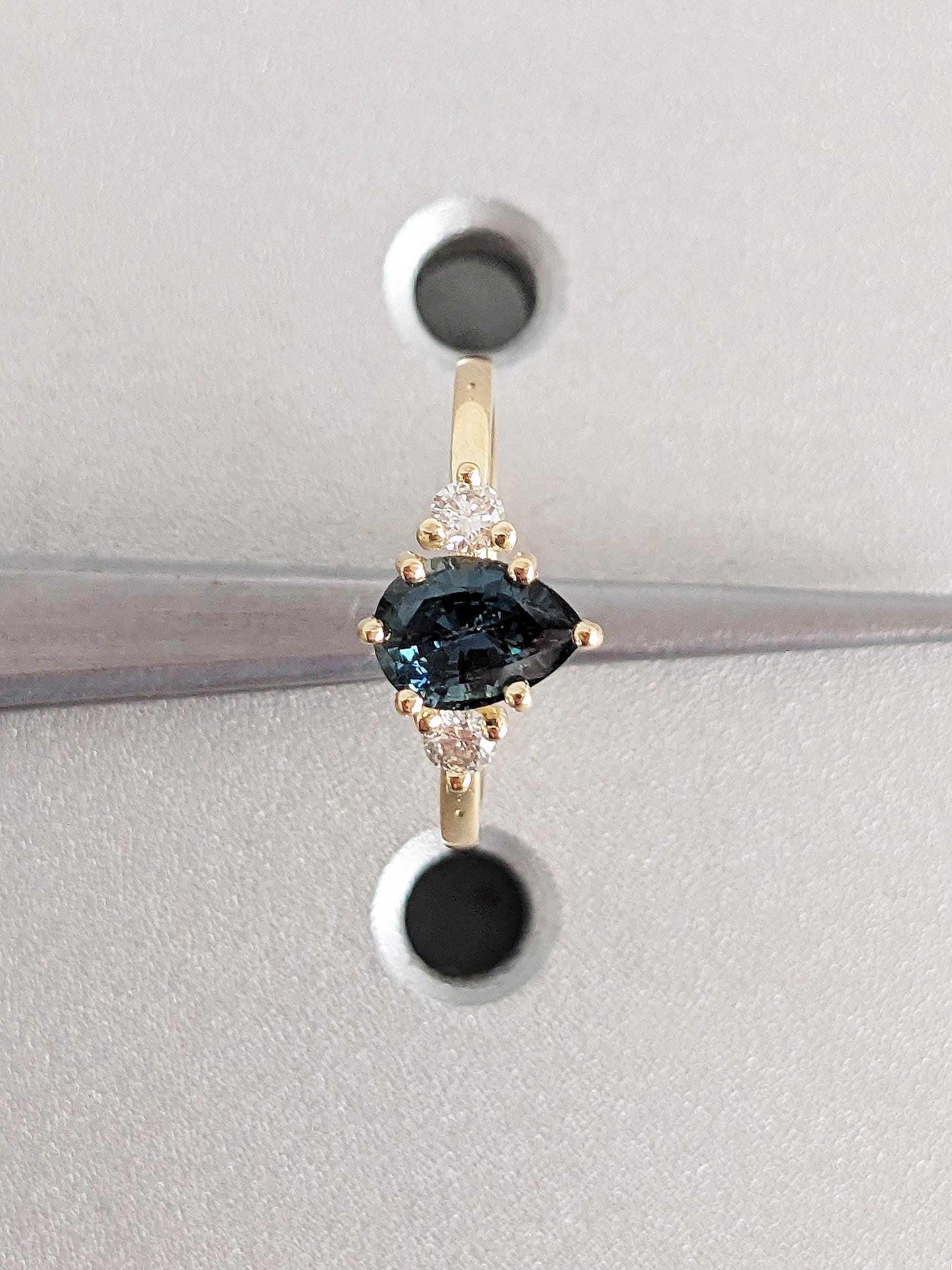 14K Yellow Gold Pear Peacock Sapphire Ring, Art Deco Teal Sapphire Engagement Ring, Three Stone Wedding Ring, Custom Gold Vintage Ring