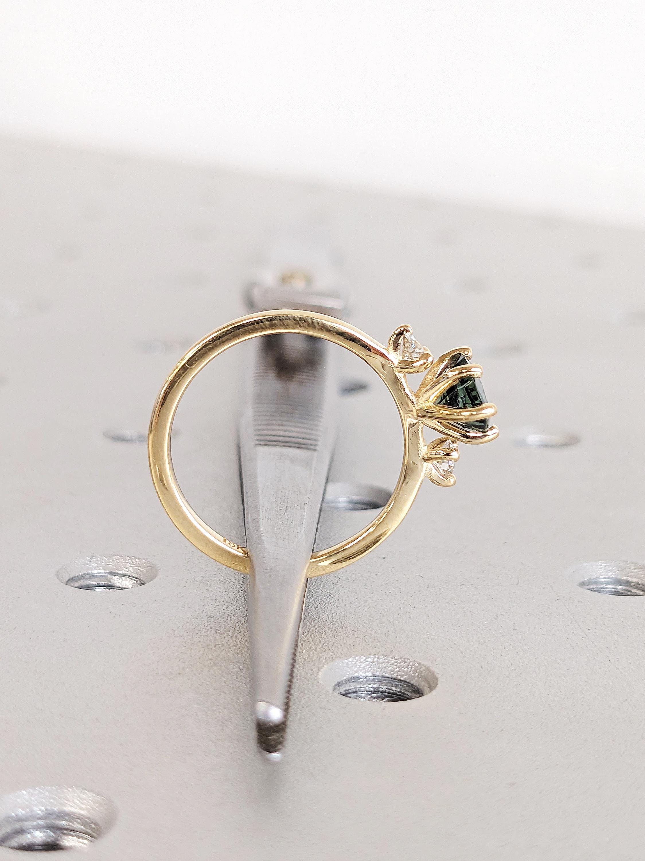 Declare your love with this sophisticated engagement ring, featuring three stones artfully cradled by intertwined prongs. The star of the show is the center Peacock Sapphire, radiating a captivating green-blue hue, surrounded by Natural Diamond, Lab Diamond and Moissanite accents and anchored by a slim band for a modern and timeless expression of commitment.