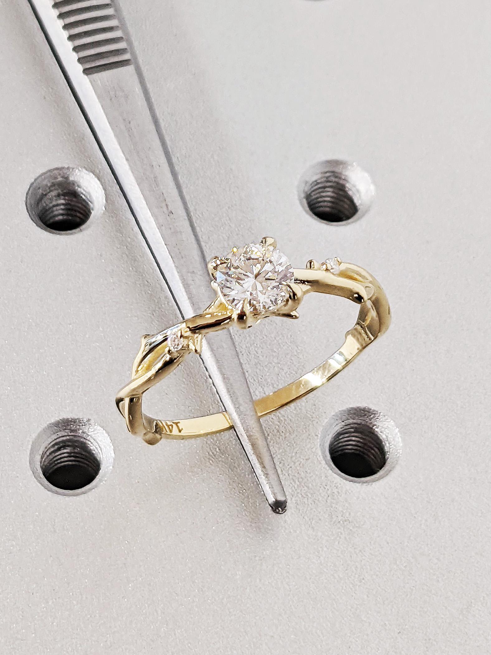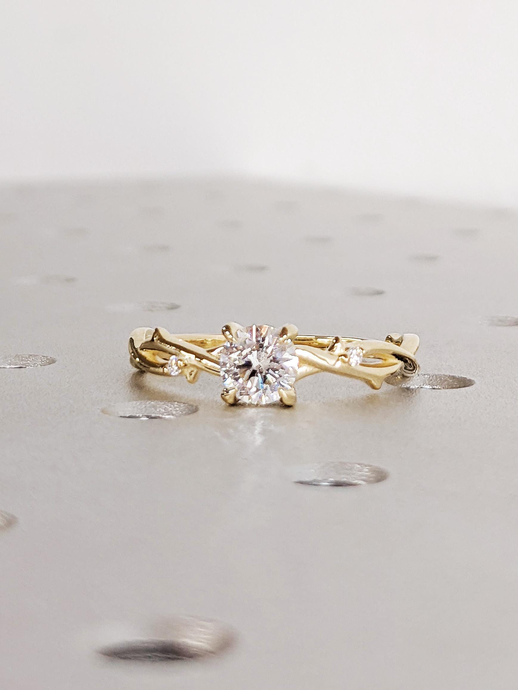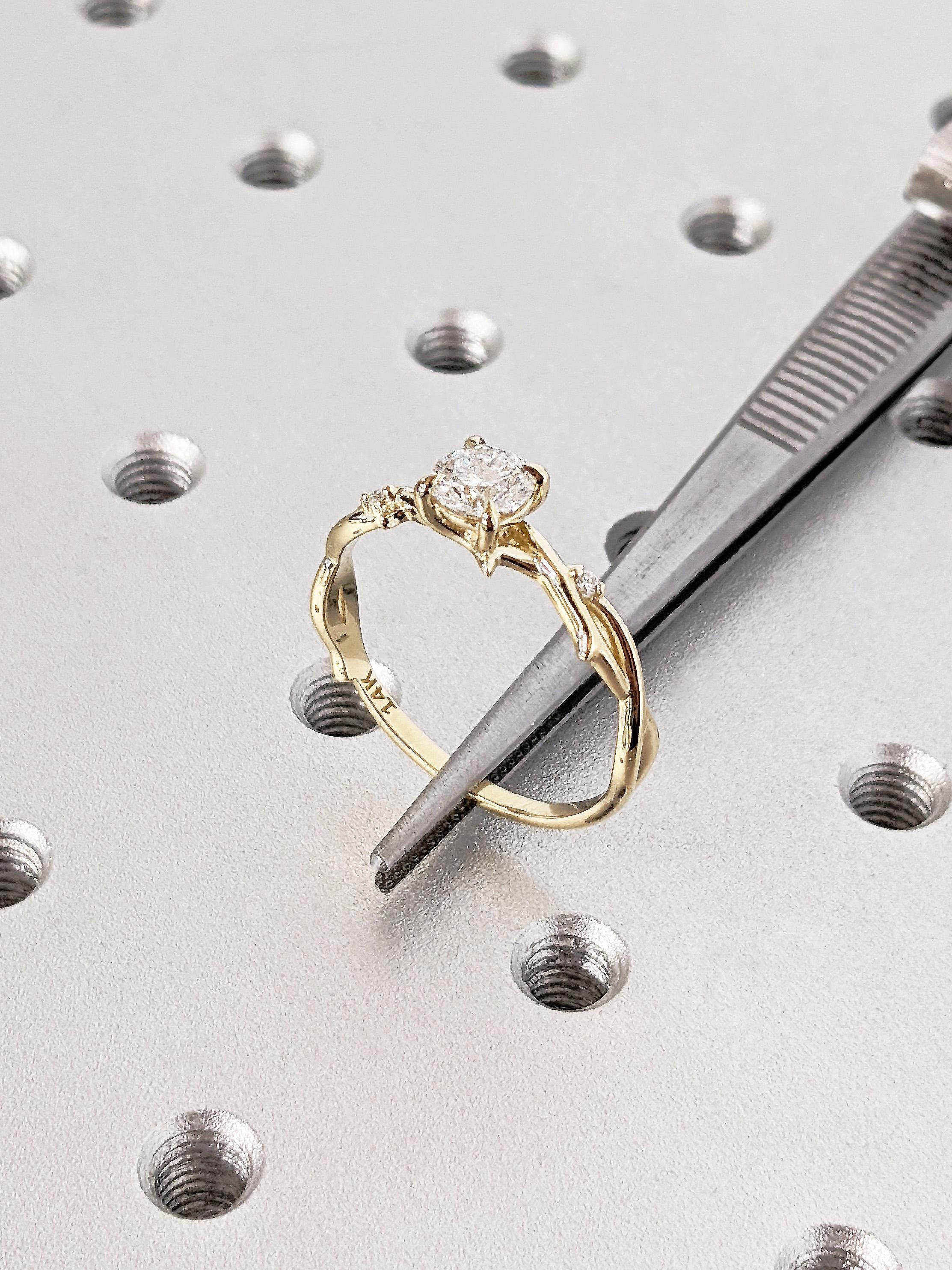 14K Yellow Gold Round Lab Diamond Engagement Ring, Claw Prong Diamond Bridal Ring, Dainty Whimsical Twisted Vine Wedding Ring, Nature Ring