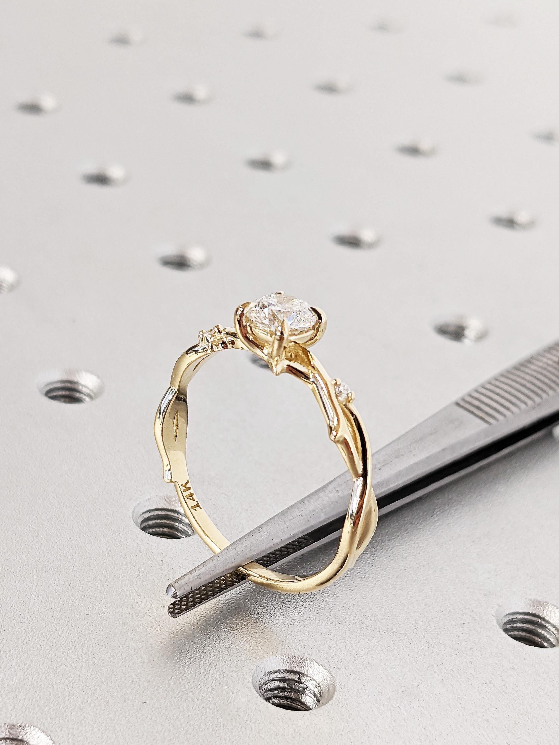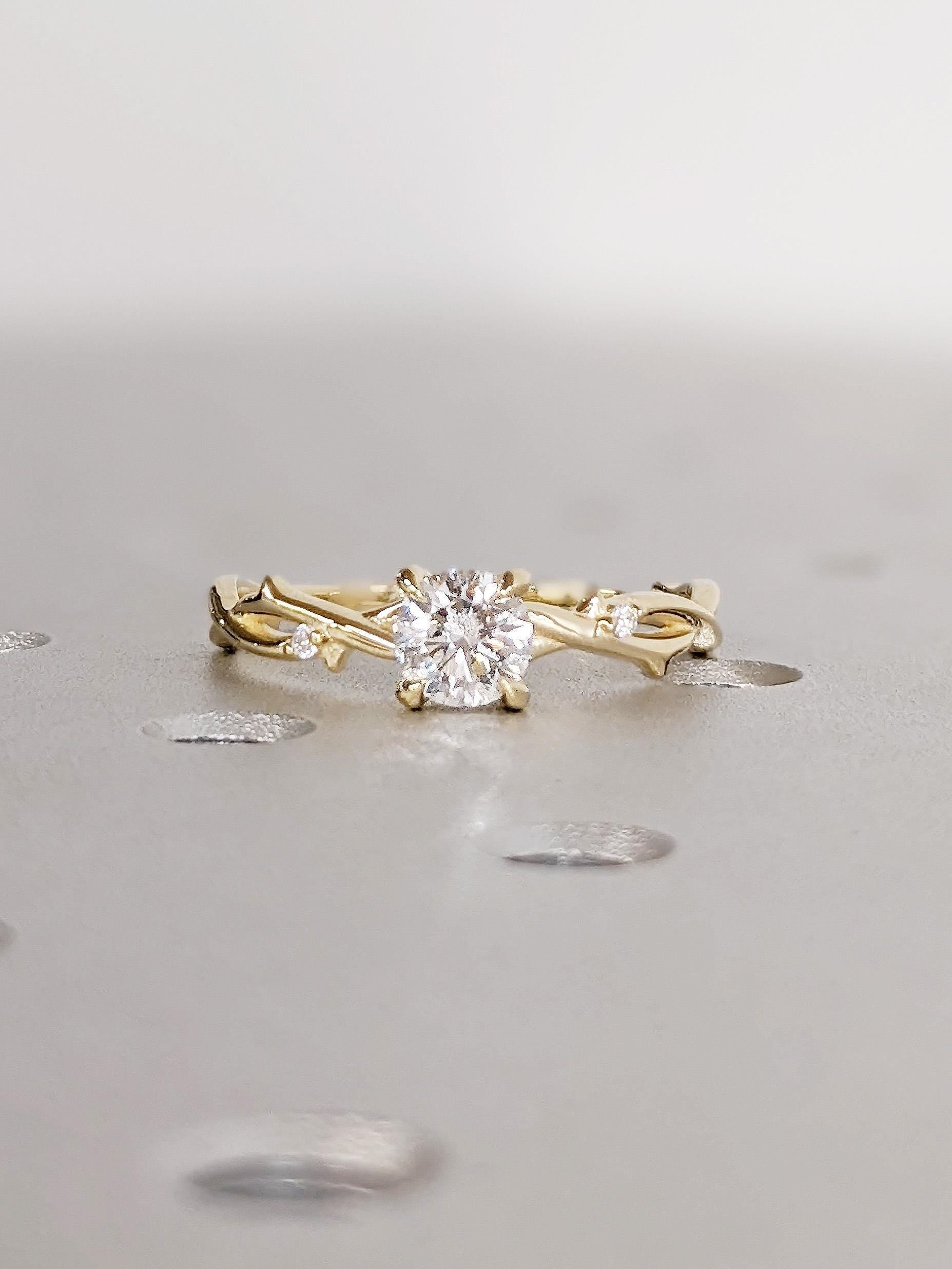 14K Yellow Gold Round Moissanite Engagement Ring, Vintage Claw Prong Diamond Bridal Ring, Whimsical Twisted Vine Wedding Ring, Nature Ring