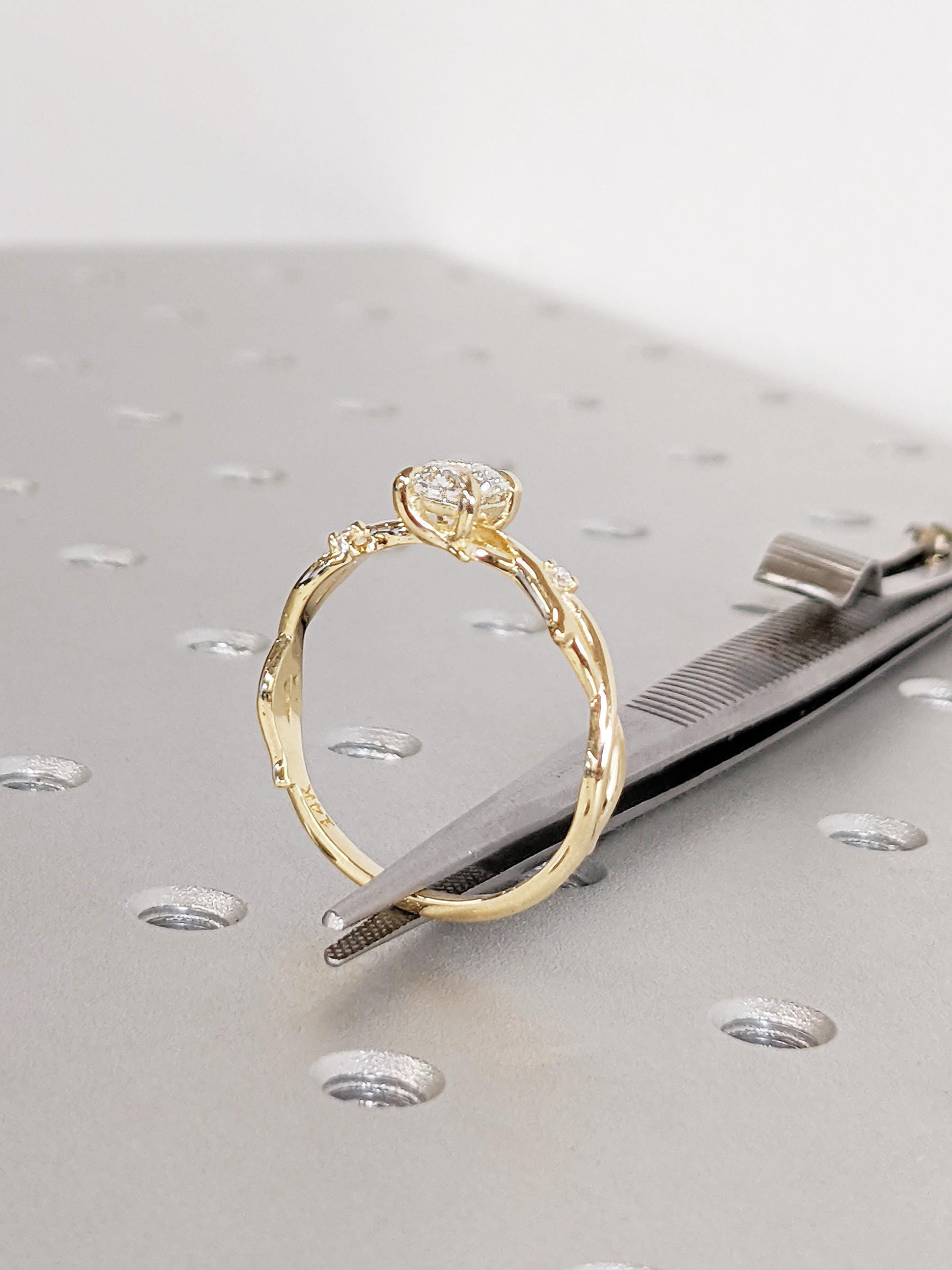 Delicate and enchanting, this round Moissanite engagement ring features a claw prong setting that highlights the brilliance of the center stone. The twisted vine band adds a whimsical and organic touch, making it perfect for those who appreciate nature. This ring blends timeless beauty with a hint of playful charm.