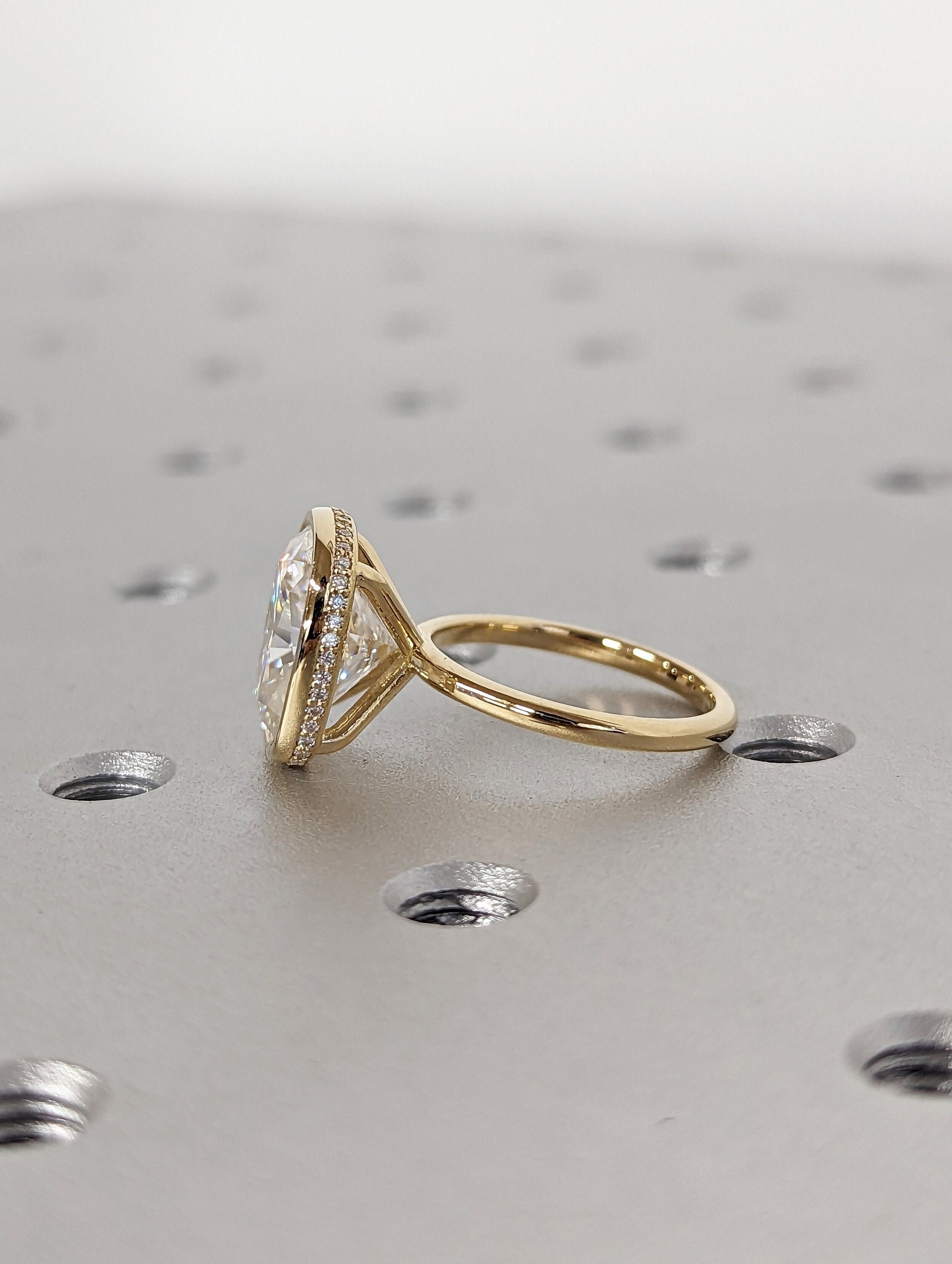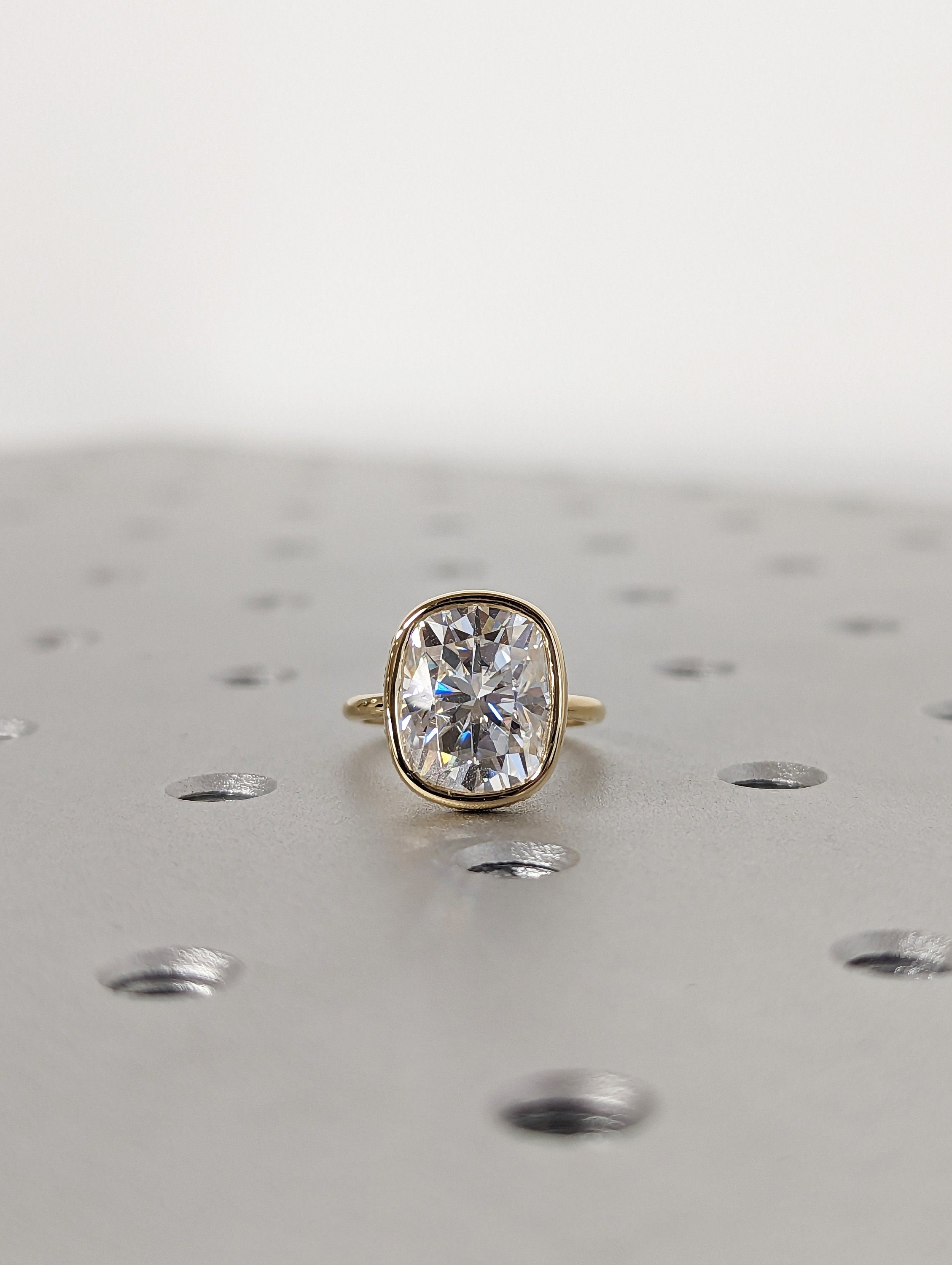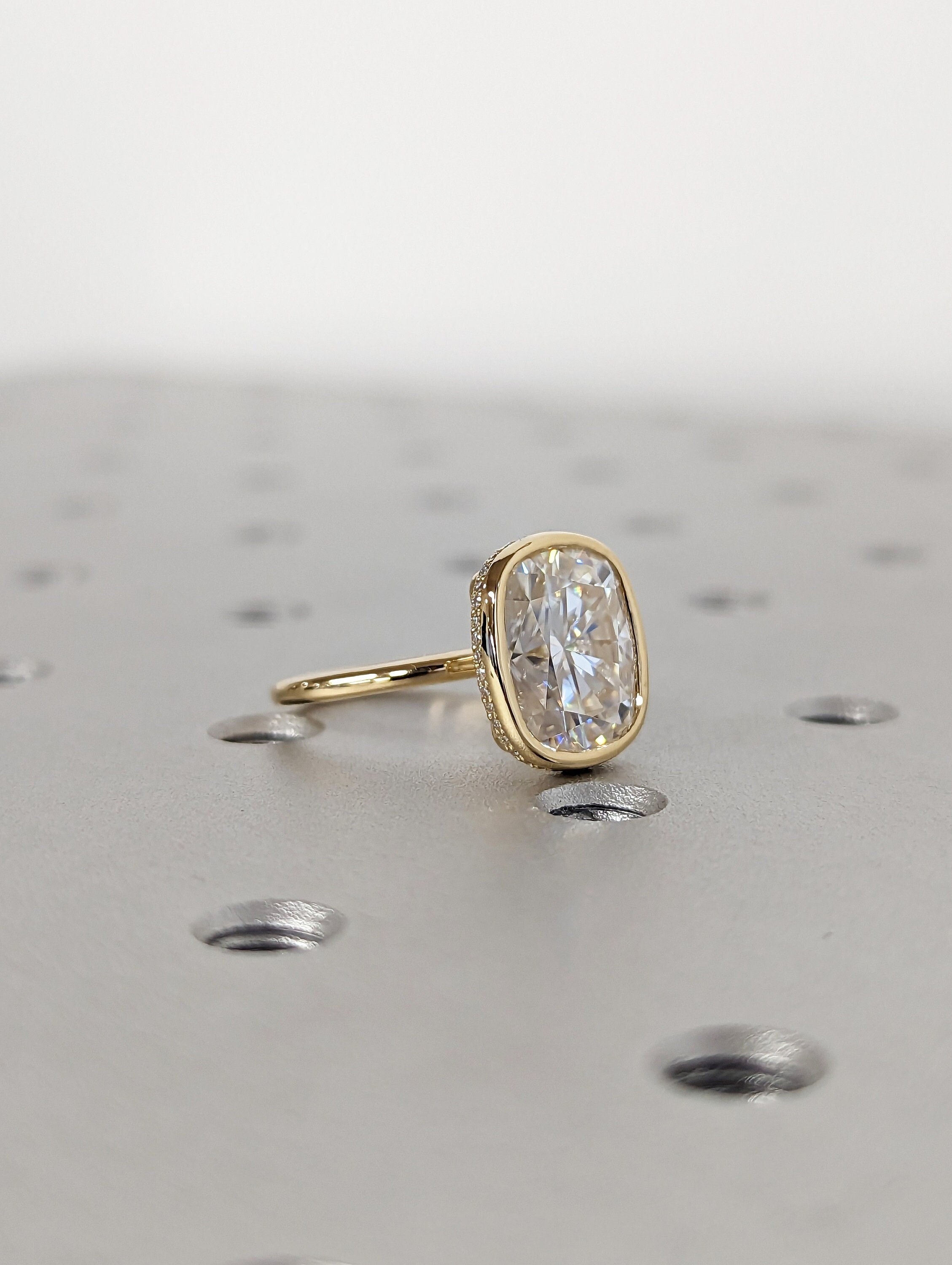 14k Yellow Gold VVS Moissanite Wedding Anniversary Ring: Bezel set Cushion cut with Hidden Halo