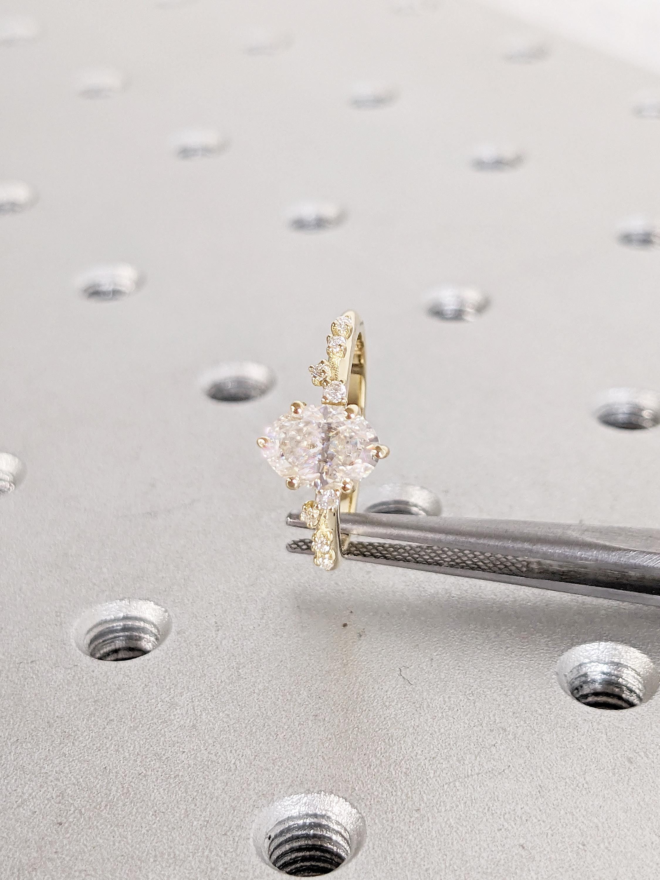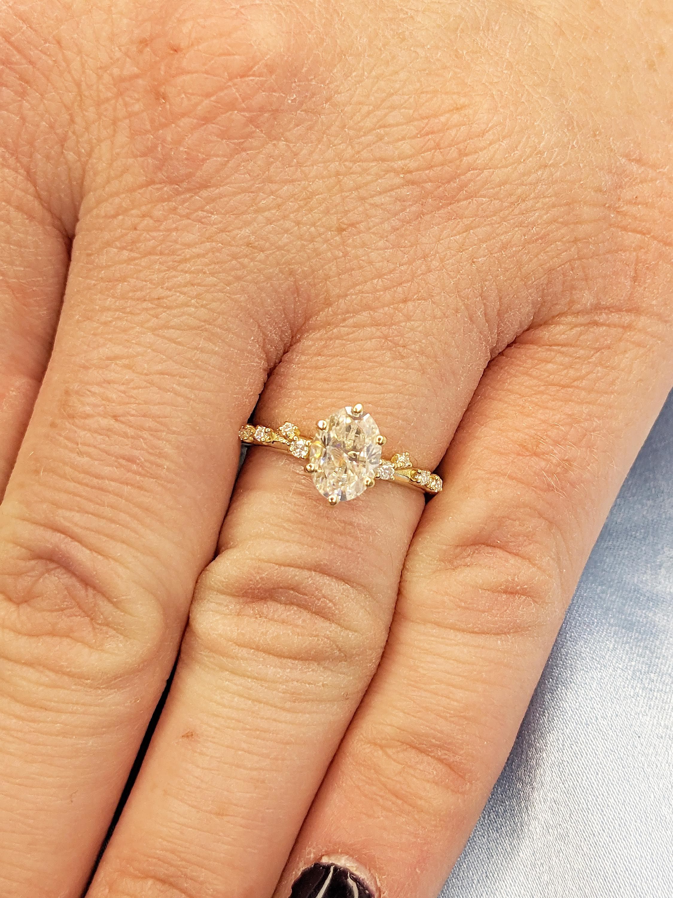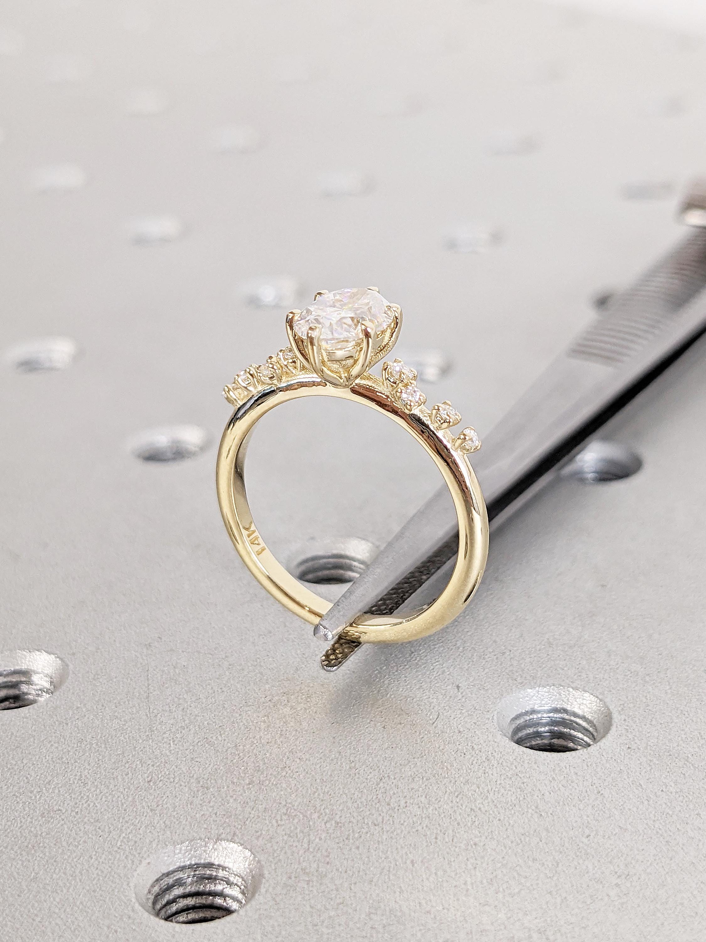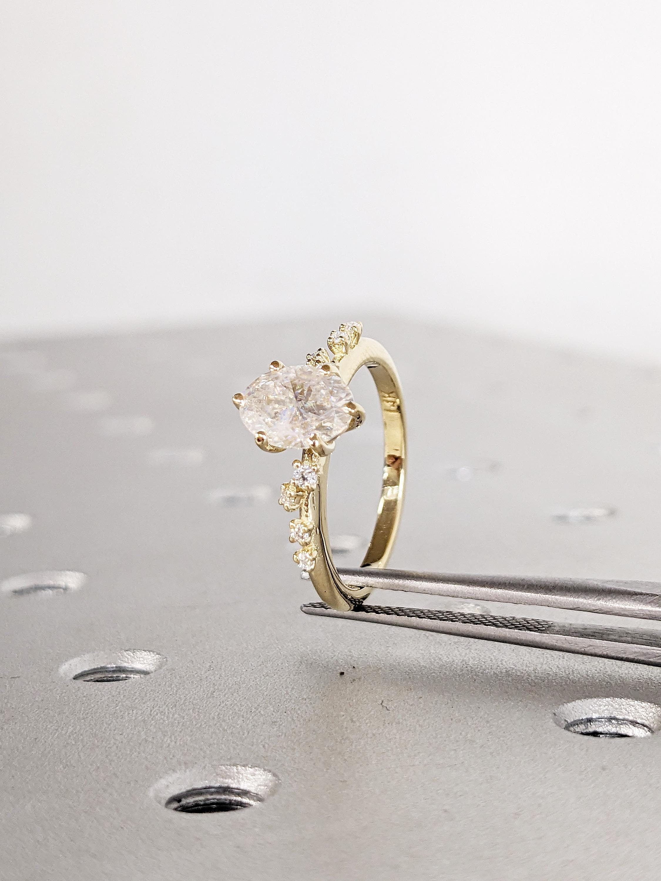 This stunning ring showcases an oval cut Moissanite at its center, surrounded by a delicate sparkling Natural Diamonds, Lab Grown Diamonds, or Moissanites. The unique zigzag arrangement creates a mesmerizing and distinctive design, perfect for proposals or cherished milestones. Crafted to leave a lasting impression, this exquisite piece exudes timeless elegance.