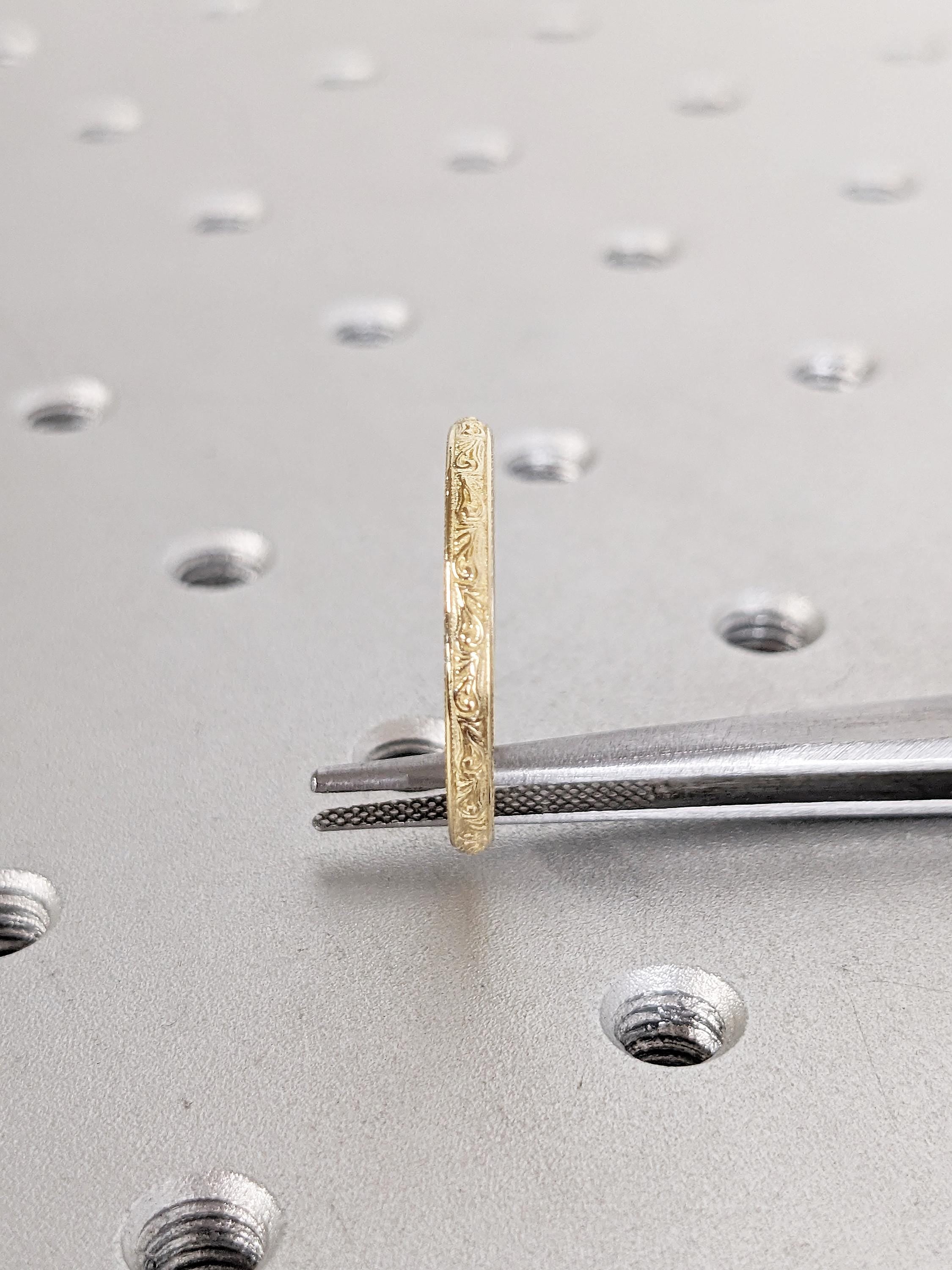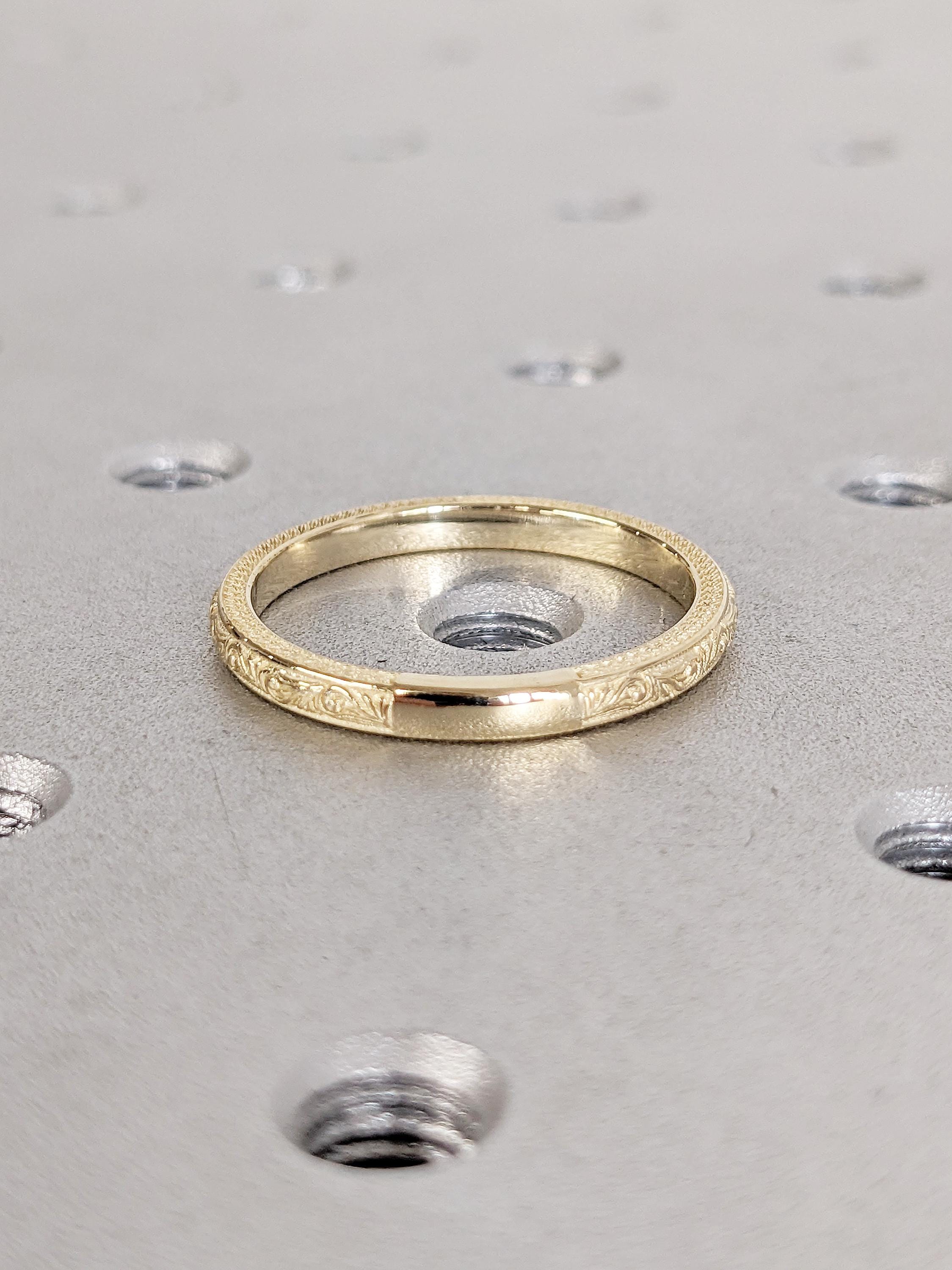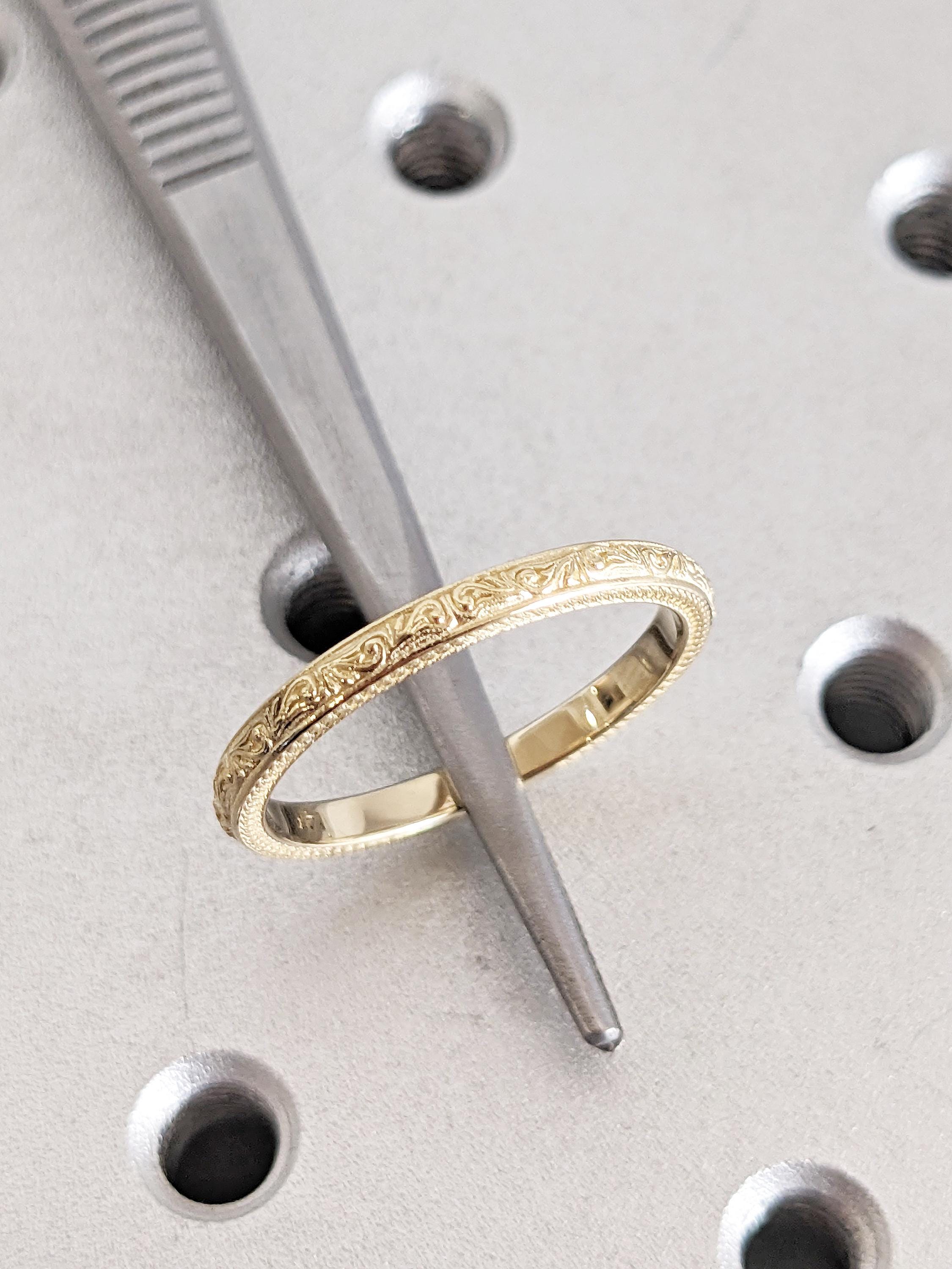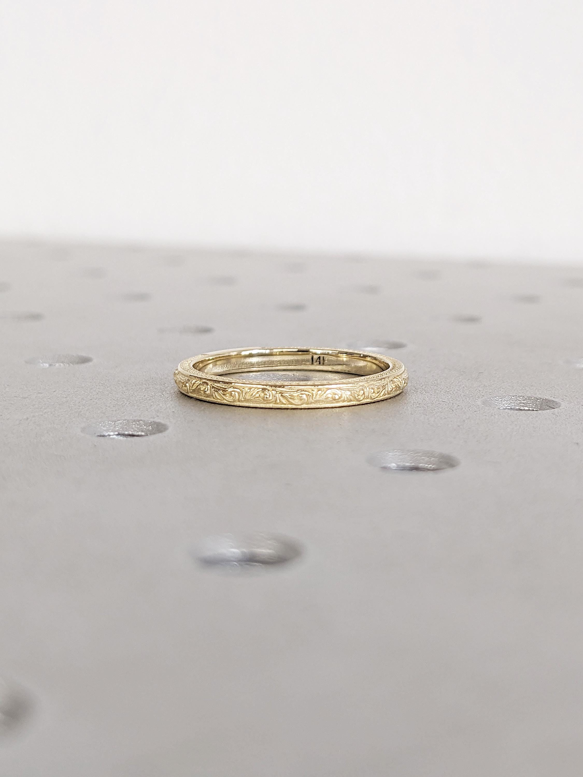 Expertly handcrafted, this vintage-inspired ring showcases intricate filigree and milgrain detailing on a delicate 2.45mm band. Timeless and elegant, it makes a regal statement worn alone and pairs beautifully with an engagement ring featuring similar motifs for a cohesive bridal set.