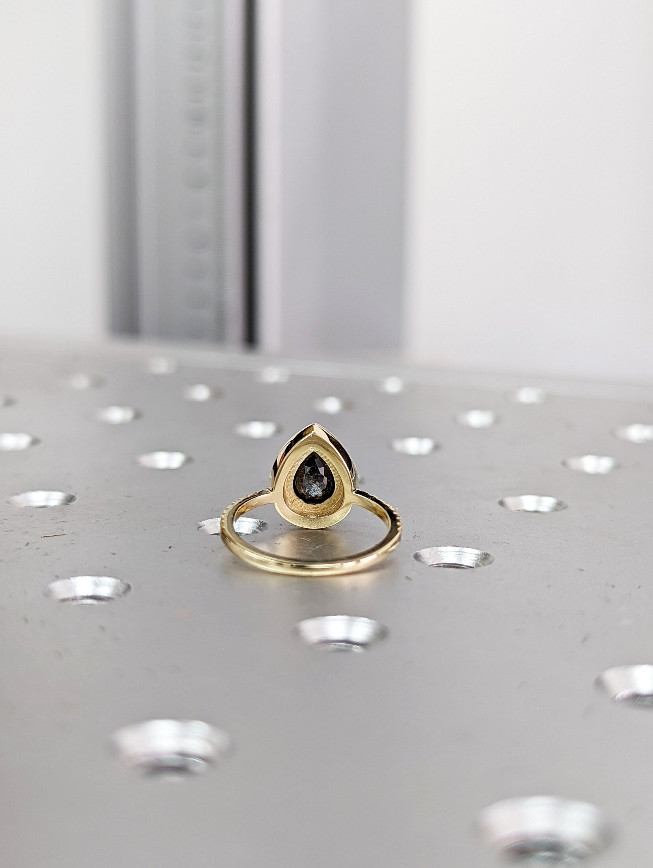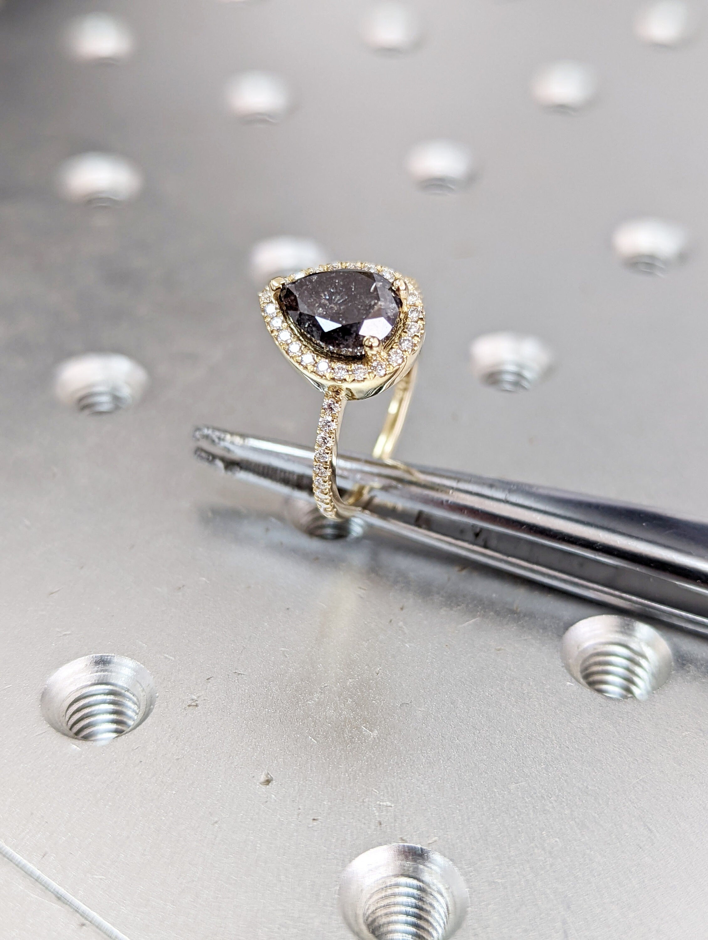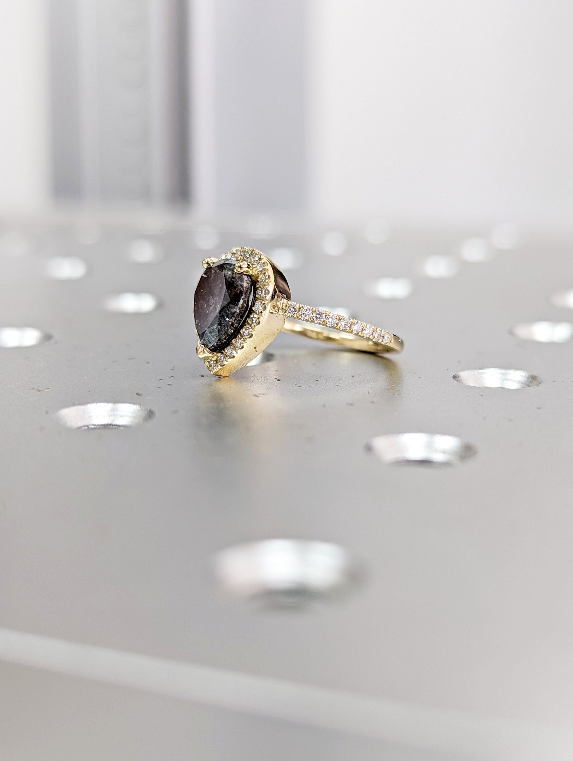 1.5 Carat 1920's Raw Salt and Pepper Diamond Halo, Pear Diamond Halo Ring, Unique Engagement Bridal Set, Grey Diamond Ring Halo Ring