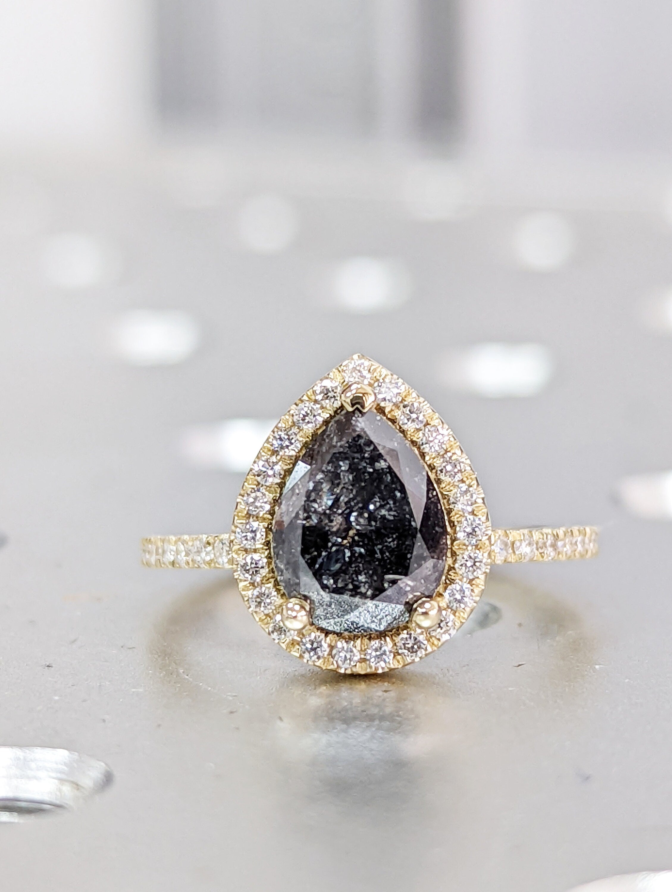 Enchanting vintage inspired design, with a unique pear shaped full cut salt and pepper diamond, adorned with a halo of natural round
