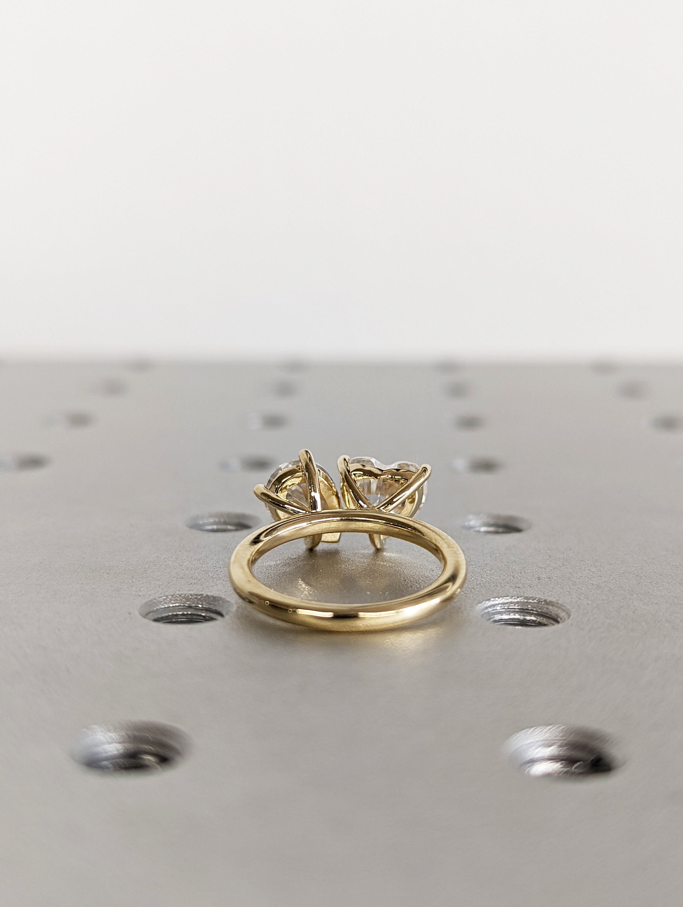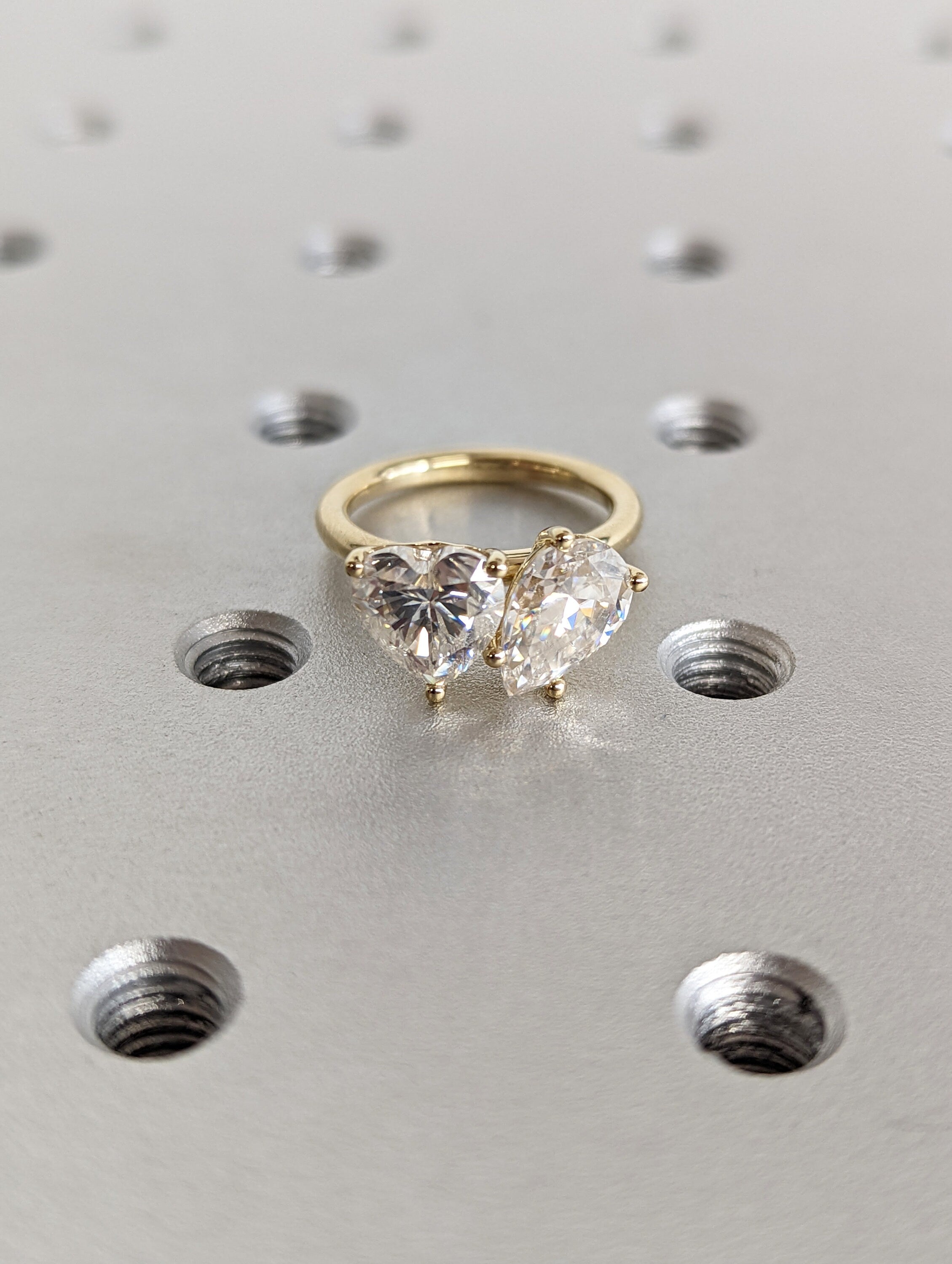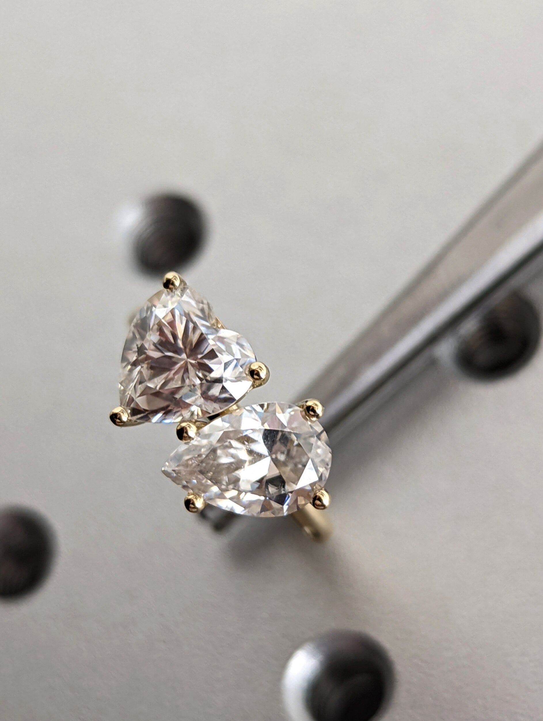 A beautiful dual heart and pear shaped moissanites, set with a super delicate and thin setting the unique and delicate