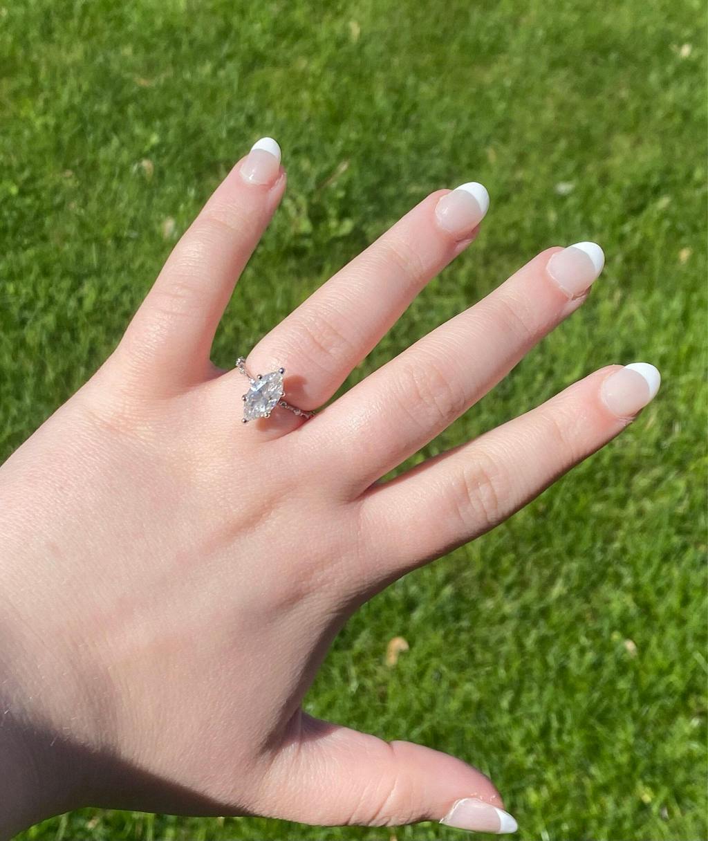 An engagement ring with a marquise cut that radiates elegance, accompanied by a subtle hidden halo for added charm. Select either a genuine diamond or a captivating moissanite to create a symbol of your everlasting commitment that will stand the test of time.