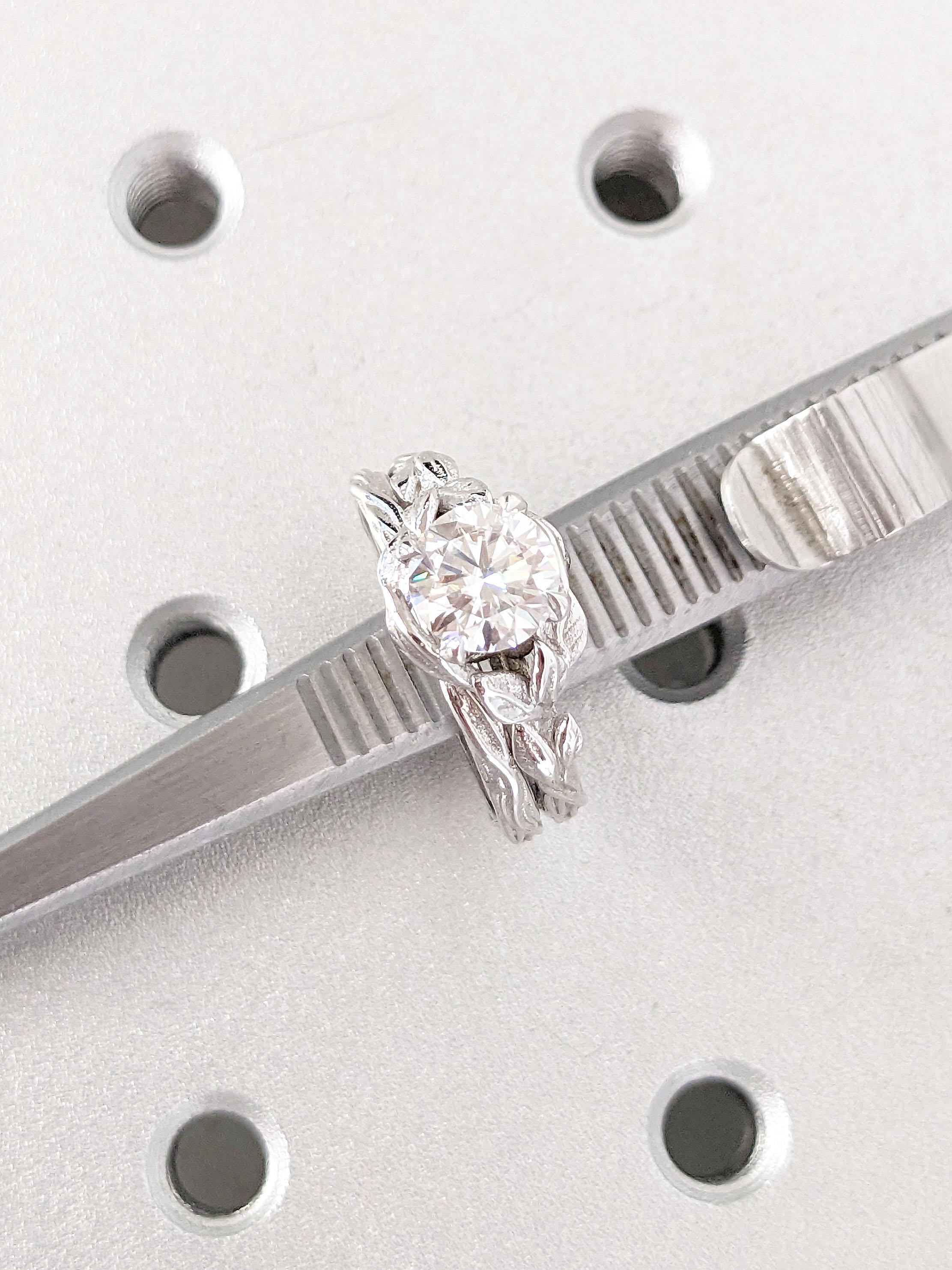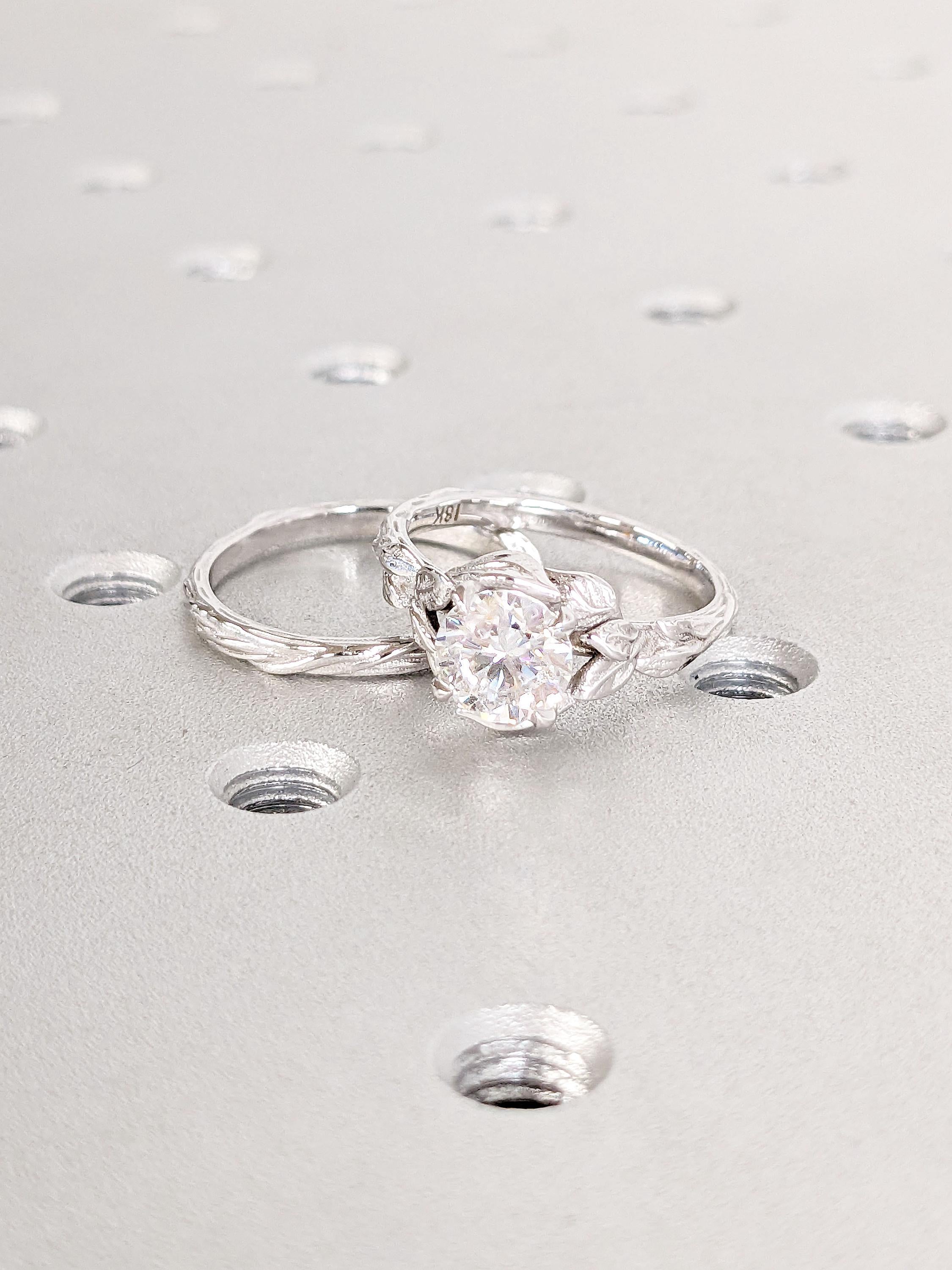 A nature inspired solitaire ring, features a round cut Moissanite centerpiece, elegantly embraced by handcrafted leaf motifs, held by classic talon prong setting on a delicate twigs and branches engraved band. With a matching dainty stacking ring in similar engraving, this rustic jewelry makes the perfect bridal set for nature lovers celebrating their love story.