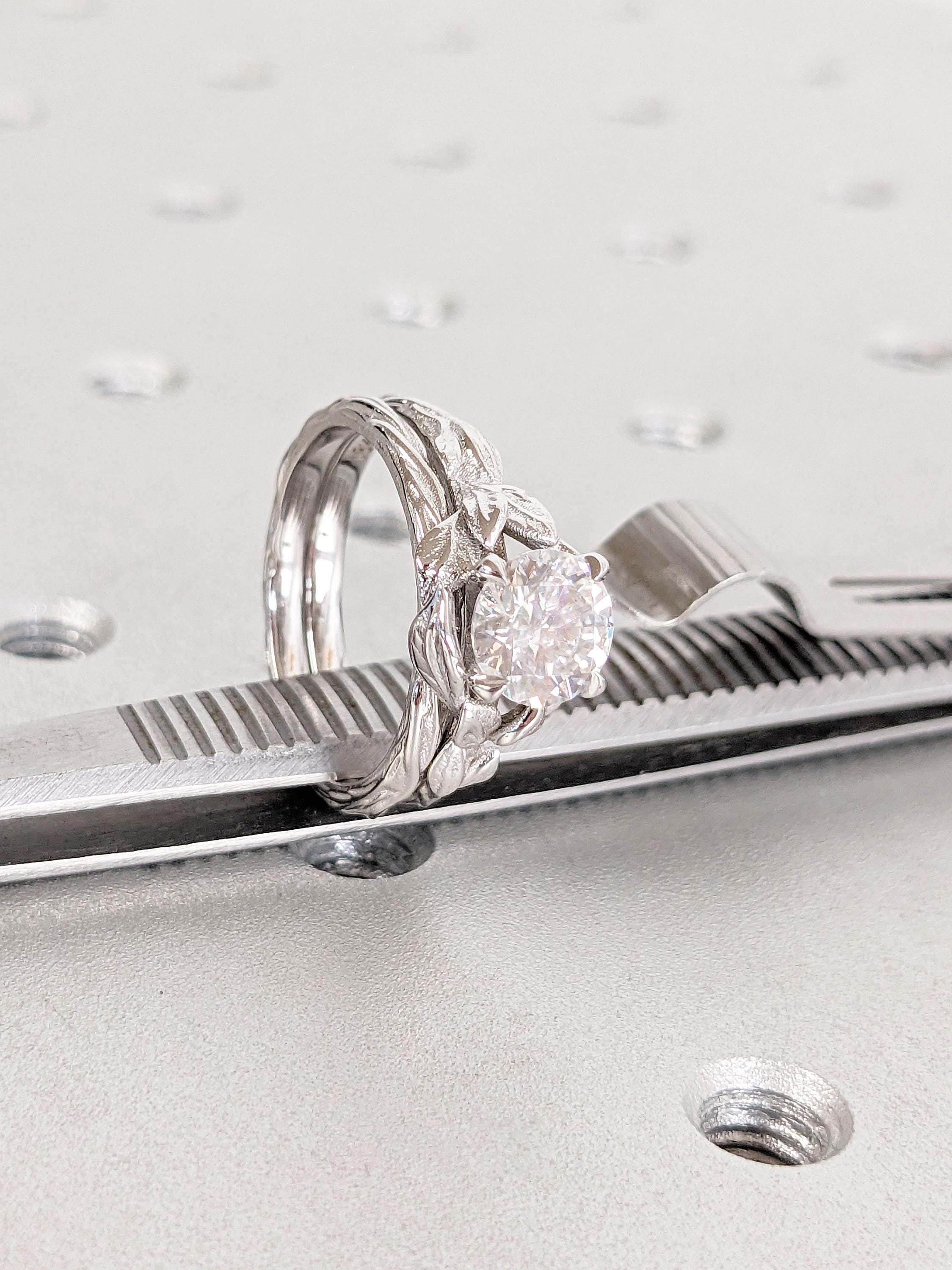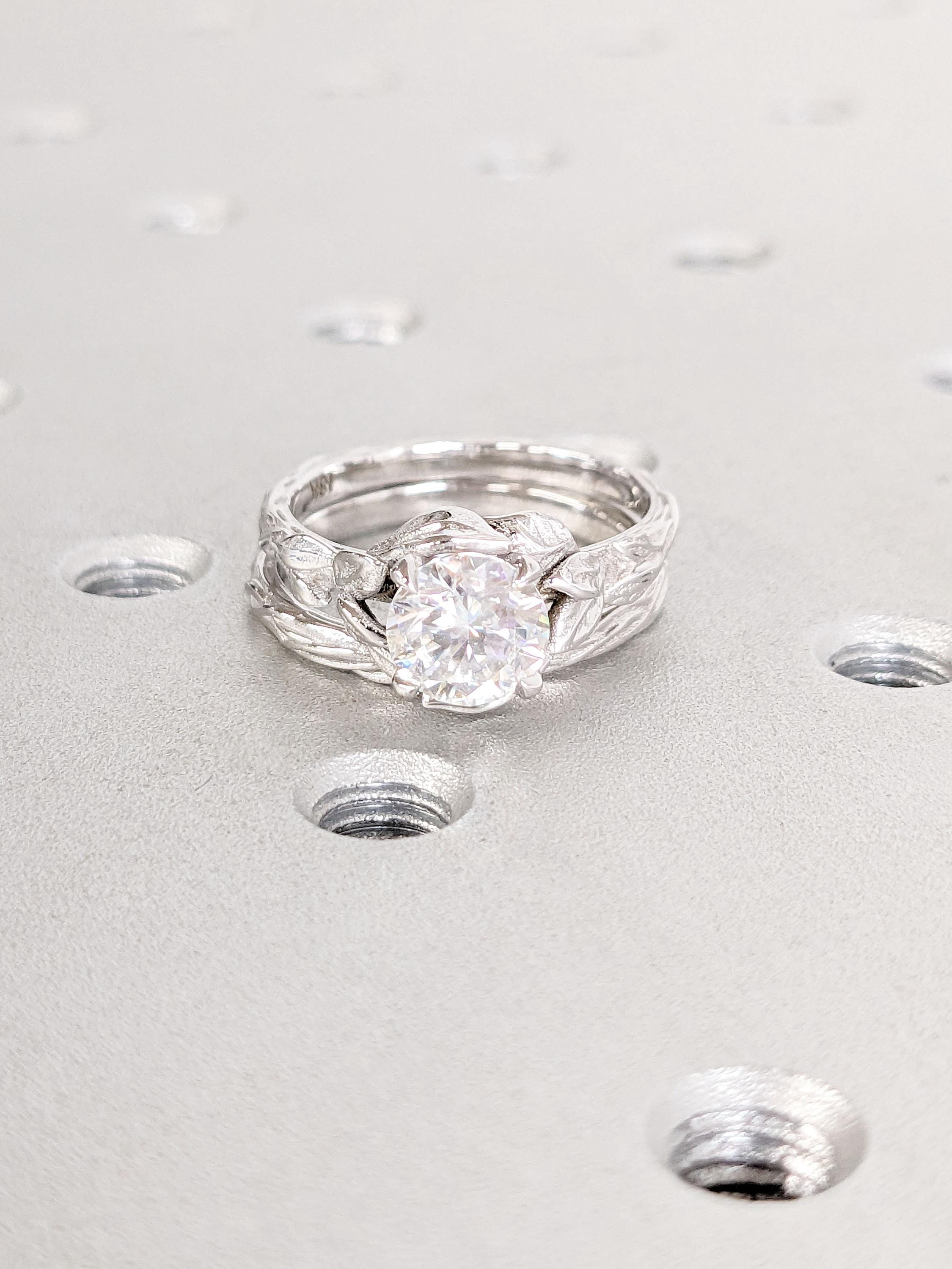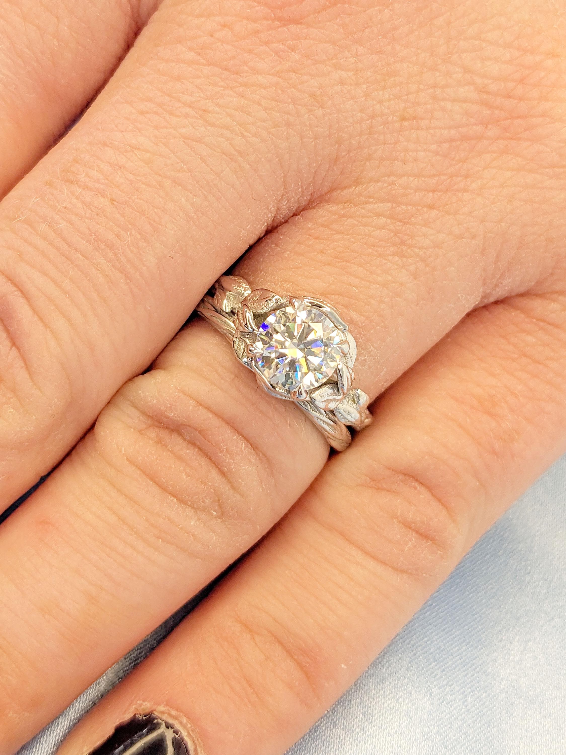 1.5ct, 2 Carat Moissanite Promise Ring | Round cut Ring | 18K White Gold Rings for Women | Twig and Leaf Rustic Engagement Stacking Ring