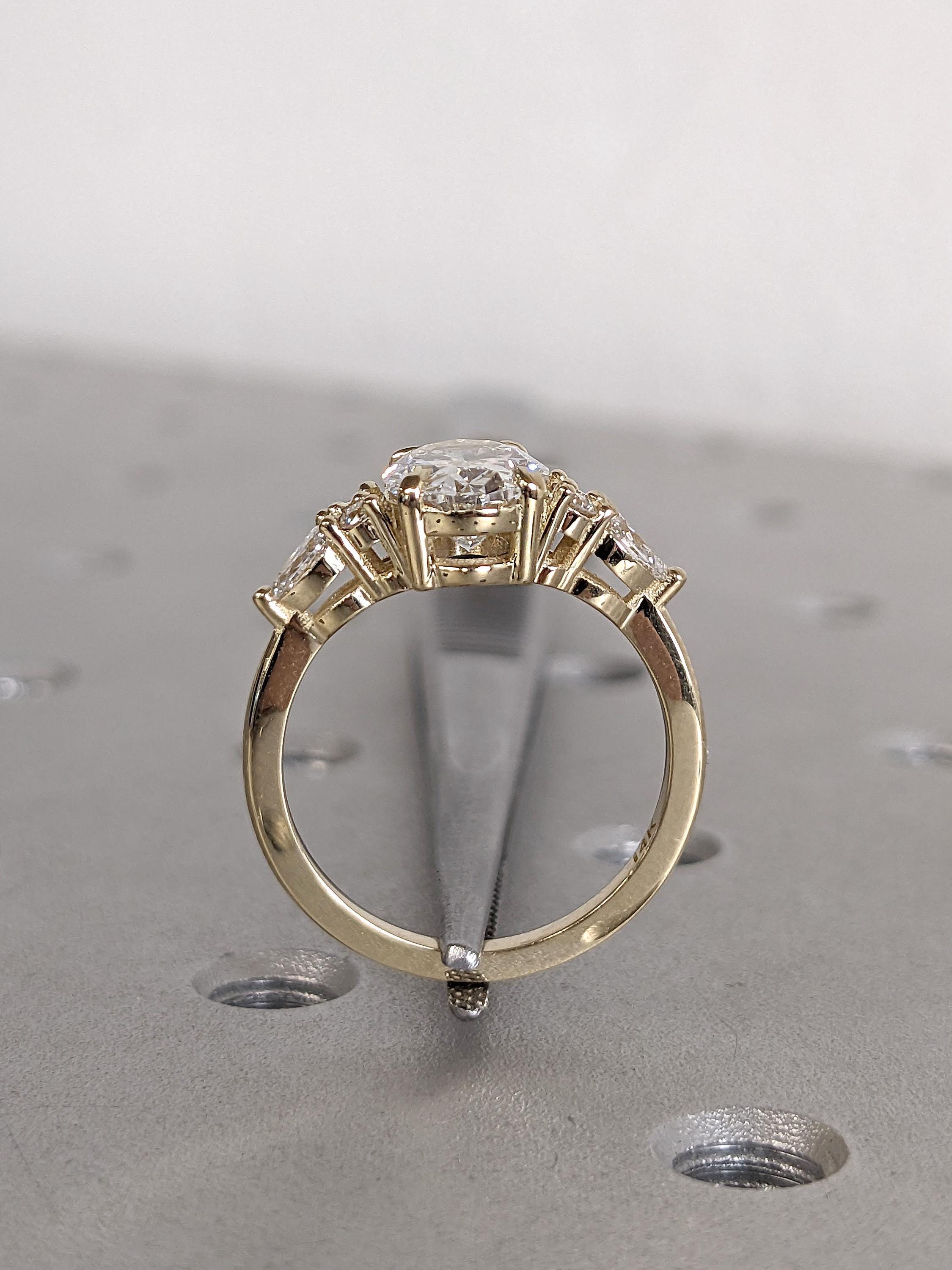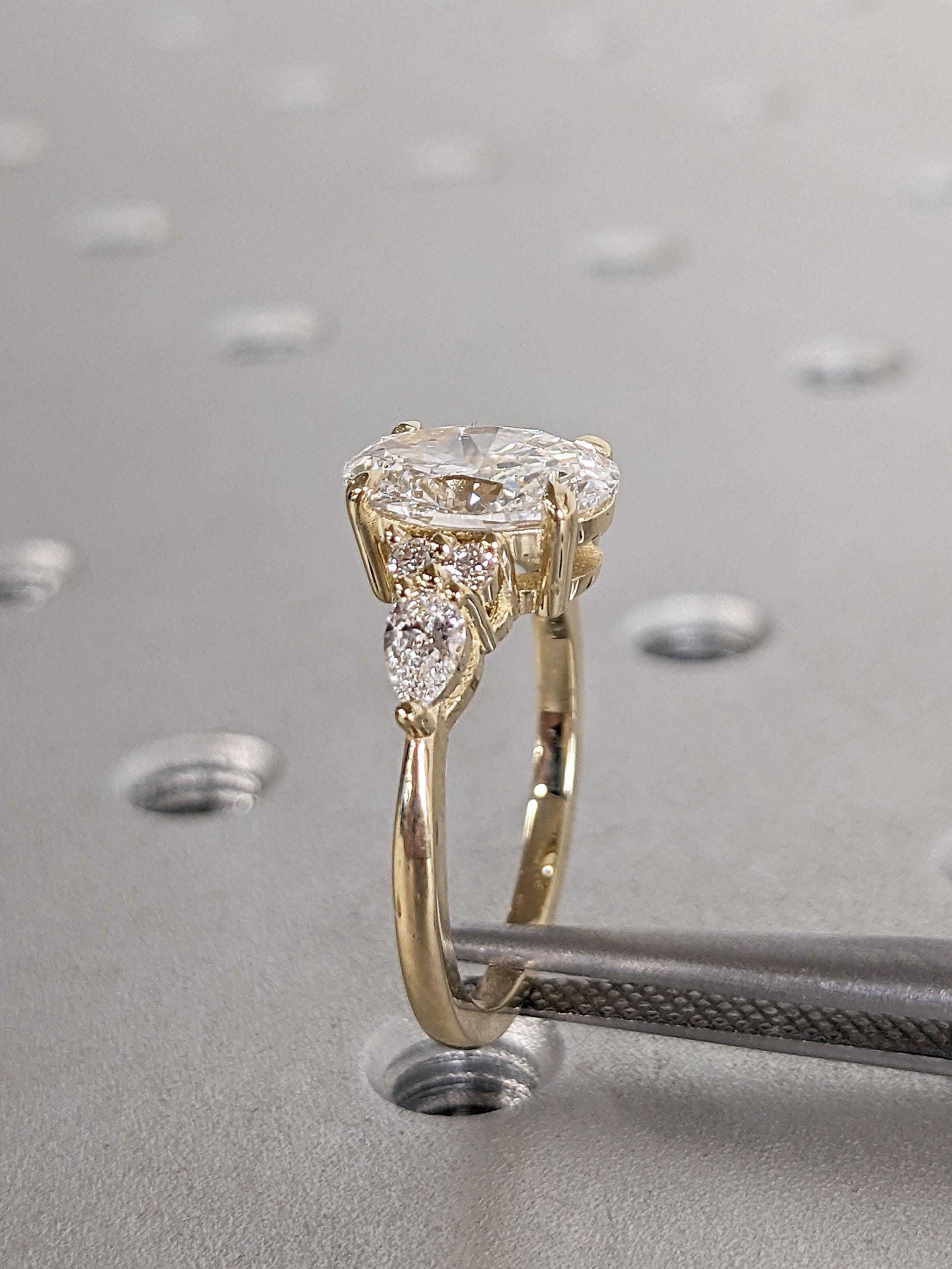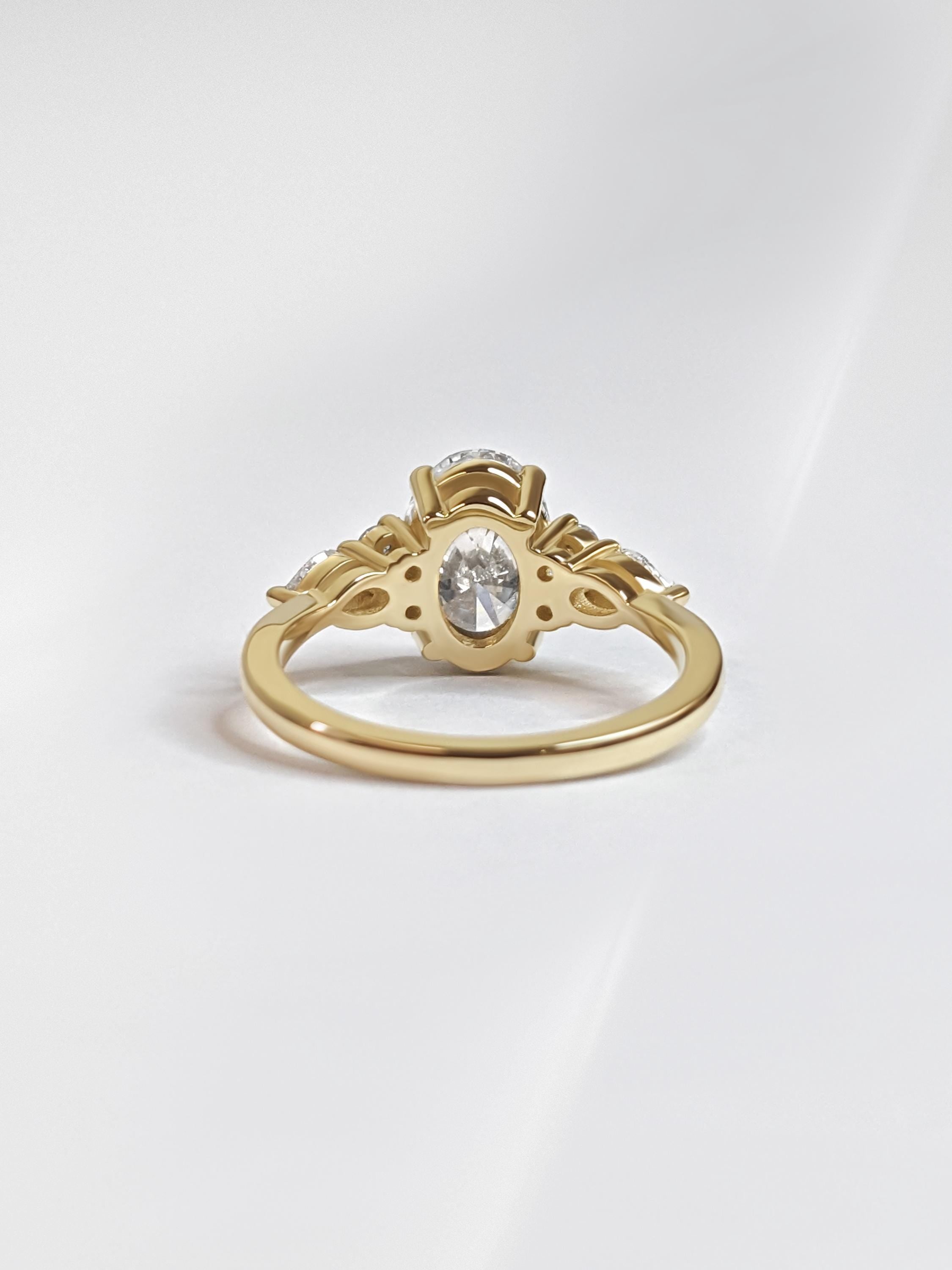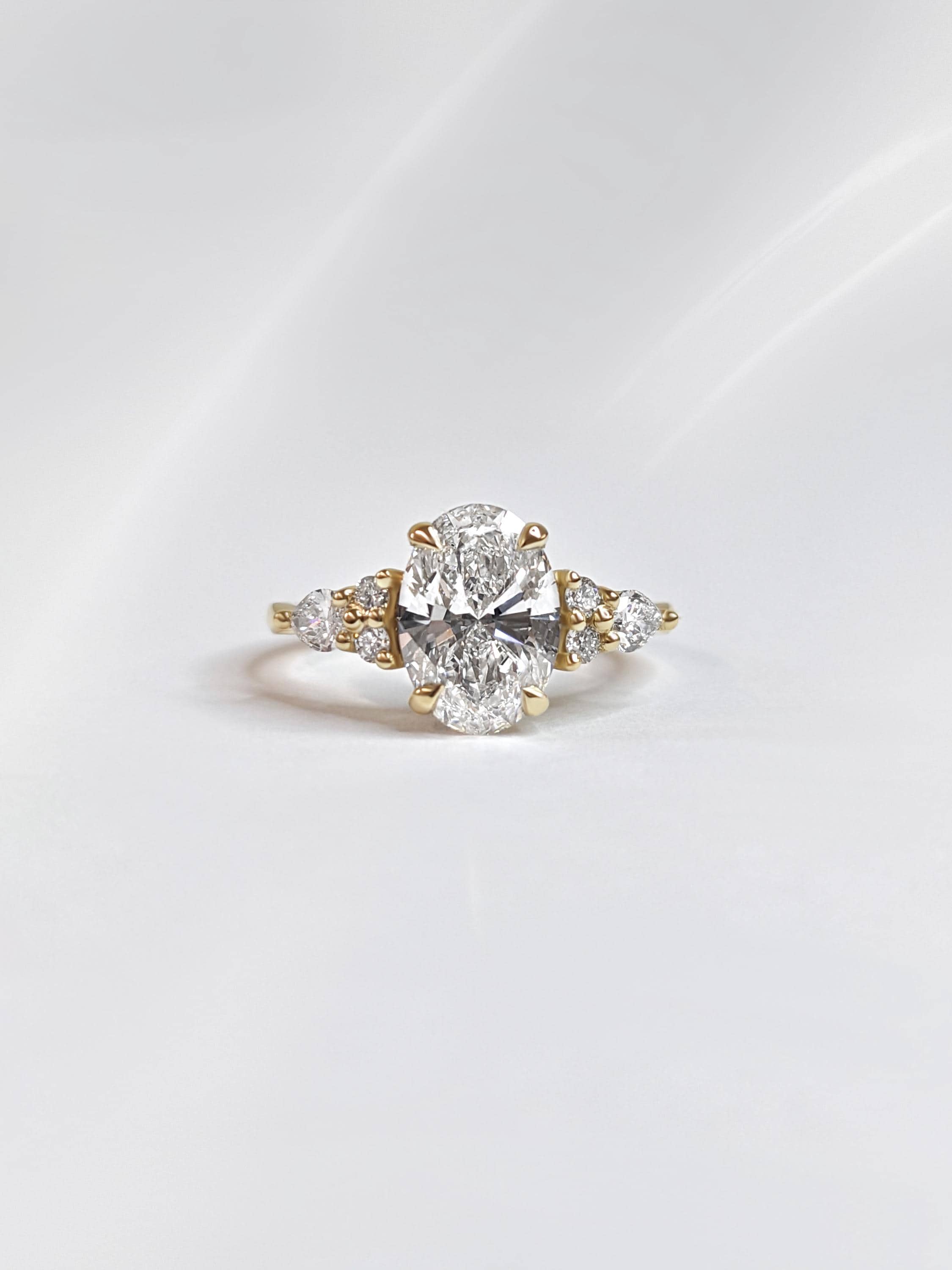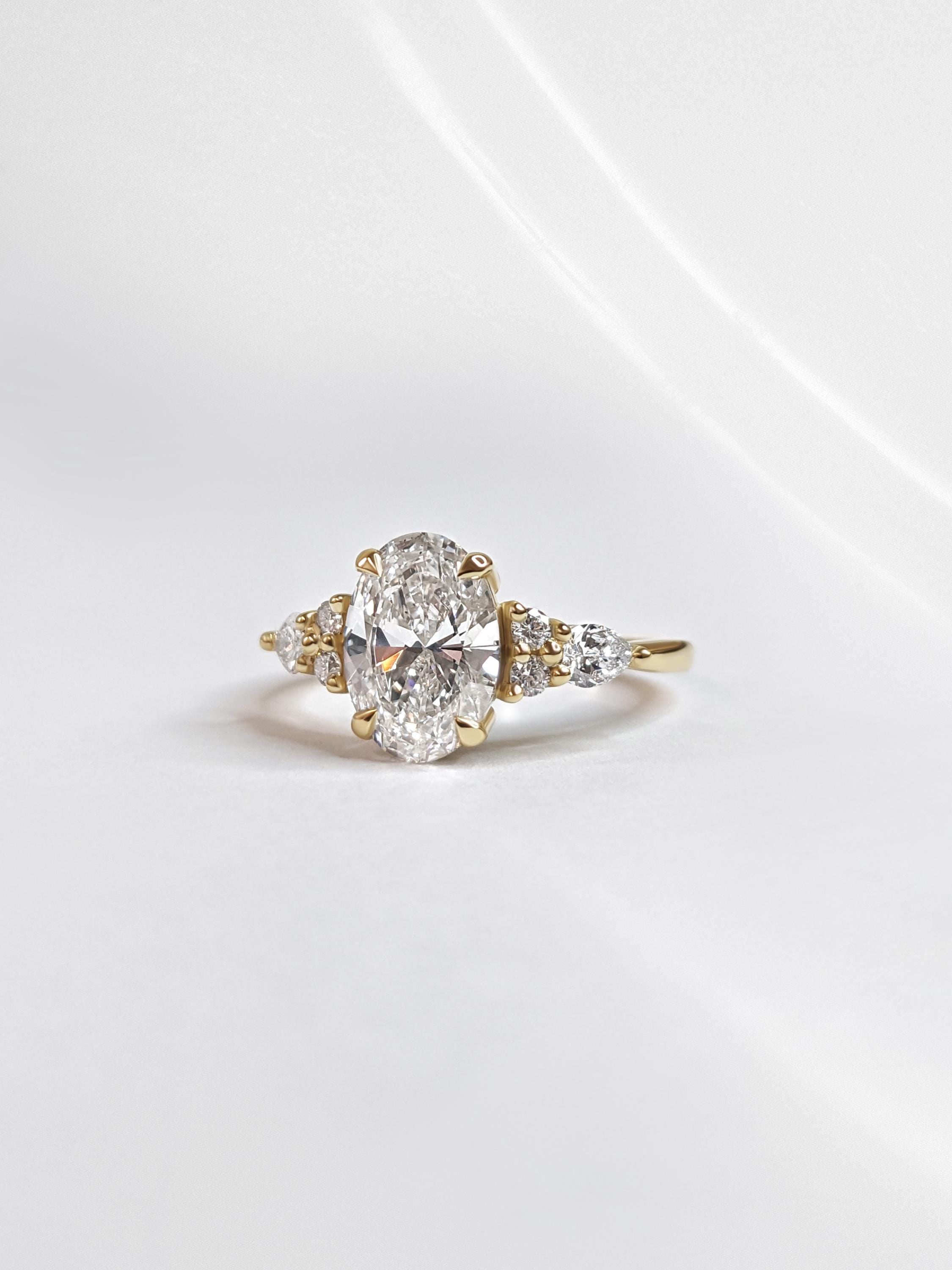 This ornate, vintage-inspired luxury ring features a prong center setting with oval shaped Lab Diamond, highlighted by prong set Natural Diamond, Man Made Diamond or Moissanite clusters on a delicate band. Can match with a unique curved stacking ring as a bridal set.