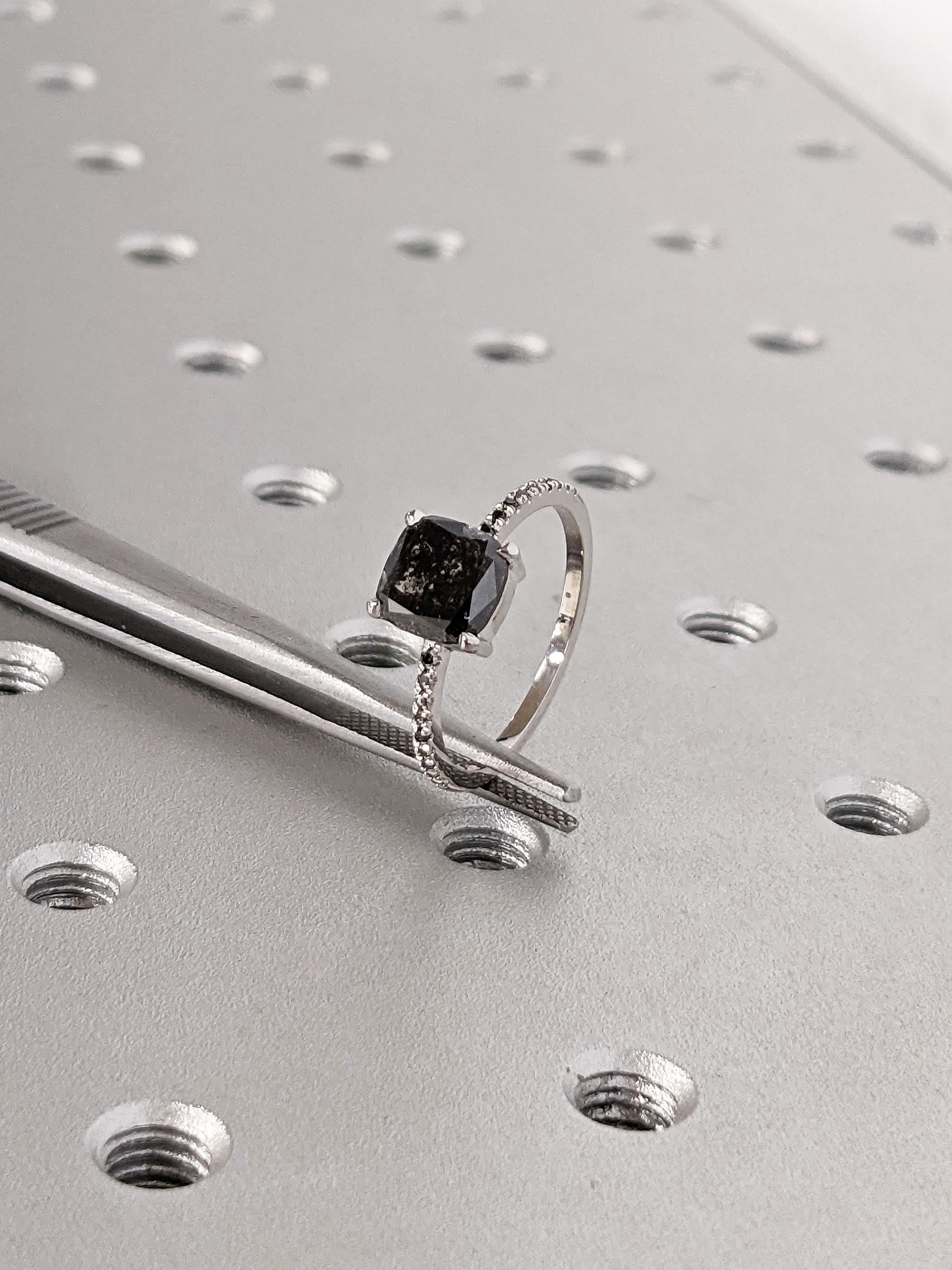 Enchanting vintage inspired design, with a unique cushion shaped full cut Salt and Pepper Diamond, adorned with black round brilliant diamonds on a 1.4mm width thin band. For an added glamour, pair it with our ombre diamonds open band. This handcrafted ring works great as a wedding jewelry or fashion statement piece.
