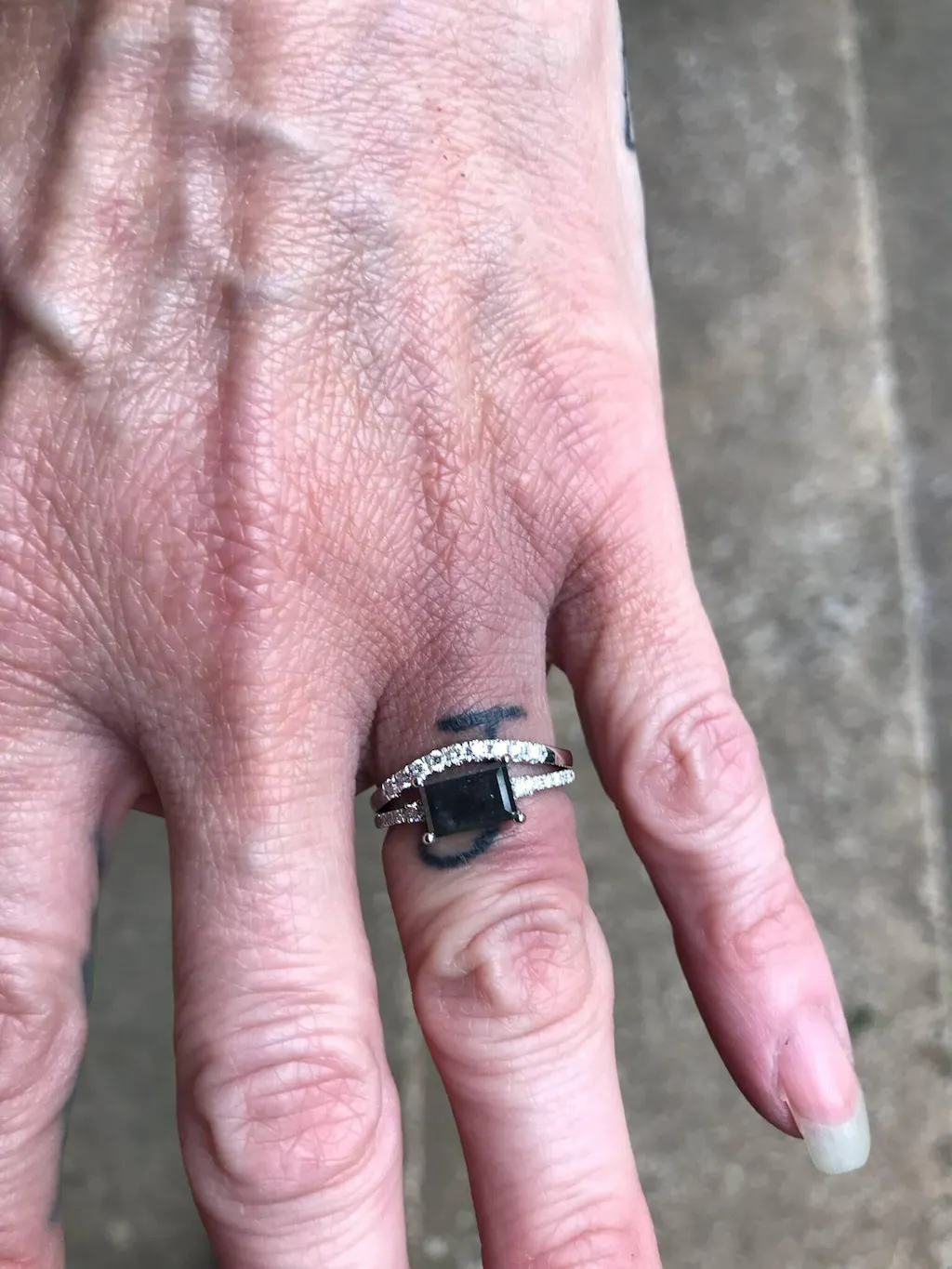 A stunningly beautiful vintage inspired design, petite band with a baguette cut Salt & Pepper diamond, adorned by 2 beautiful diamonds to contrast the center diamond.