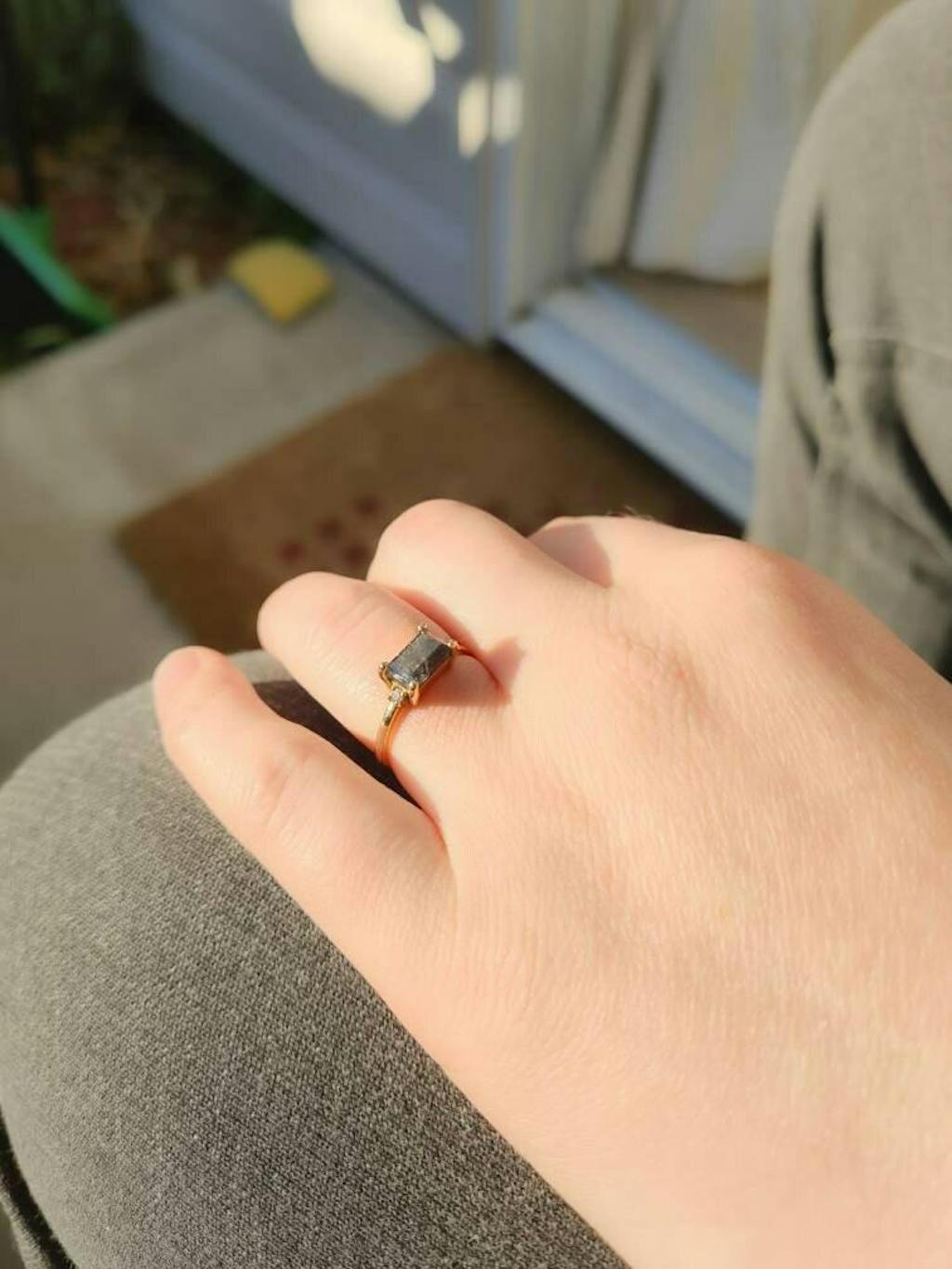 A stunningly beautiful vintage inspired design, petite band with a baguette cut Salt & Pepper diamond, adorned by 2 beautiful diamonds to contrast the center diamond.