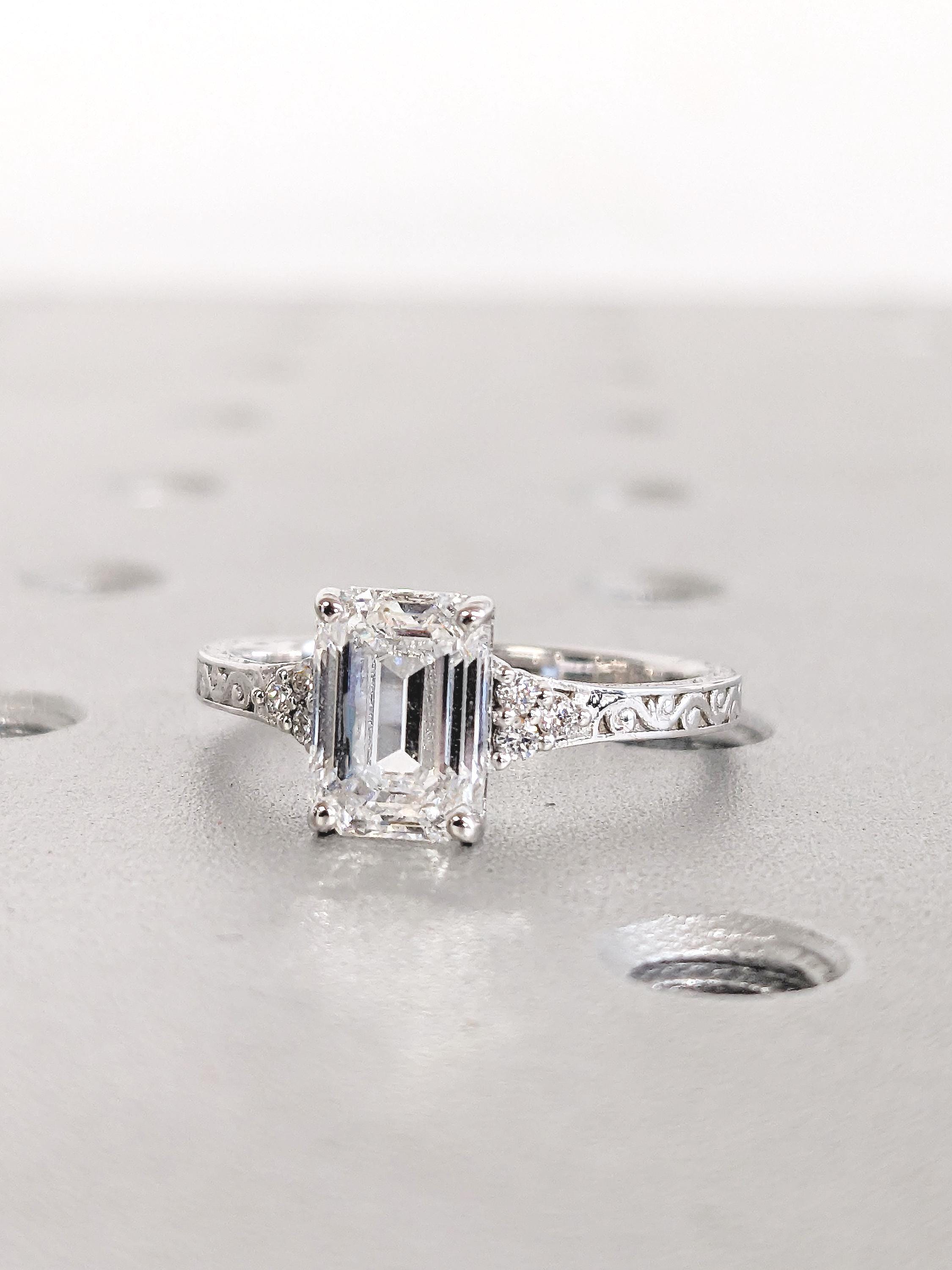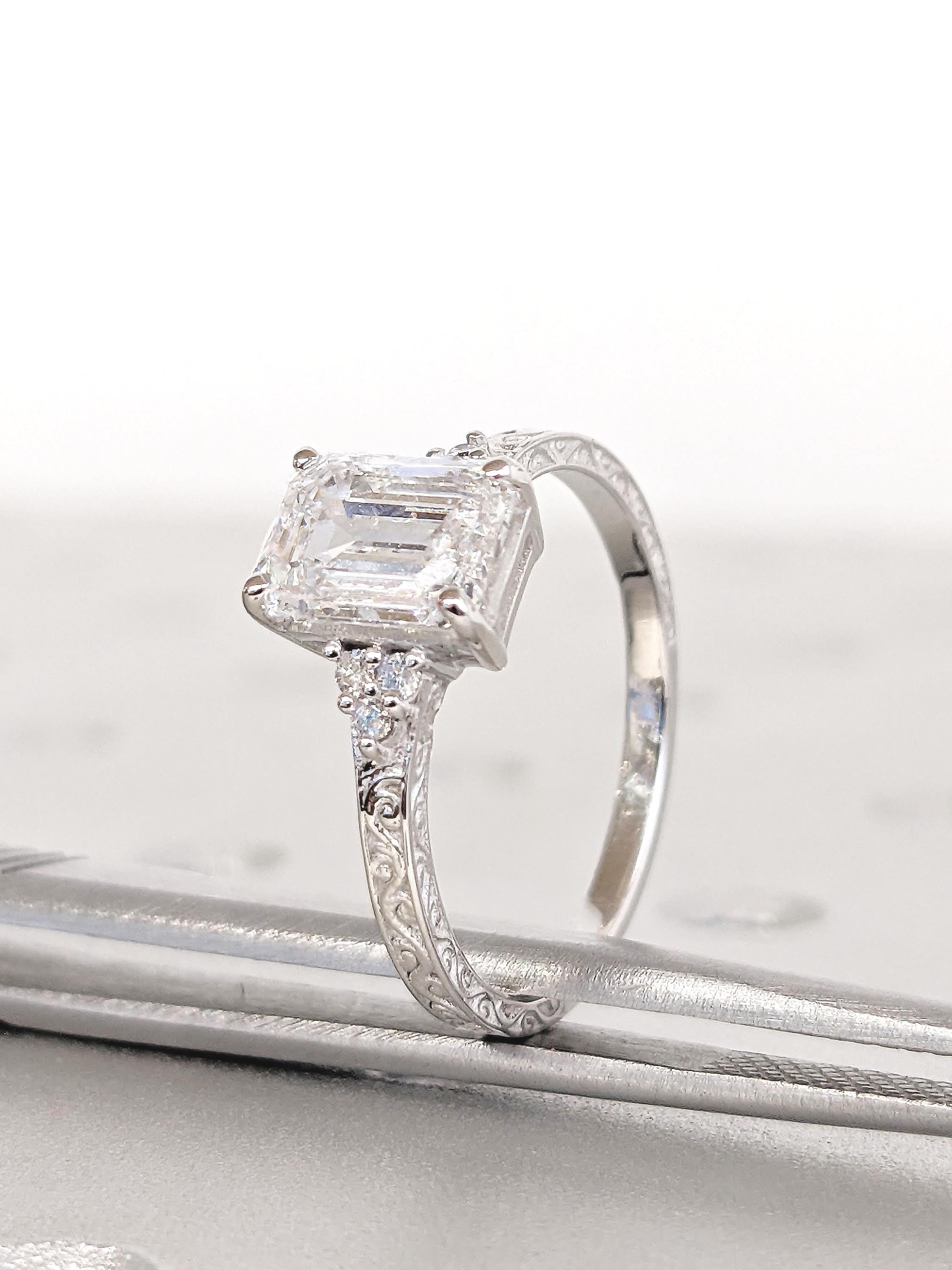 This emerald-cut Lab Grown Diamond engagement ring radiates timeless beauty, showcasing a brilliant center stone in a secure prong setting. Flanking the centerpiece are clusters of Lab Grown Diamonds that add harmonious sparkle and elegance. The band’s delicate filigree design infuses a vintage-inspired charm, creating a romantic and enduring symbol of commitment.