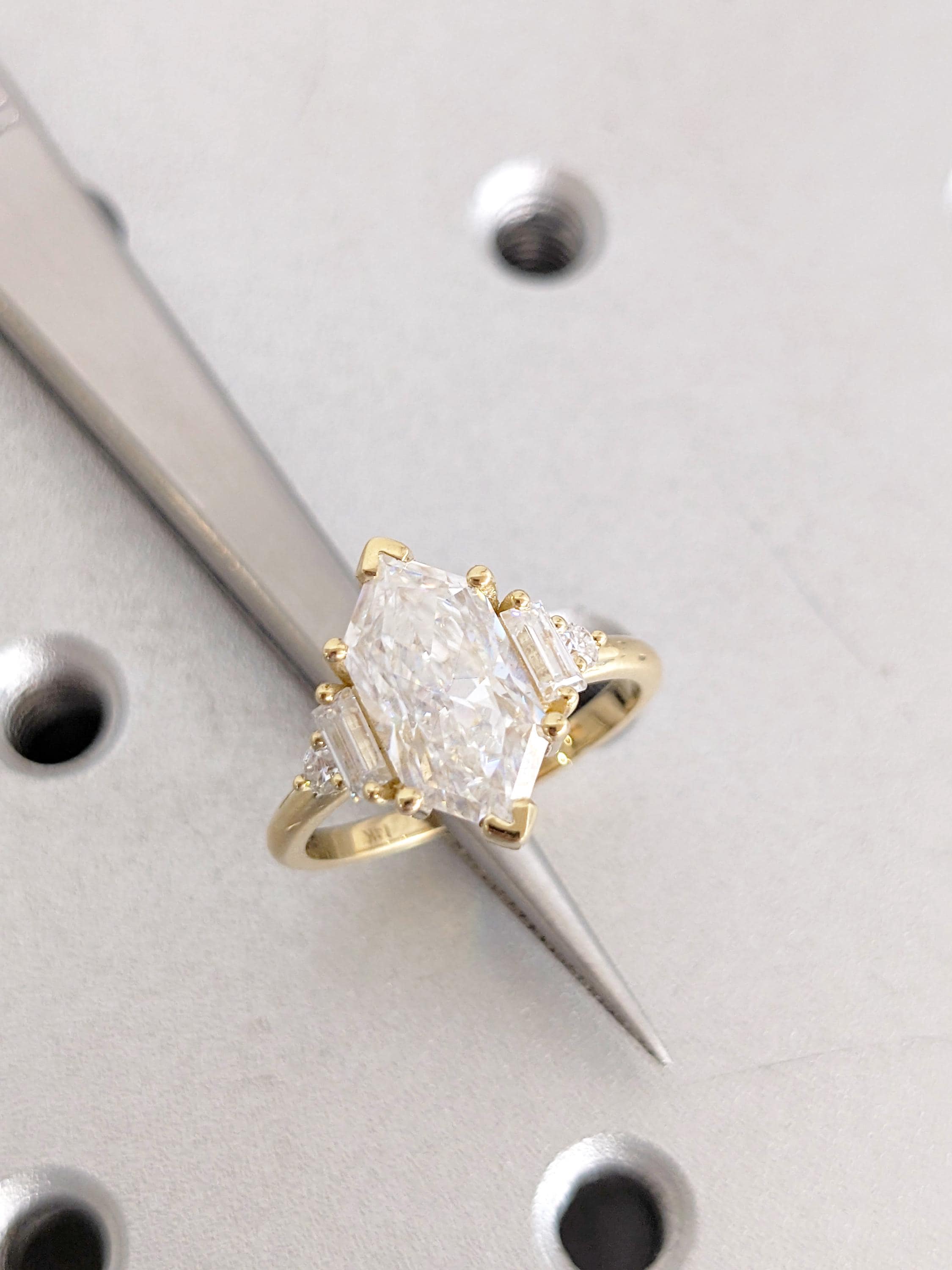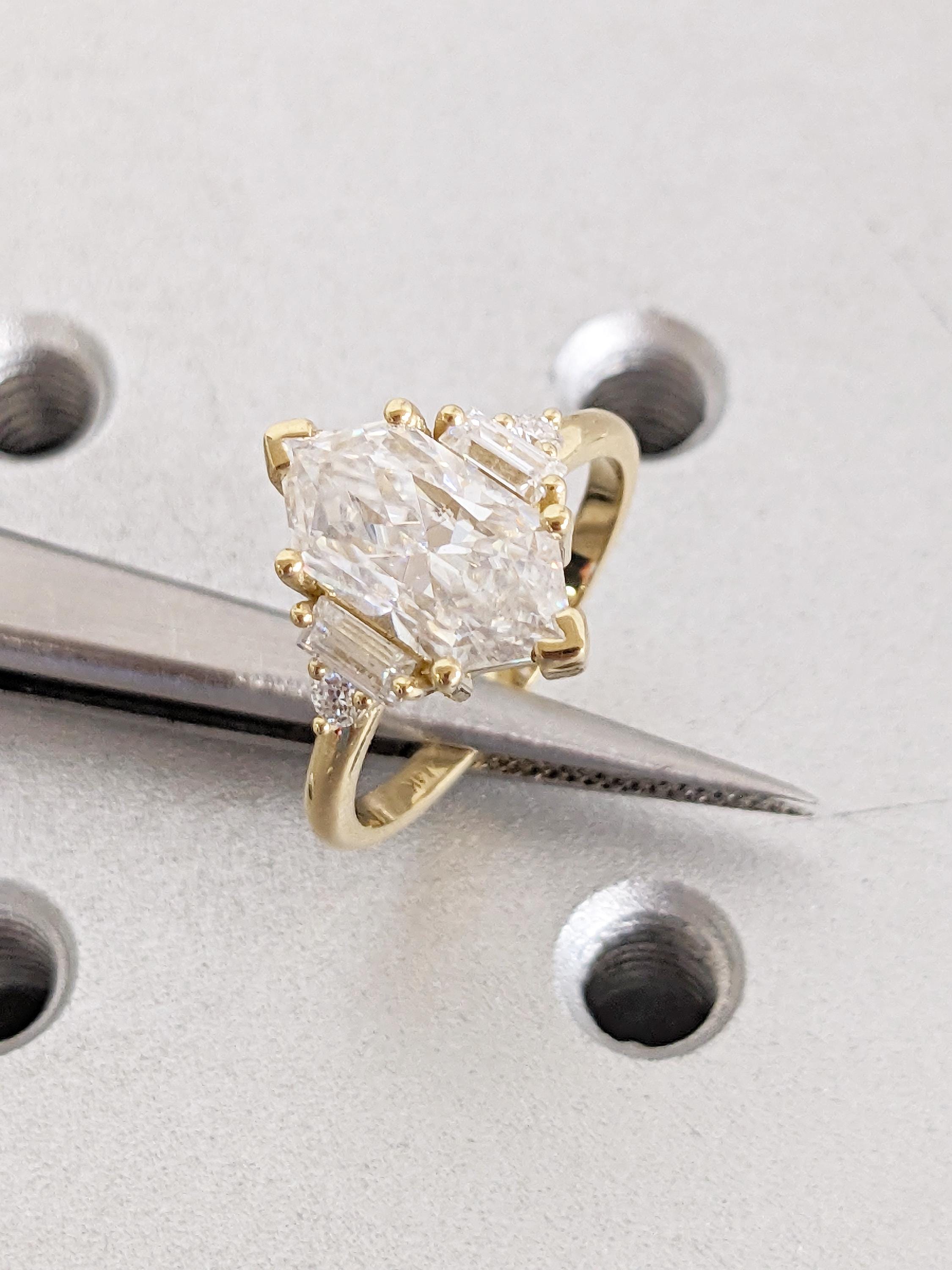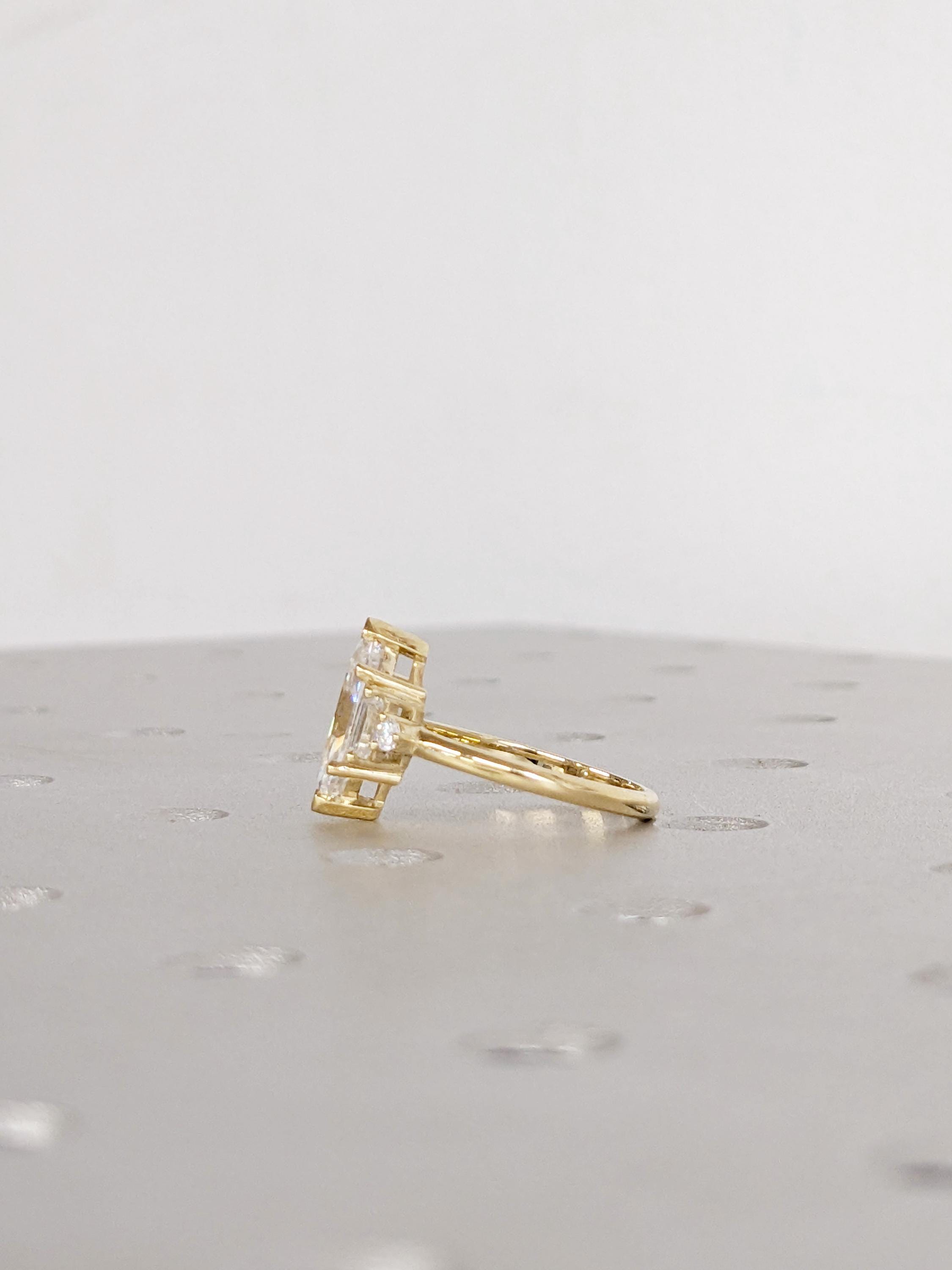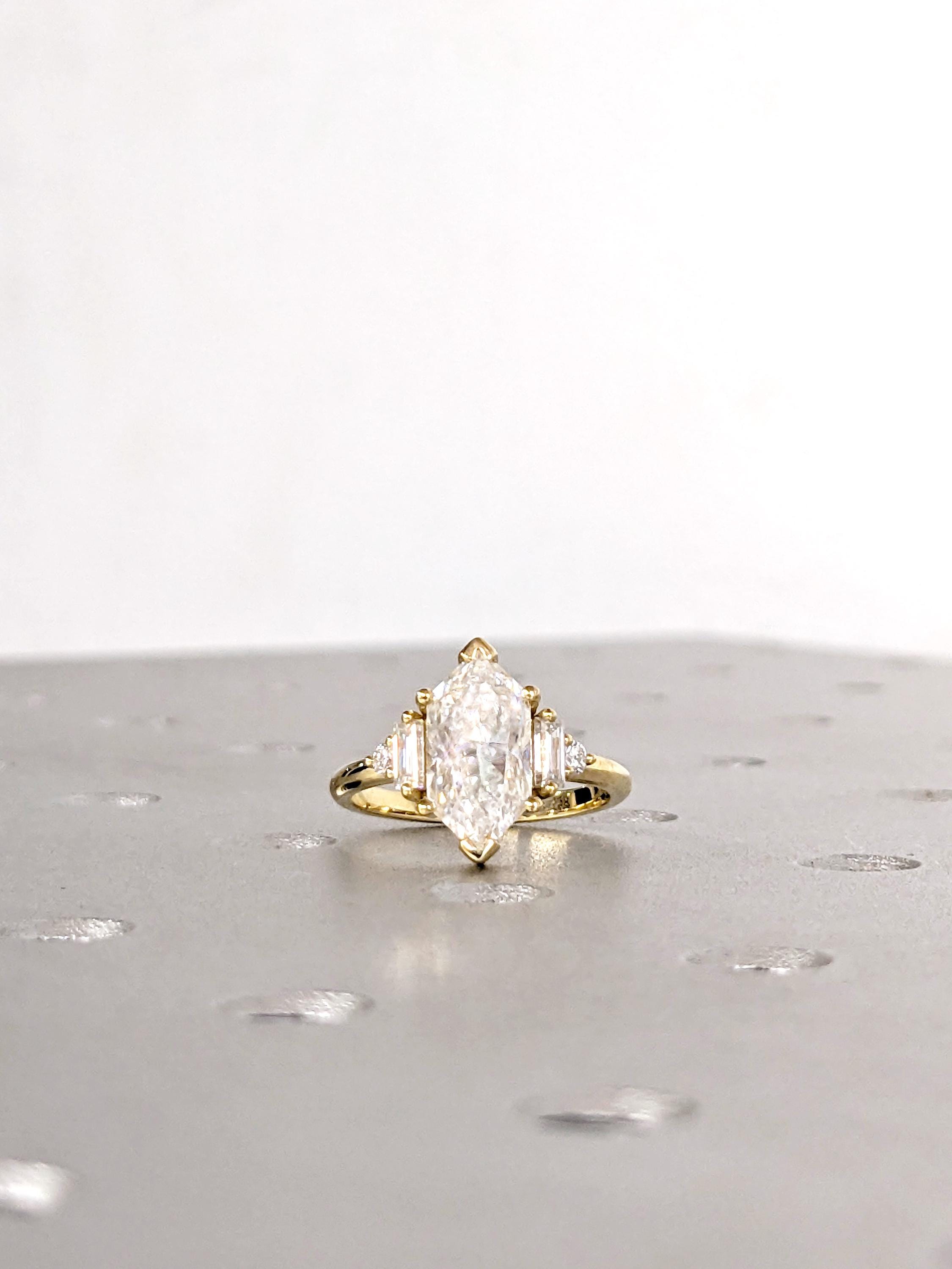 This Lab Grown Diamond engagement ring highlights a Dutch marquise Lab Diamond center stone in a prong setting, paired with Lab Diamond baguette and round side stones for a refined and bright look. The balanced mix of cuts creates a graceful style perfect for an engagement ring, bridal wear, anniversary gift, or a timeless everyday piece.