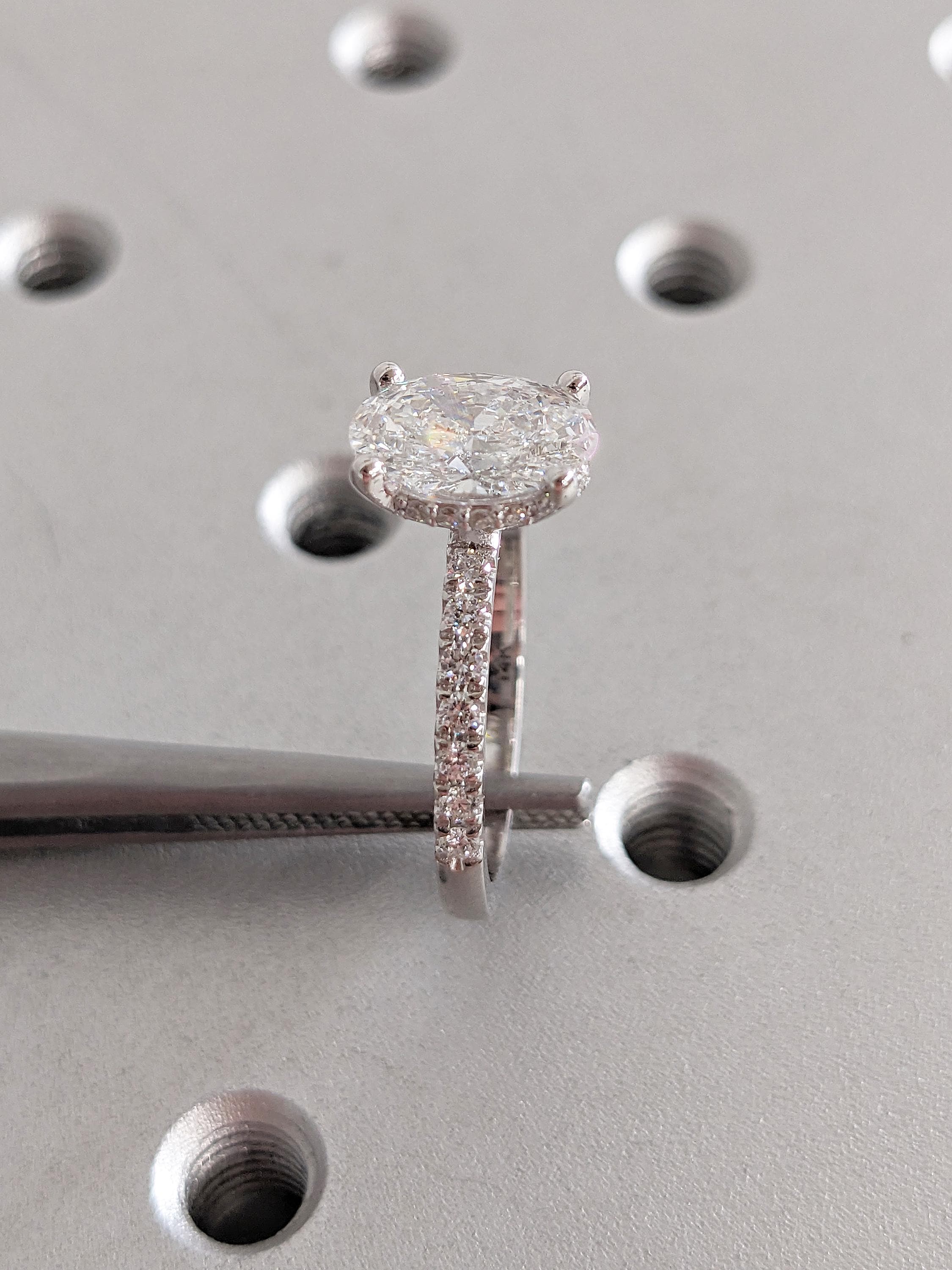 A handmade classic design, this luxurious ring features an oval cut Lab Grown Diamond center, atop a dazzling hidden halo. Set on a dainty half eternity band of 2mm width, paved with Lab Grown Diamonds. Sparkling and elegant, this fine piece of jewelry is the perfect gift to celebrate your love story, or as a token of appreciation for that special woman in your life.