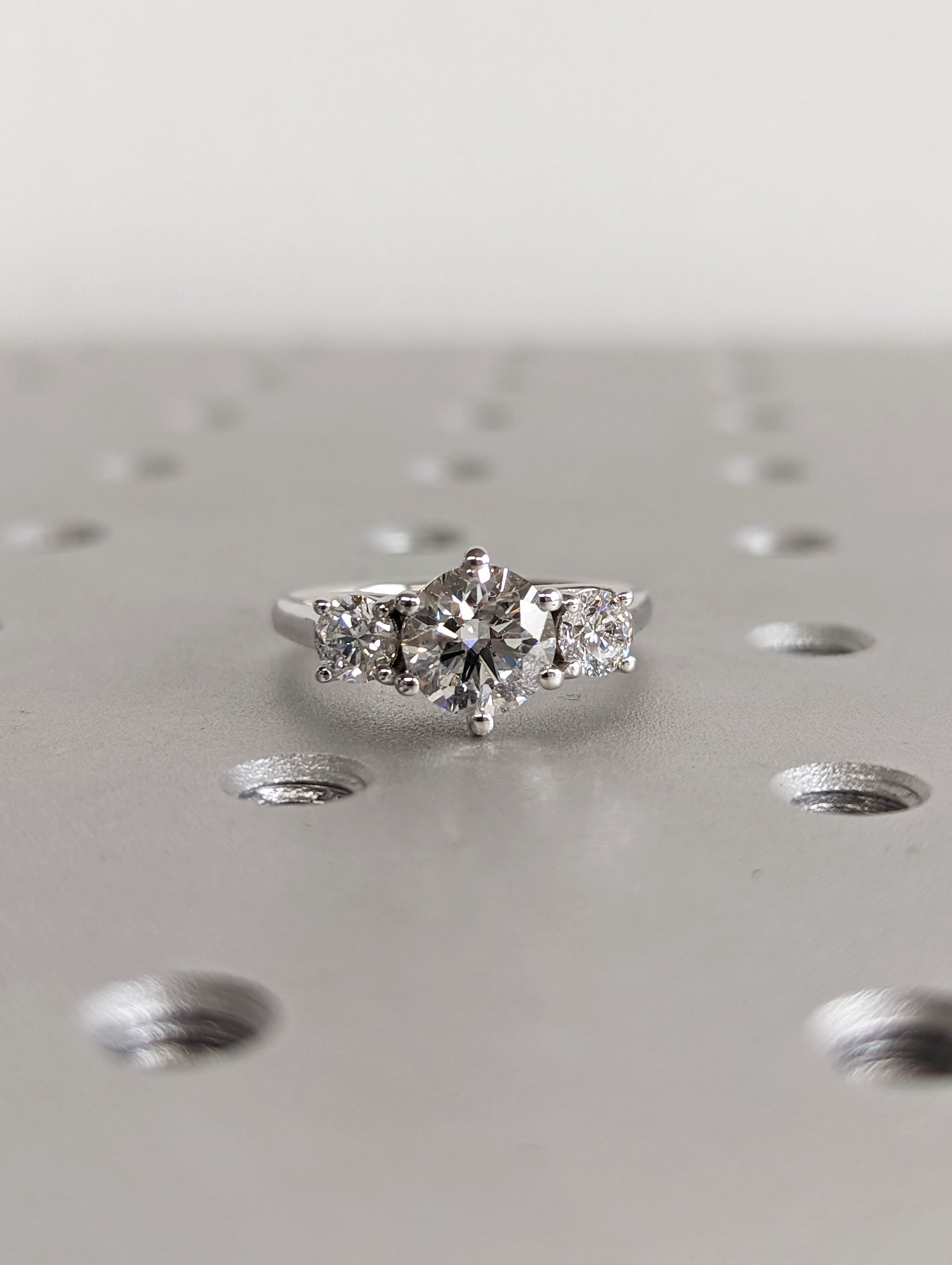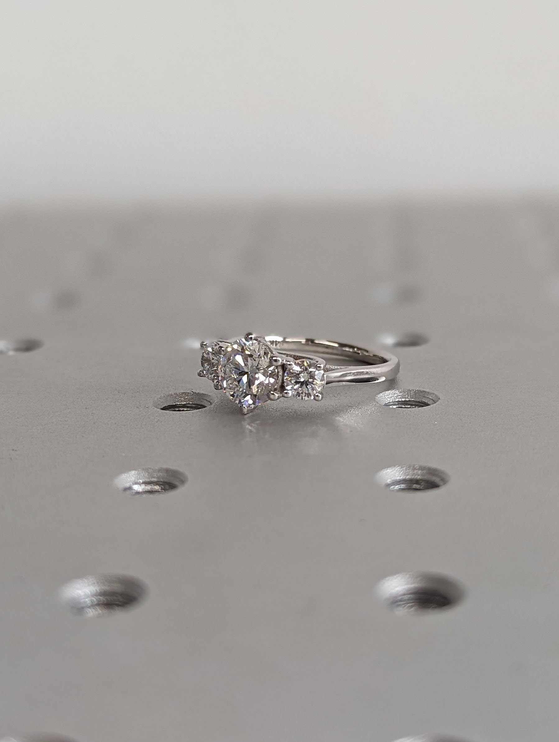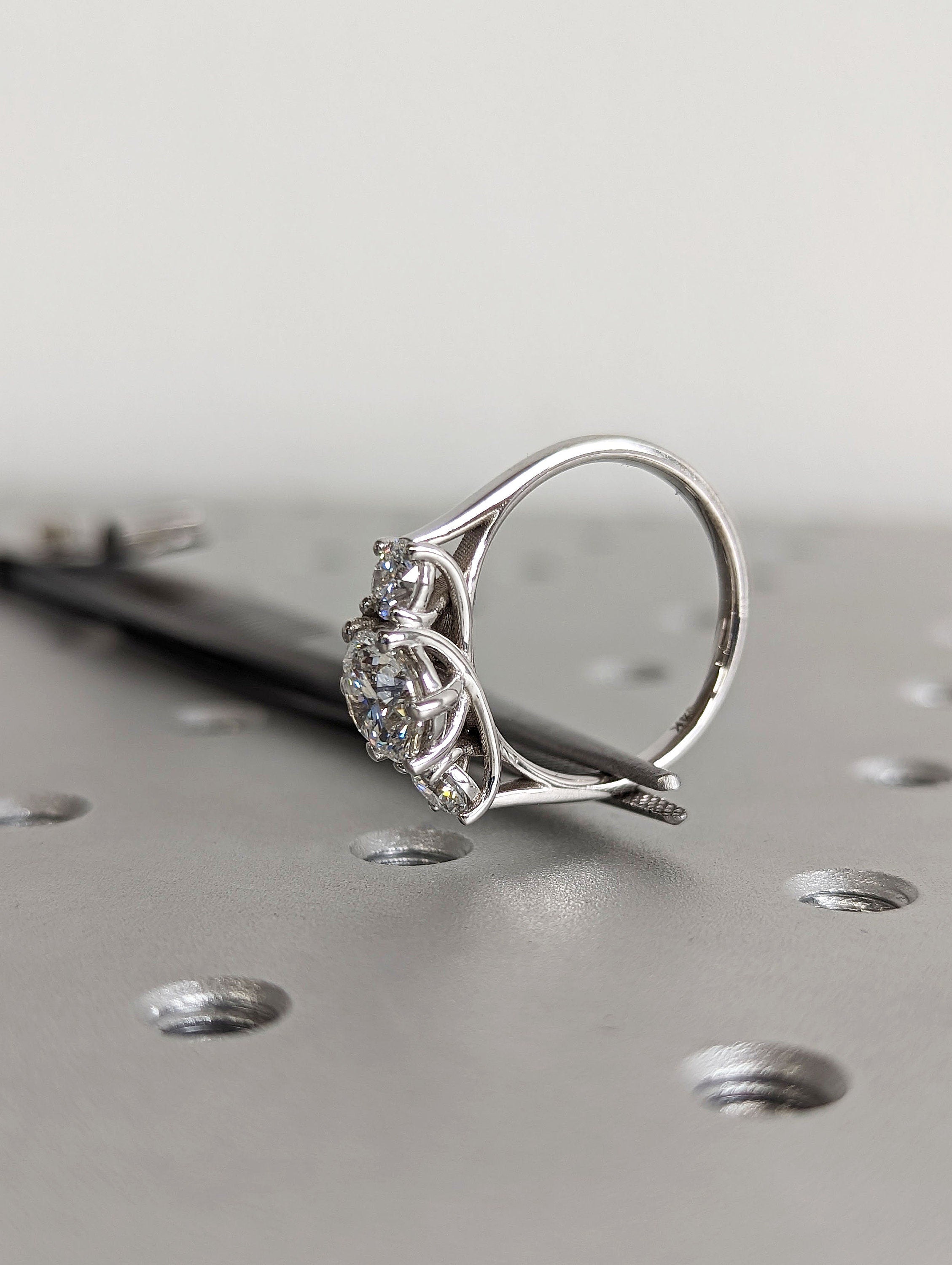An intertwined 6 prongs, elegantly grasped our beautiful round cut Moissanite above an open gallery, to form the centerpiece of this minimalist ring. Accented by either lab diamond or moissanite on a thin band, this timeless handcrafted piece makes a great wedding jewelry, symbolizing the journey of a couple's relationship. With its two side stone representing the past and the future, and the centre gemstone symbolizes the present moment.