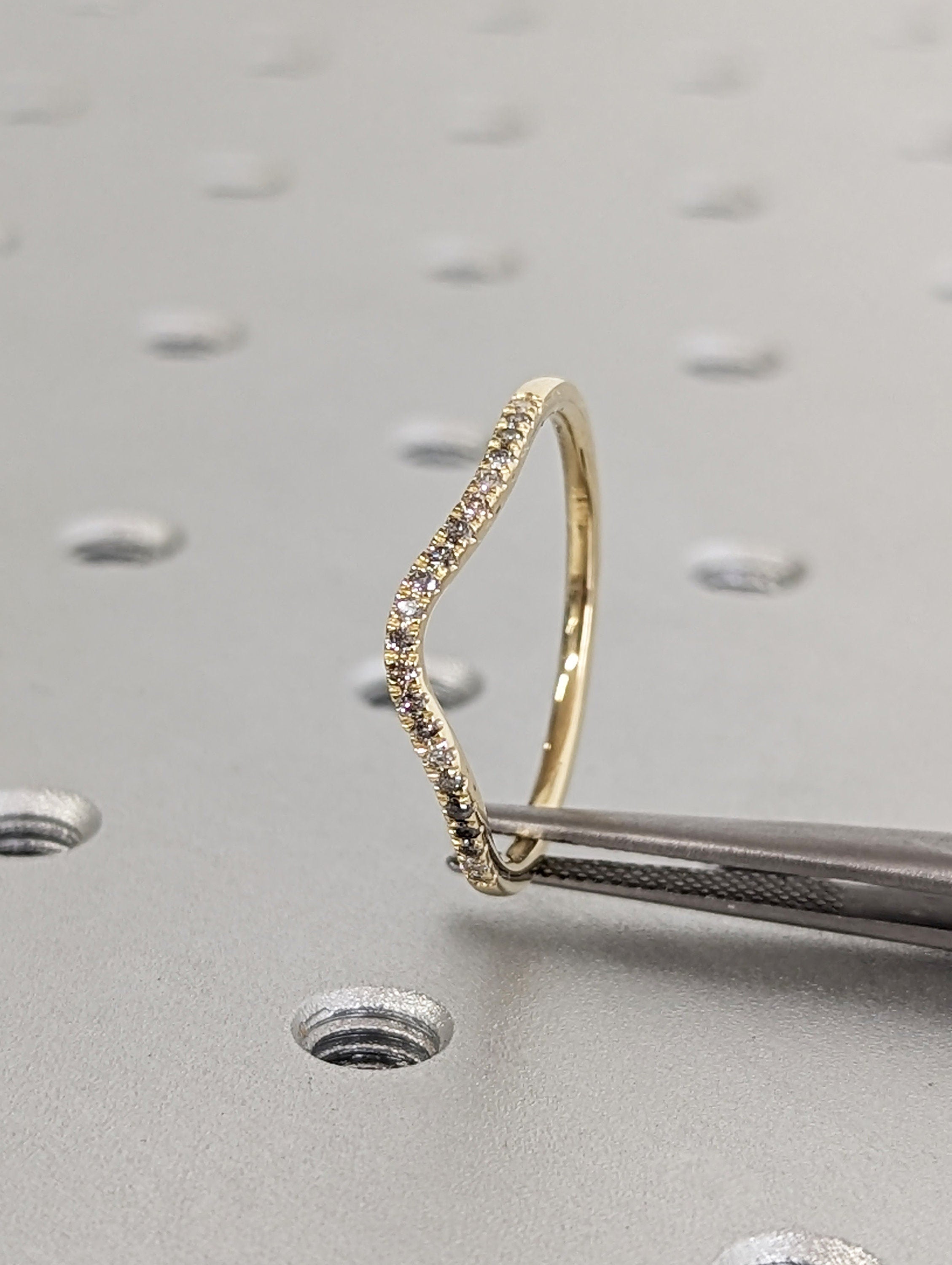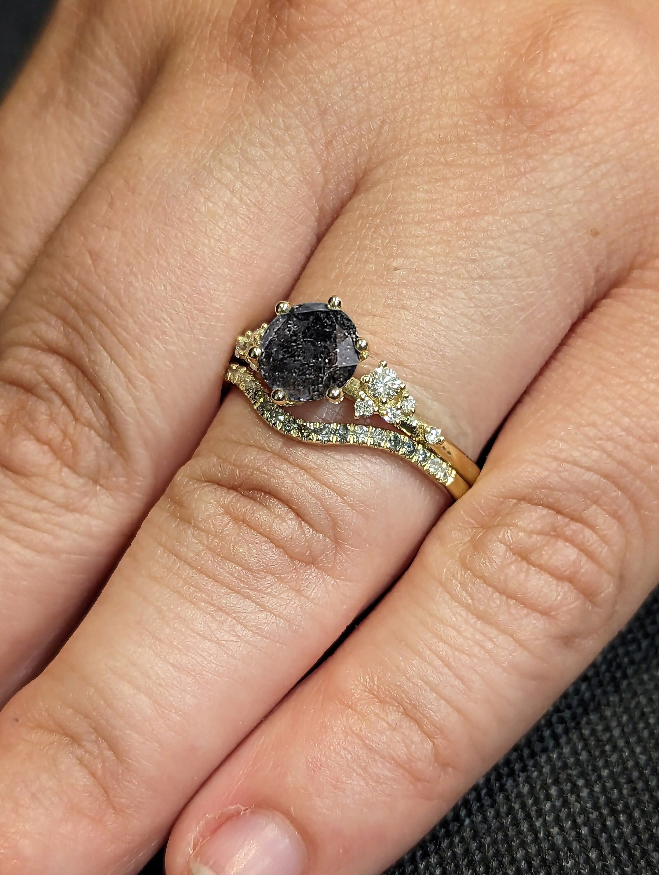 A beautiful round cut Salt and Pepper Diamond, set with a classic 6 prongs setting on a delicate thin band. Paved with a snowdrift clusters of Moissanites or Natural Diamonds from both sides, this ring exudes timeless elegance. For an extra touch of glamour, pair it with our curved dainty wedding ring of 1.6mm width, paved with a row of Salt and Pepper Diamonds.