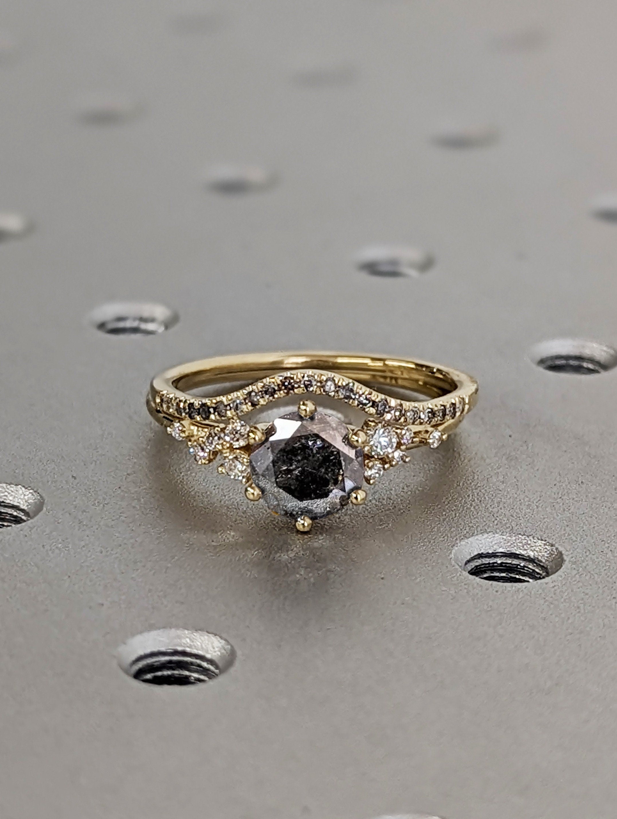 1.5ct Round Salt and Pepper Diamond Engagement Ring Set | 14K Yellow Gold Snowdrift Moissanites Cluster Ring | Custom Bridal Jewelry for Her