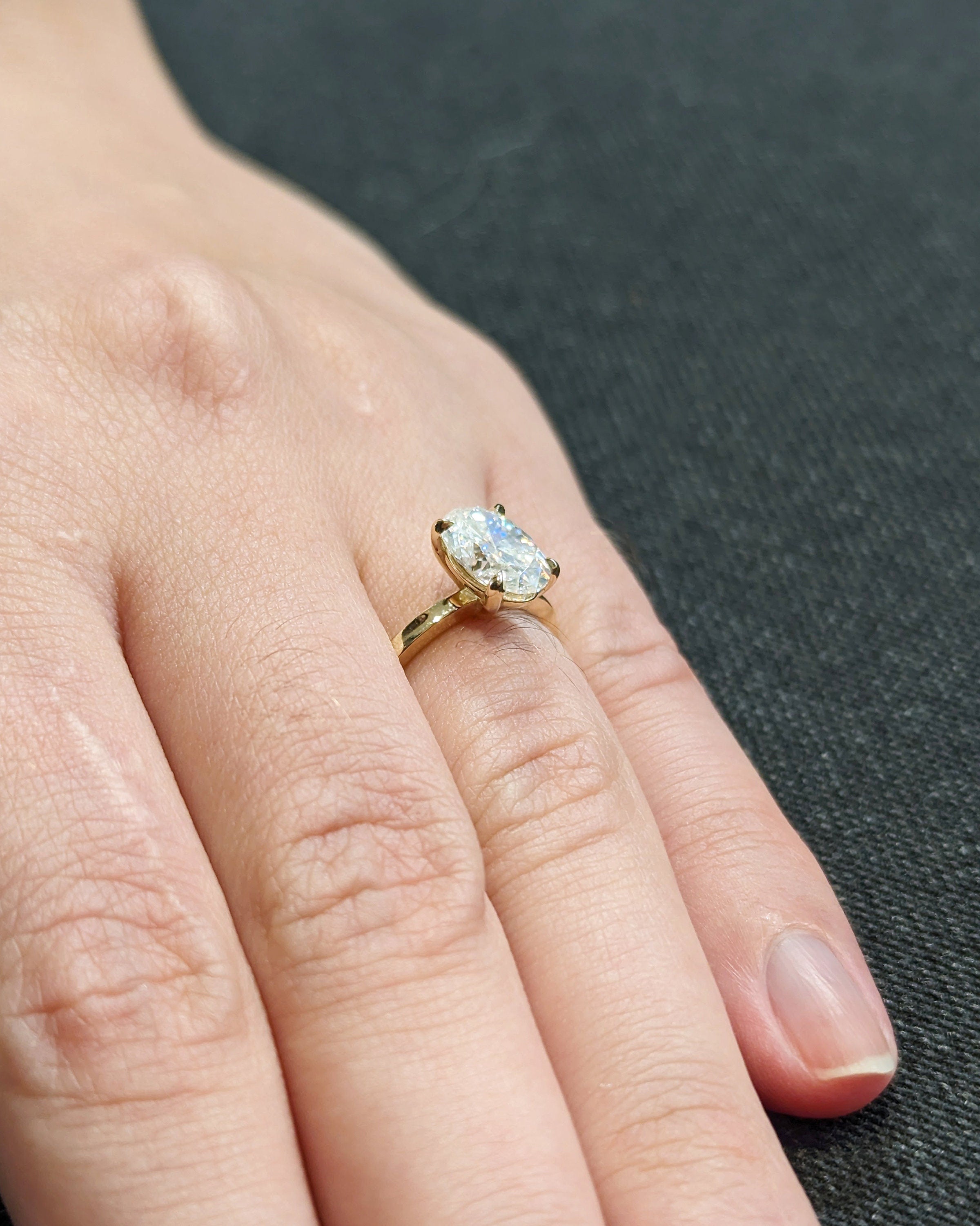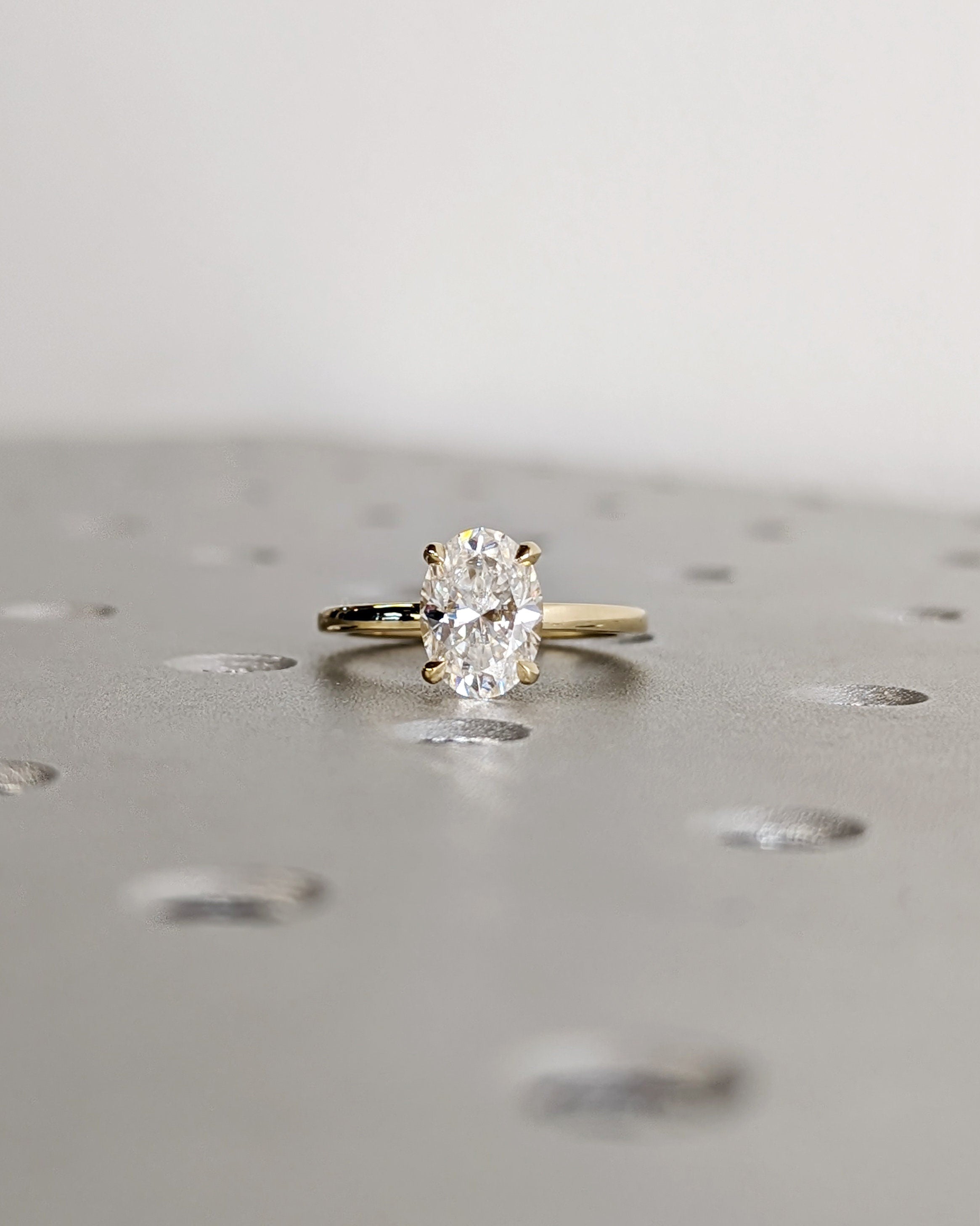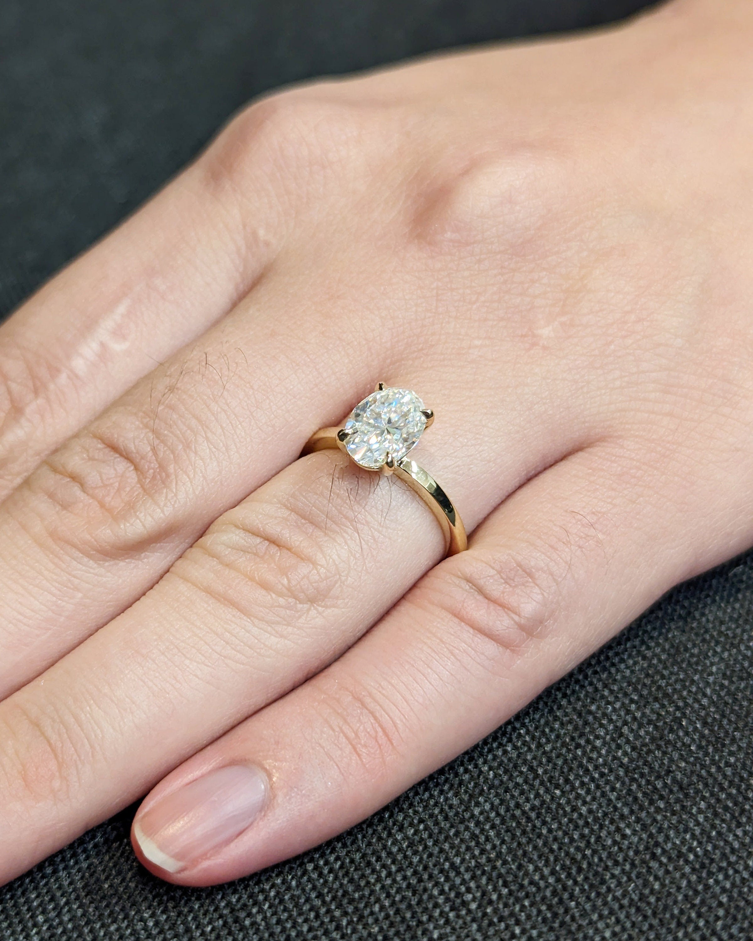 Our oval shaped Moissanite ring set in a classic Talon Prong setting, radiates timeless elegance. Its thin band of 1.6mm adds a touch of minimalist charm, making it the perfect accessory or gift for any occasion.