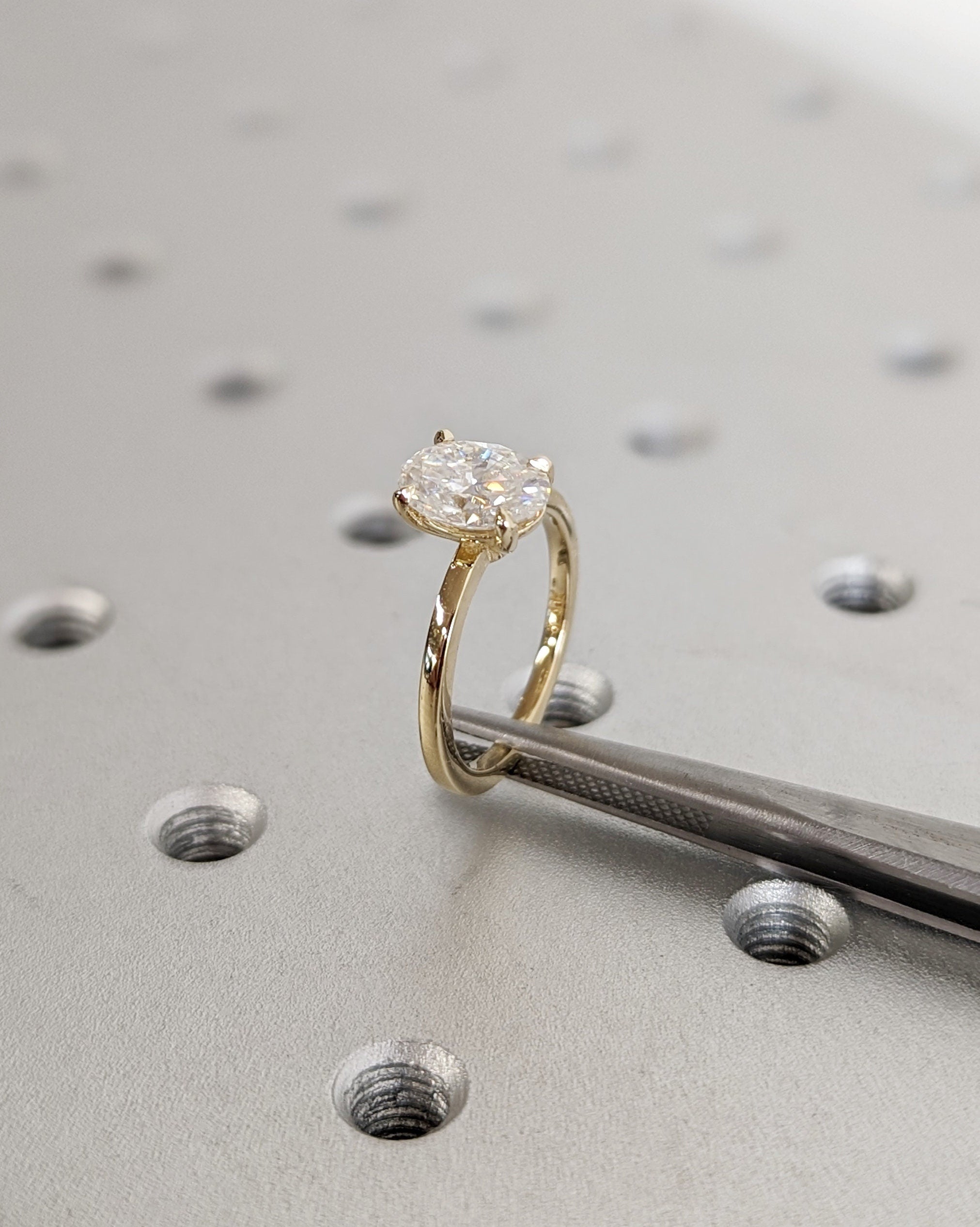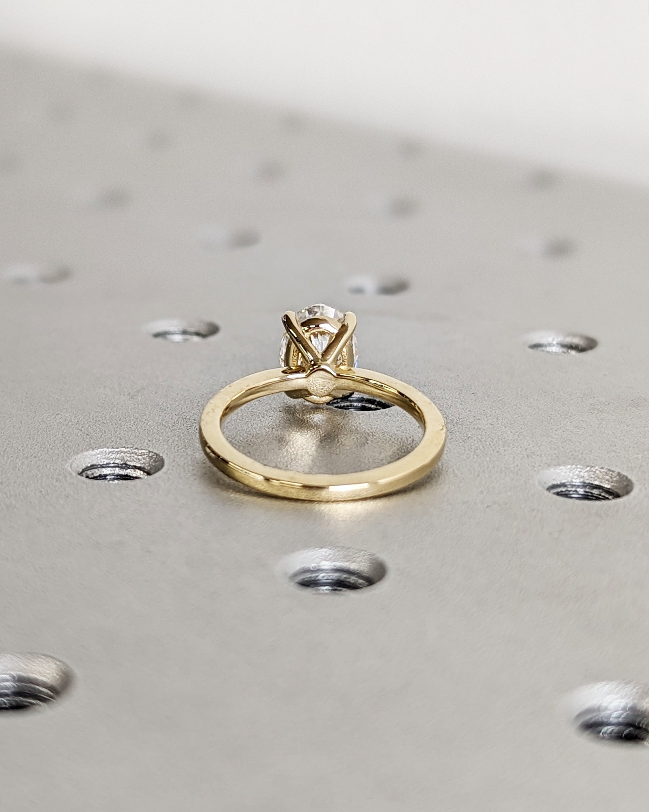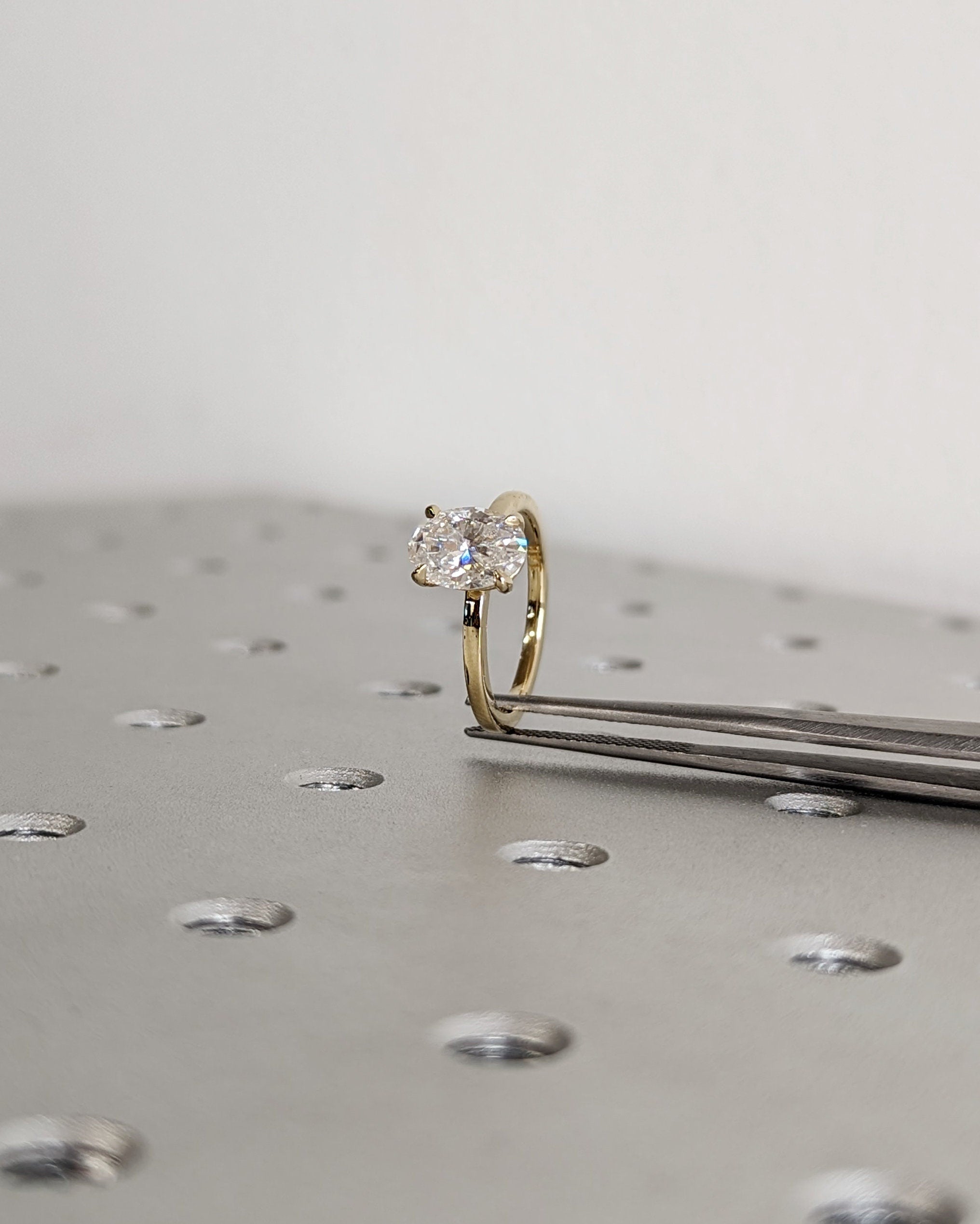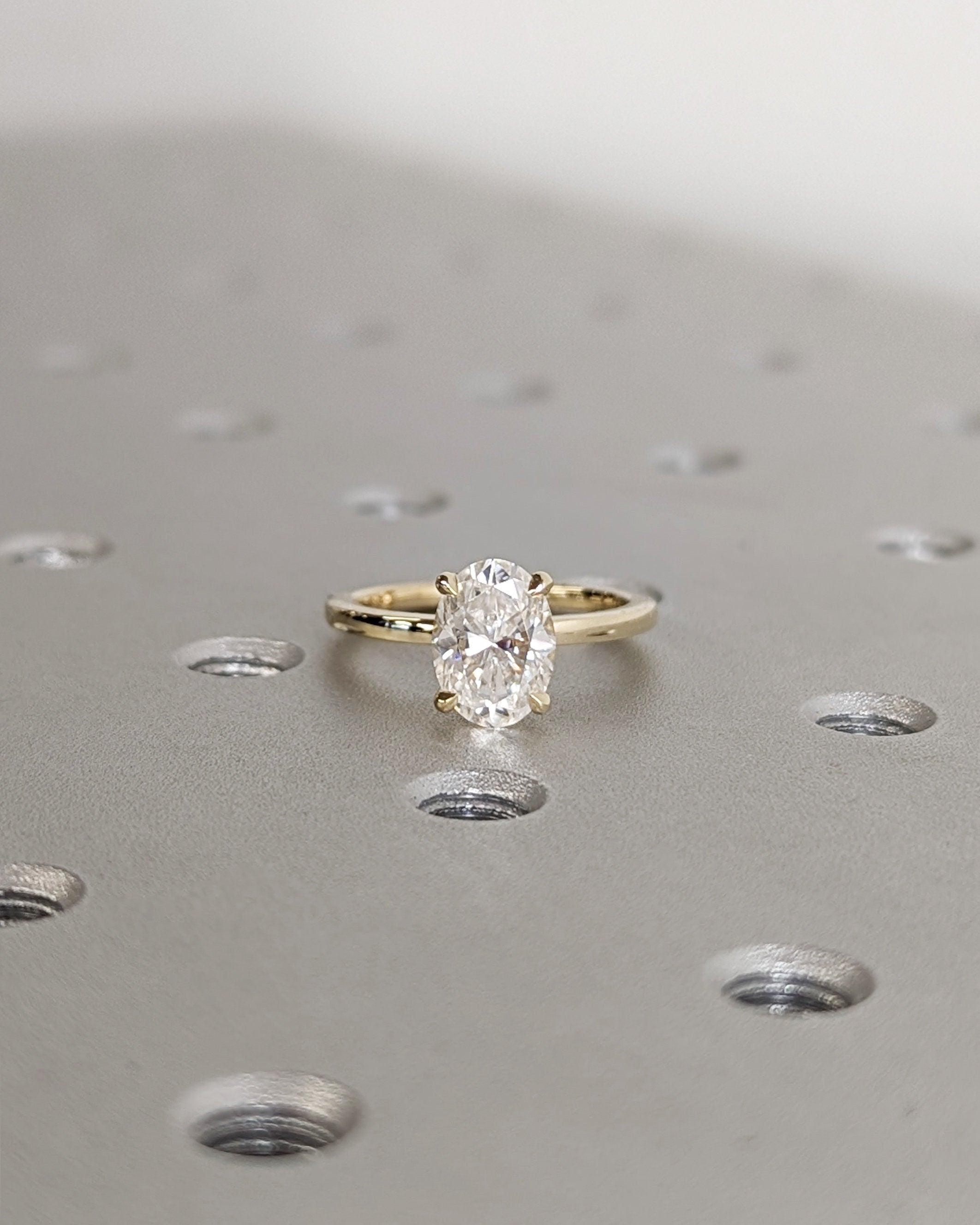 Our oval shaped Moissanite ring set in a classic Talon Prong setting, radiates timeless elegance. Its thin band of 1.6mm adds a touch of minimalist charm, making it the perfect accessory or gift for any occasion.