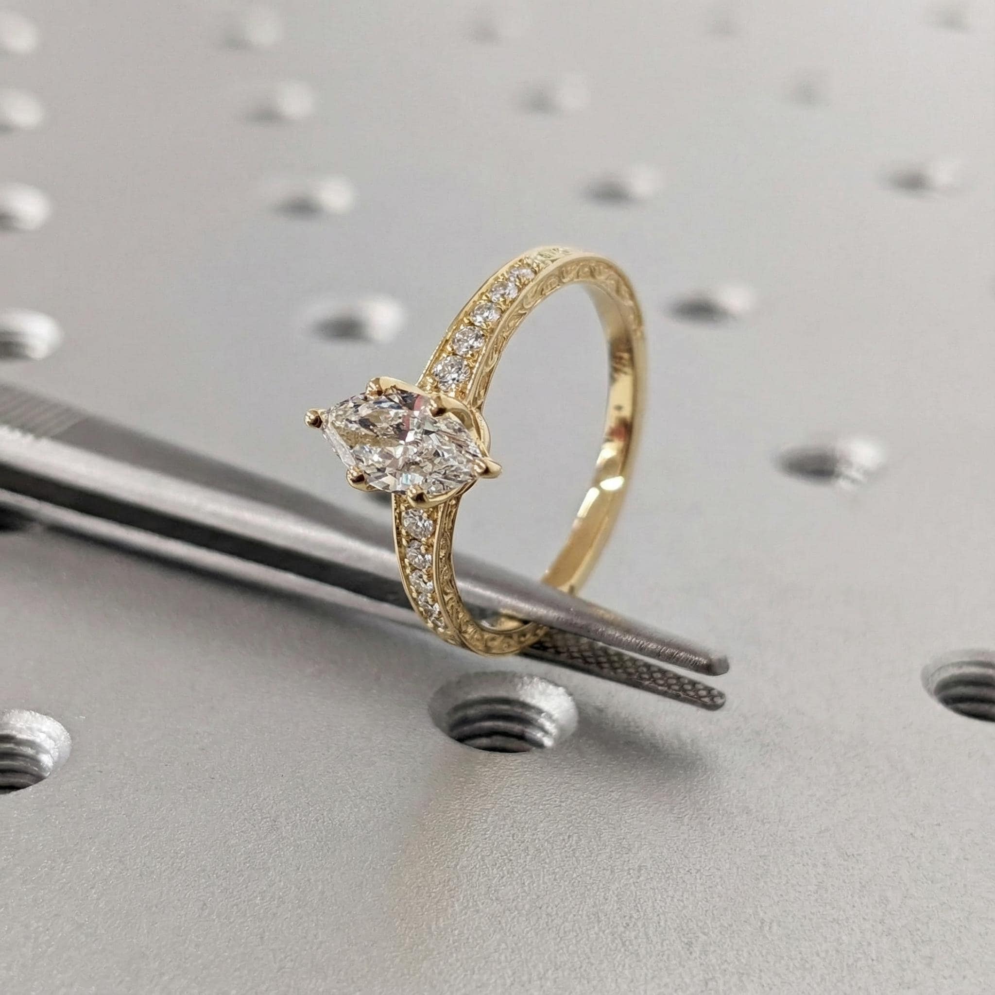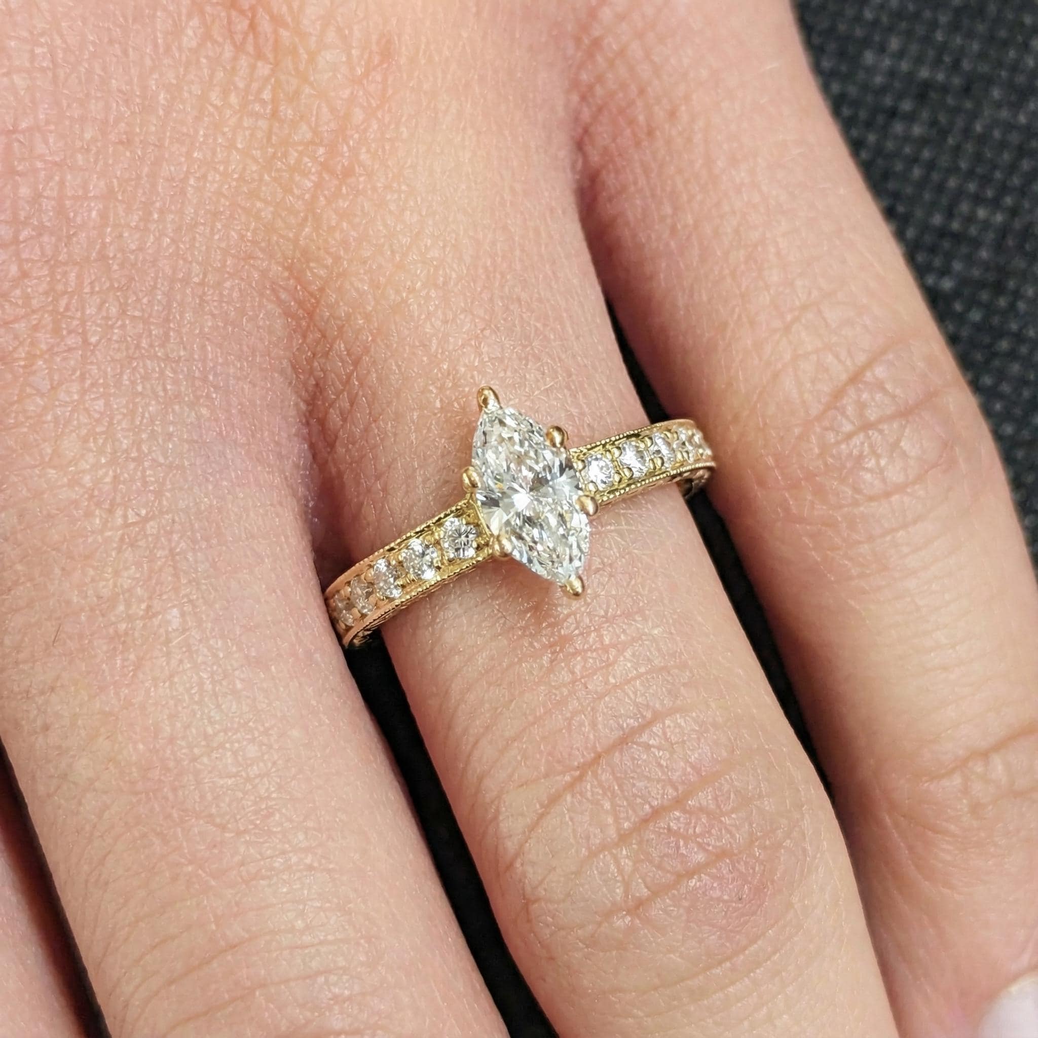 18k Gold Filigree Engagement Ring, Marquise Cut Lab Diamond Ring, Moissanite Pave