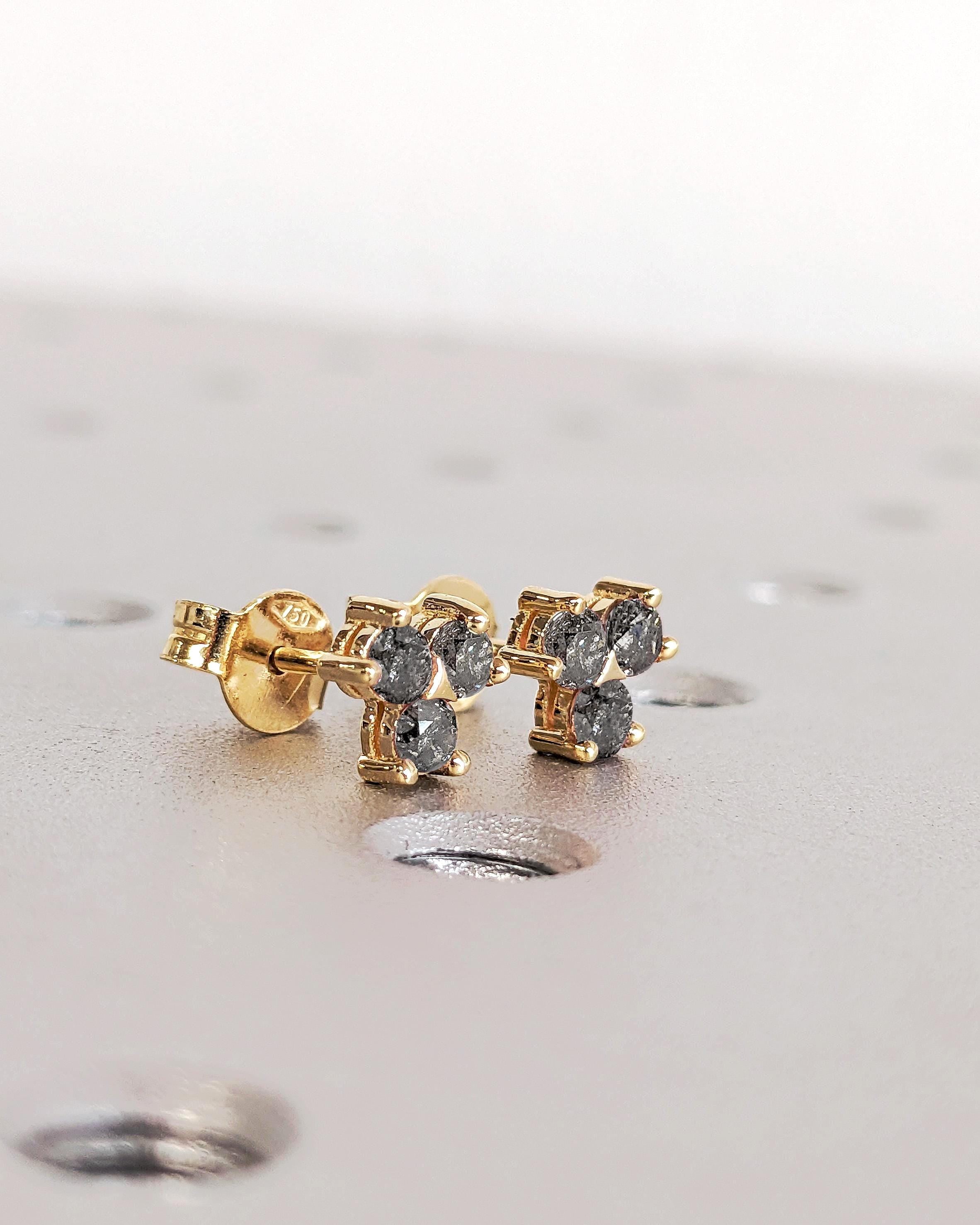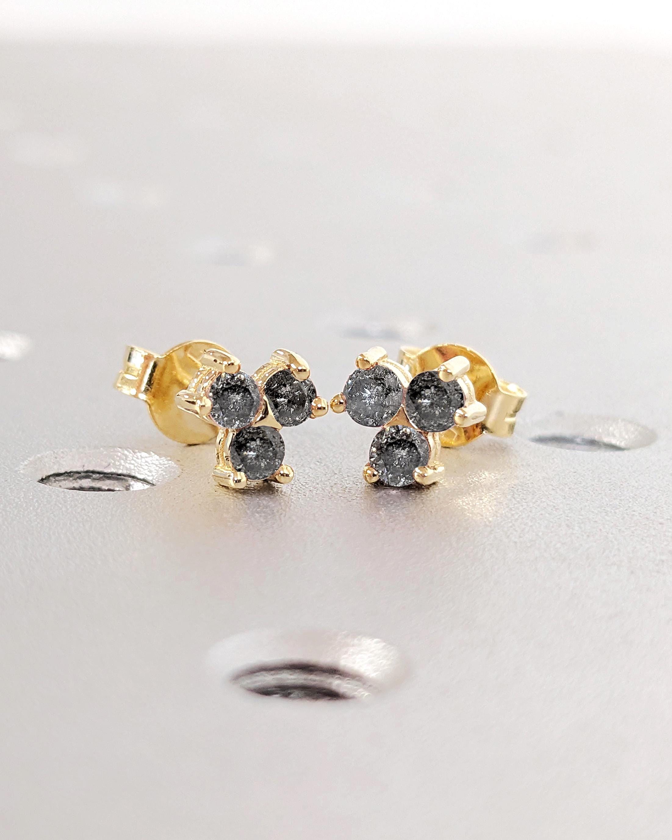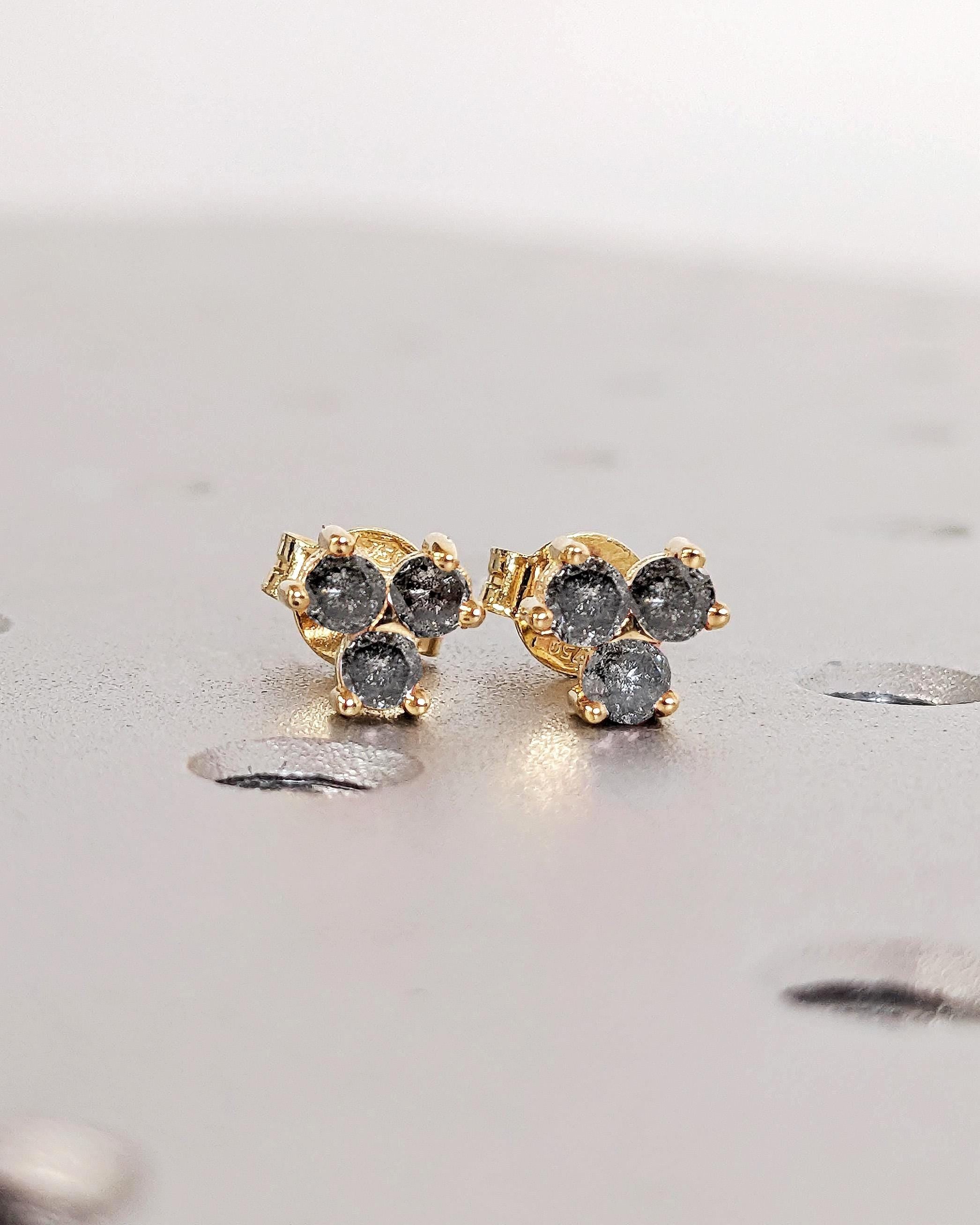 These earrings feature three round Salt and Pepper Diamonds set in a refined cluster design. Secured with screw back posts for comfort, they offer timeless elegance and make a distinctive gift or a sophisticated addition to any jewelry collection.