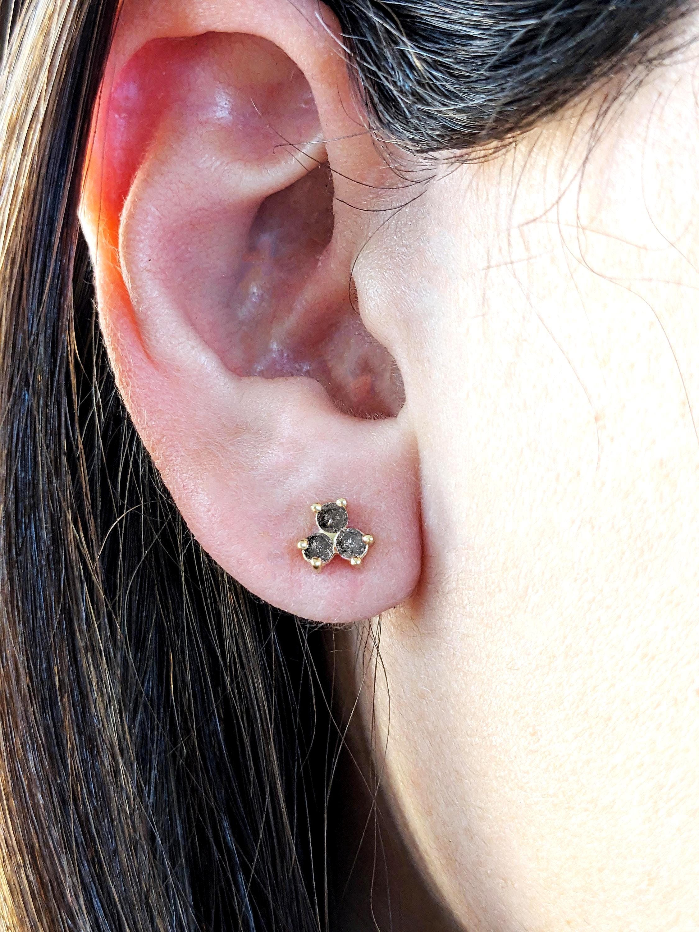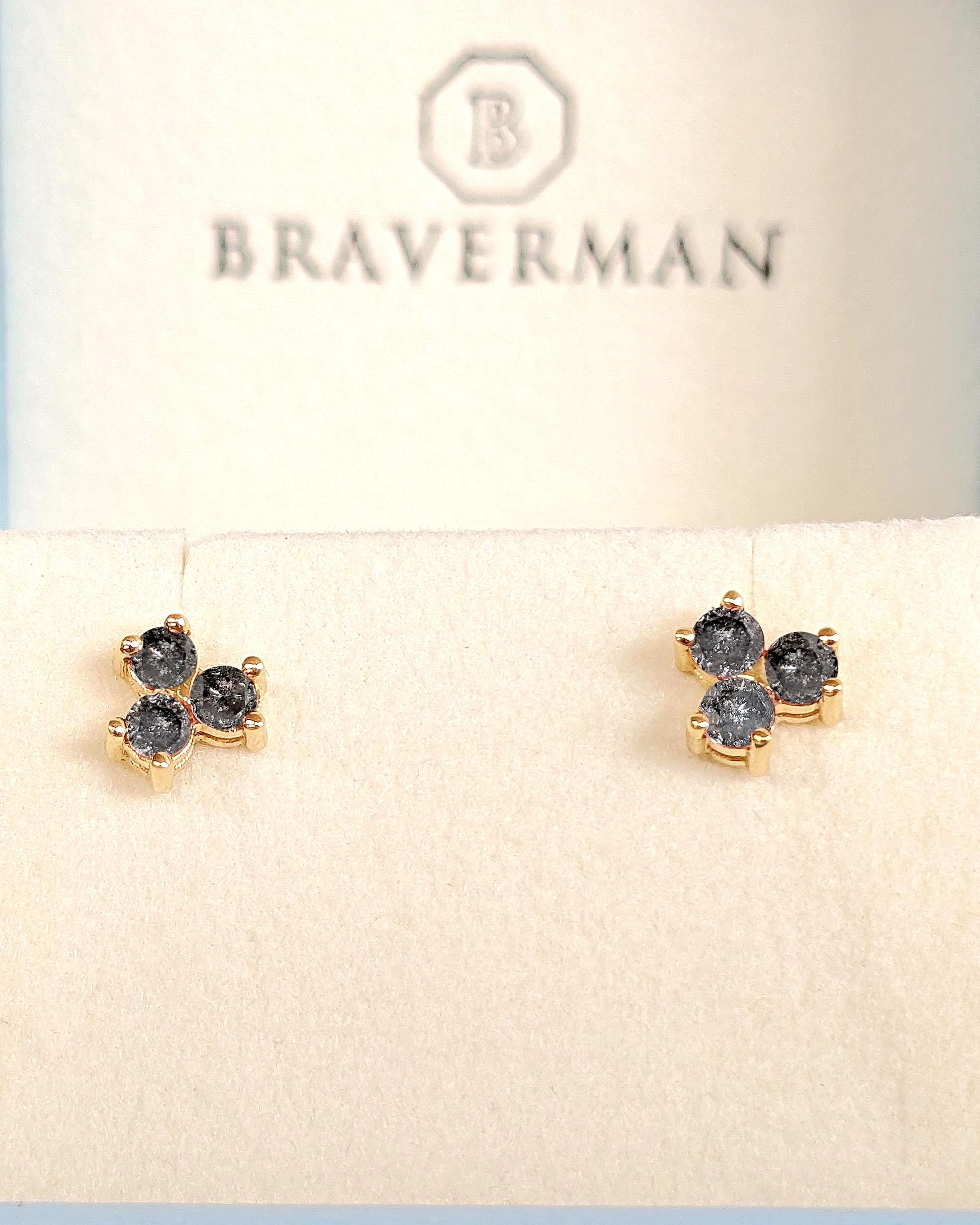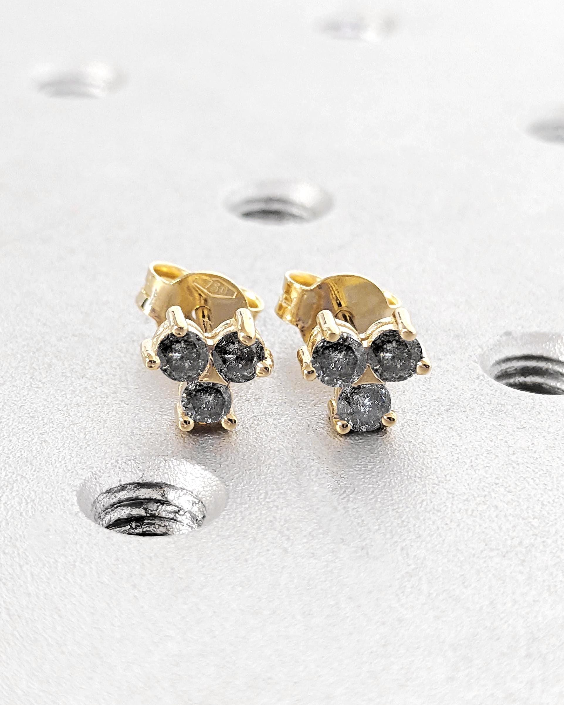 These earrings feature three round Salt and Pepper Diamonds set in a refined cluster design. Secured with screw back posts for comfort, they offer timeless elegance and make a distinctive gift or a sophisticated addition to any jewelry collection.