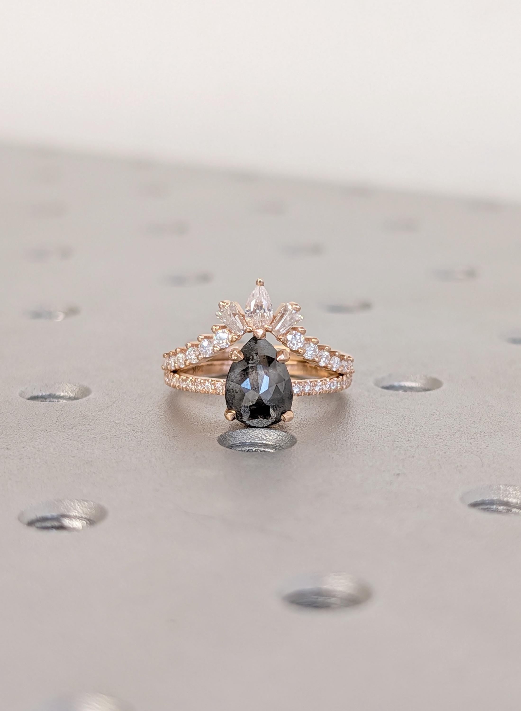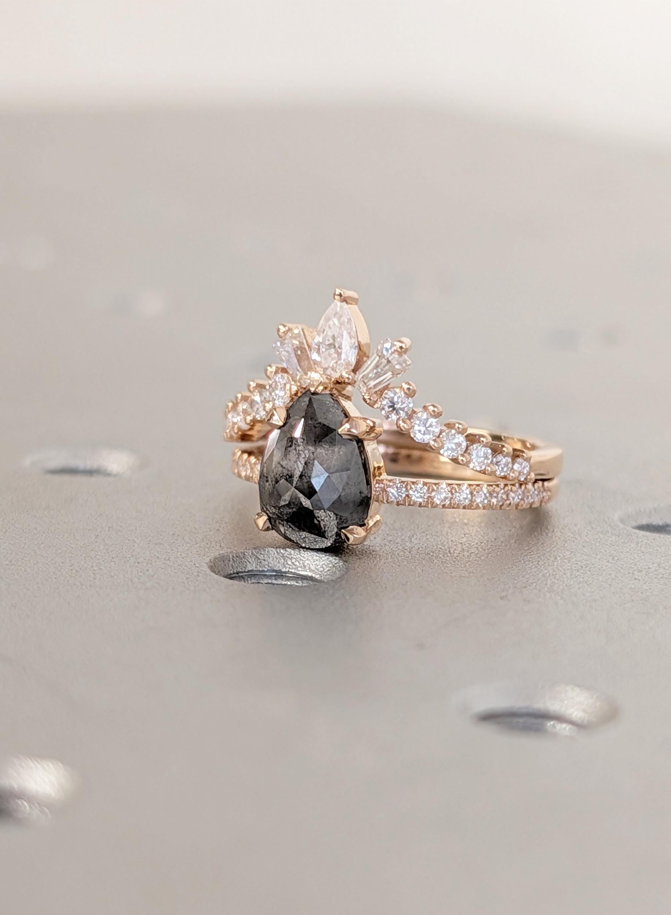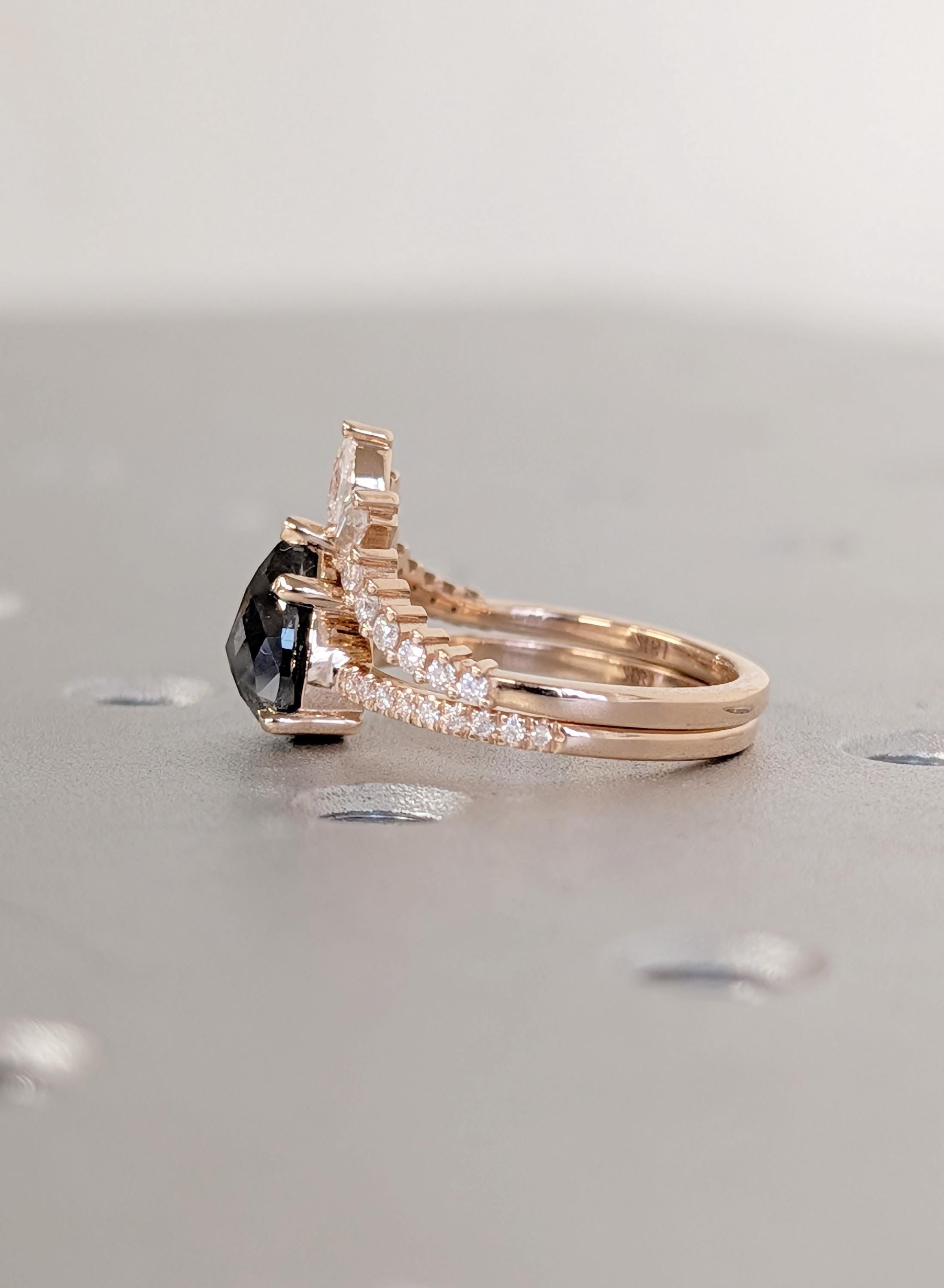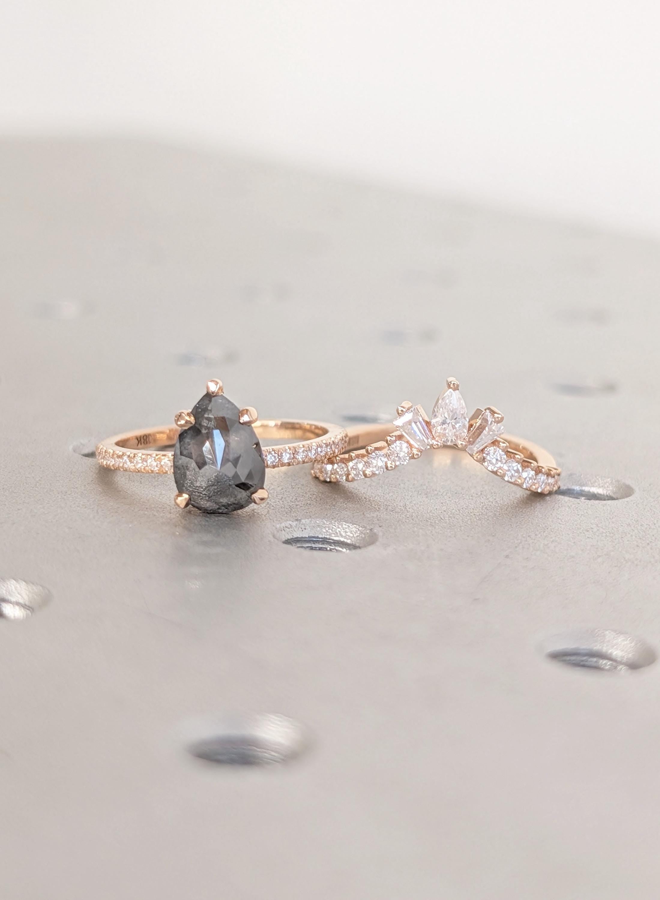 18K Rose Gold Wedding Ring Sets, Pear Salt and Pepper Vintage Engagement Ring, Bridal Ring Set For Woman, Solid Gold Diamond Matching Band