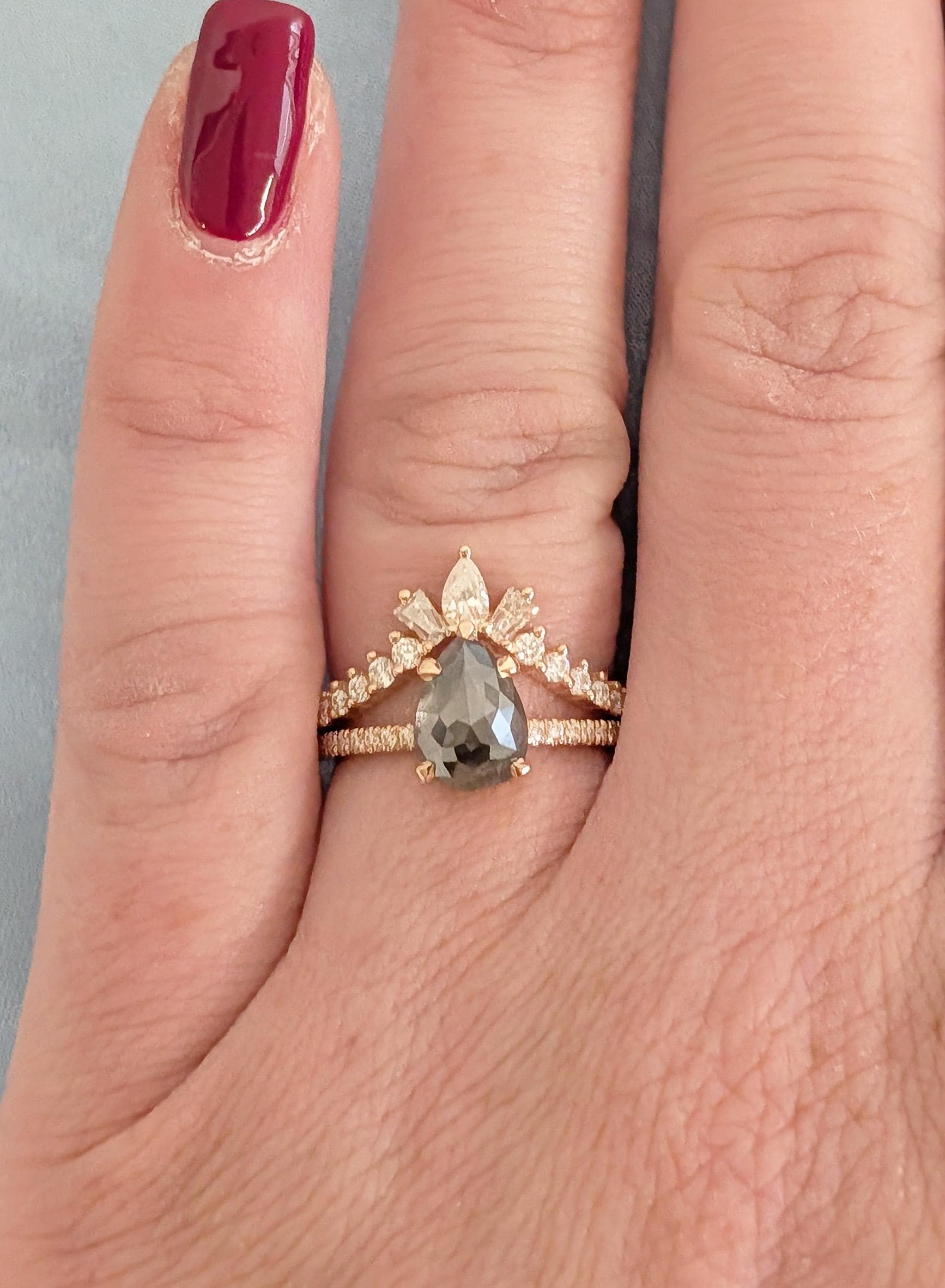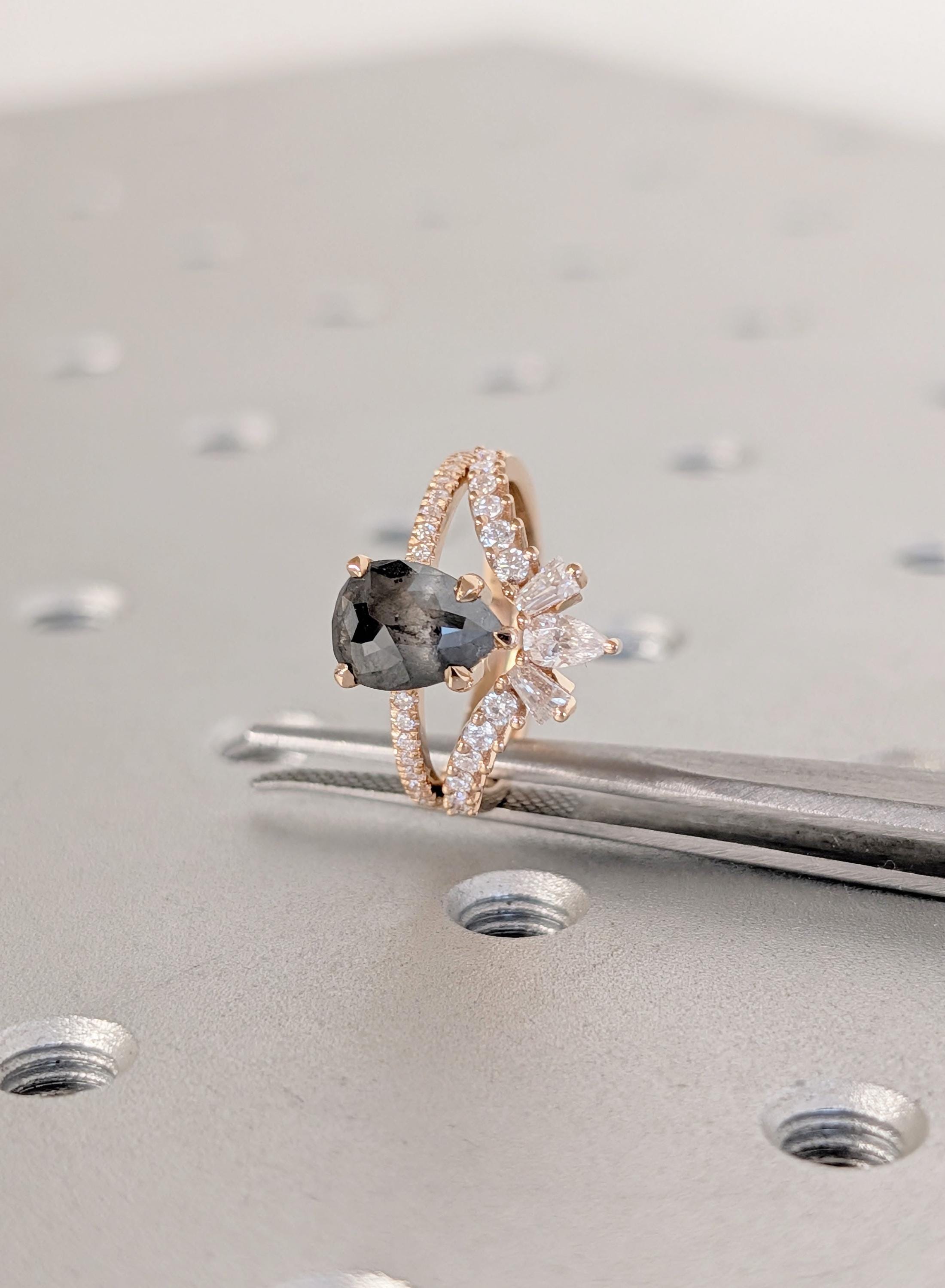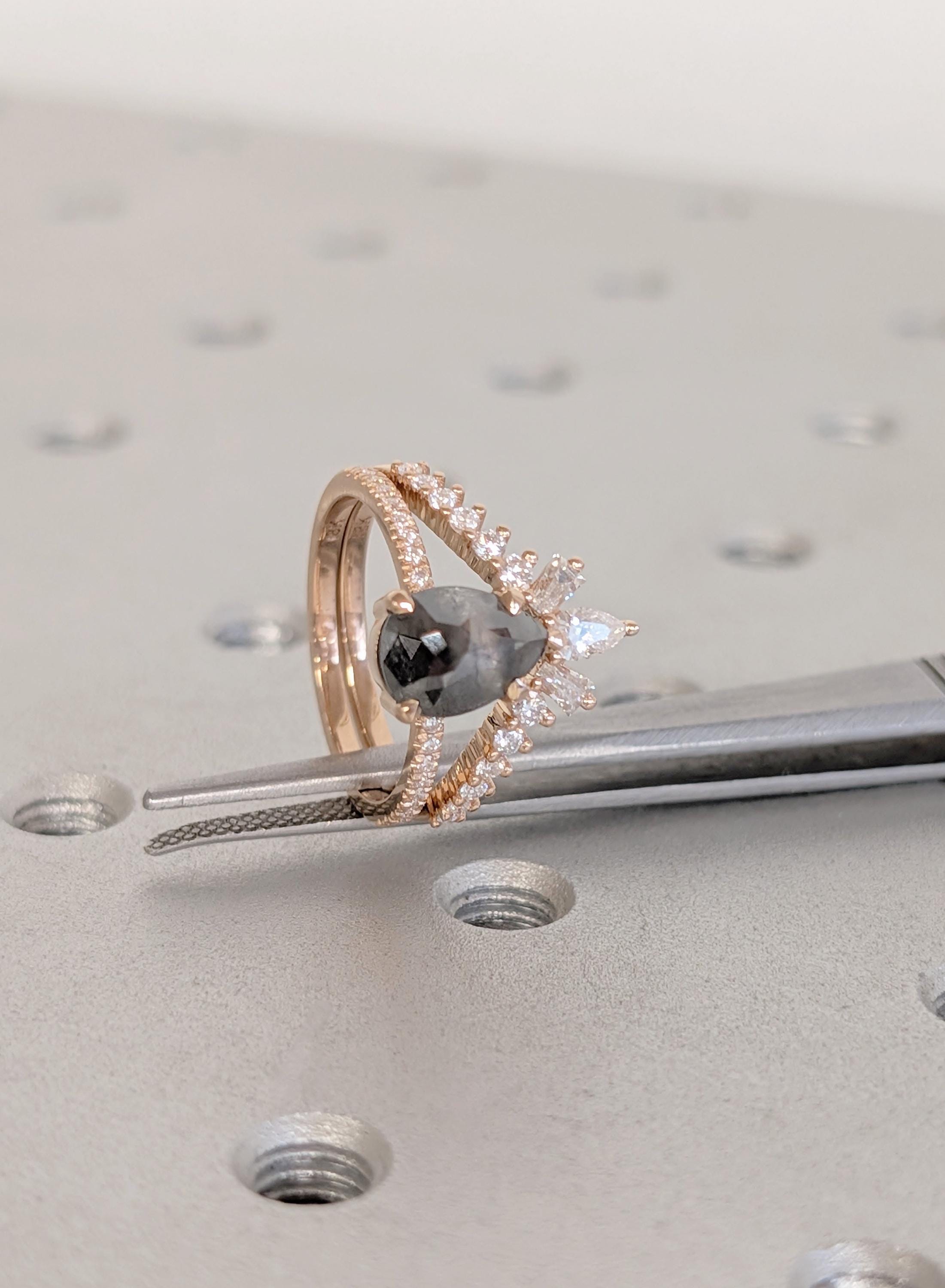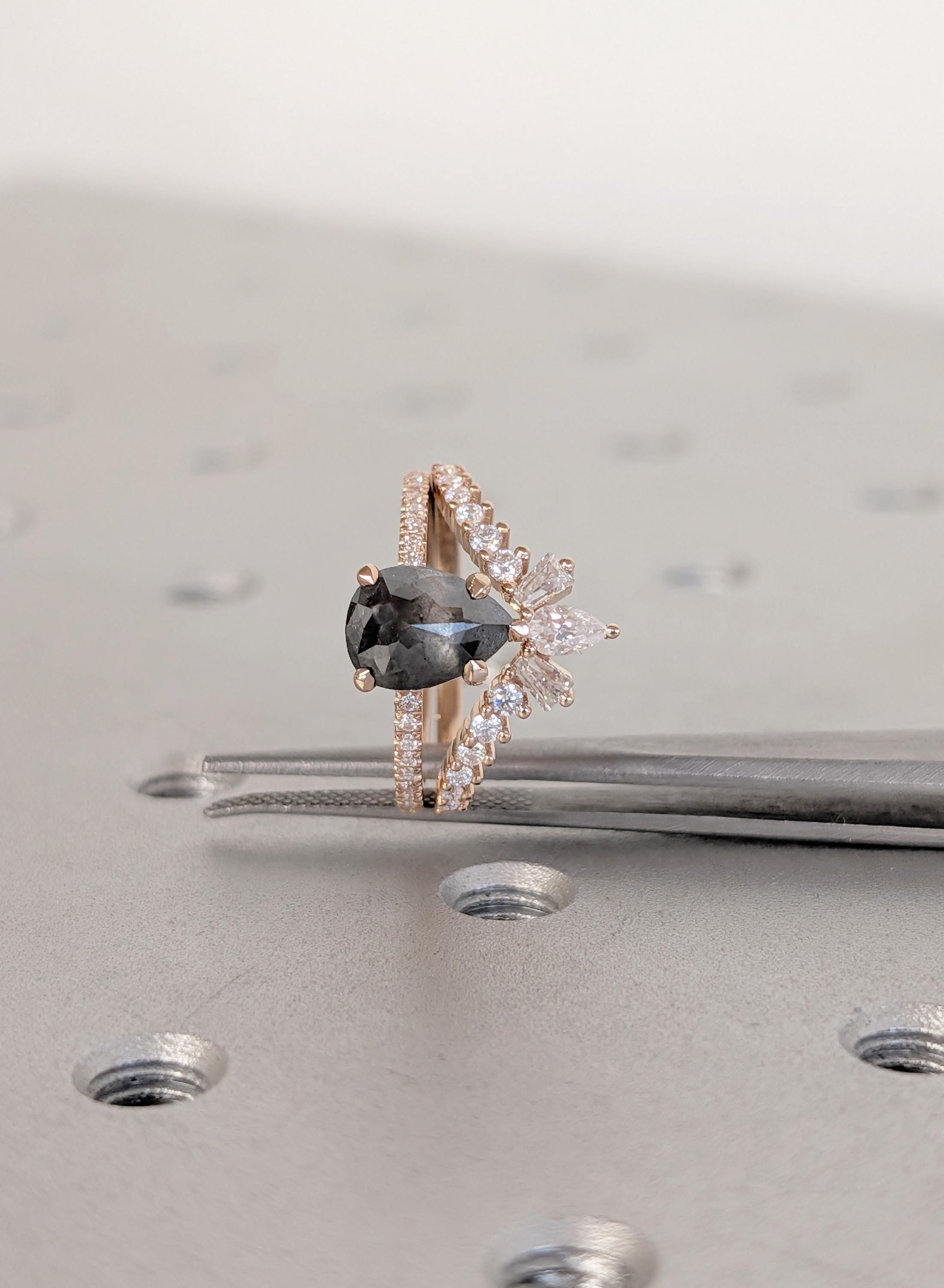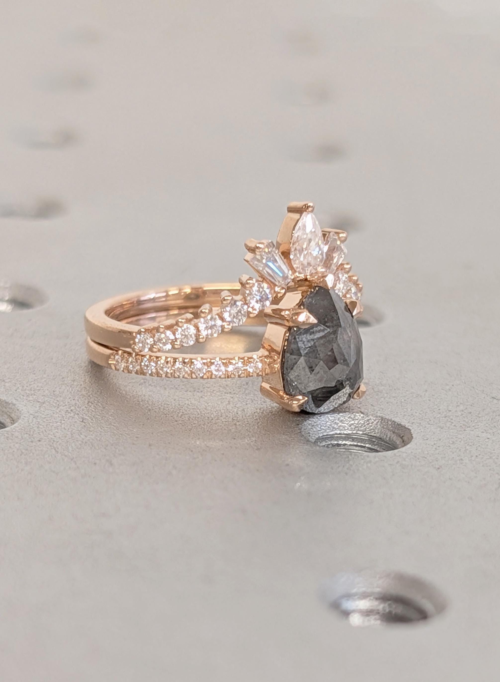 18K Rose Gold Wedding Ring Sets, Pear Salt and Pepper Vintage Engagement Ring, Bridal Ring Set For Woman, Solid Gold Diamond Matching Band