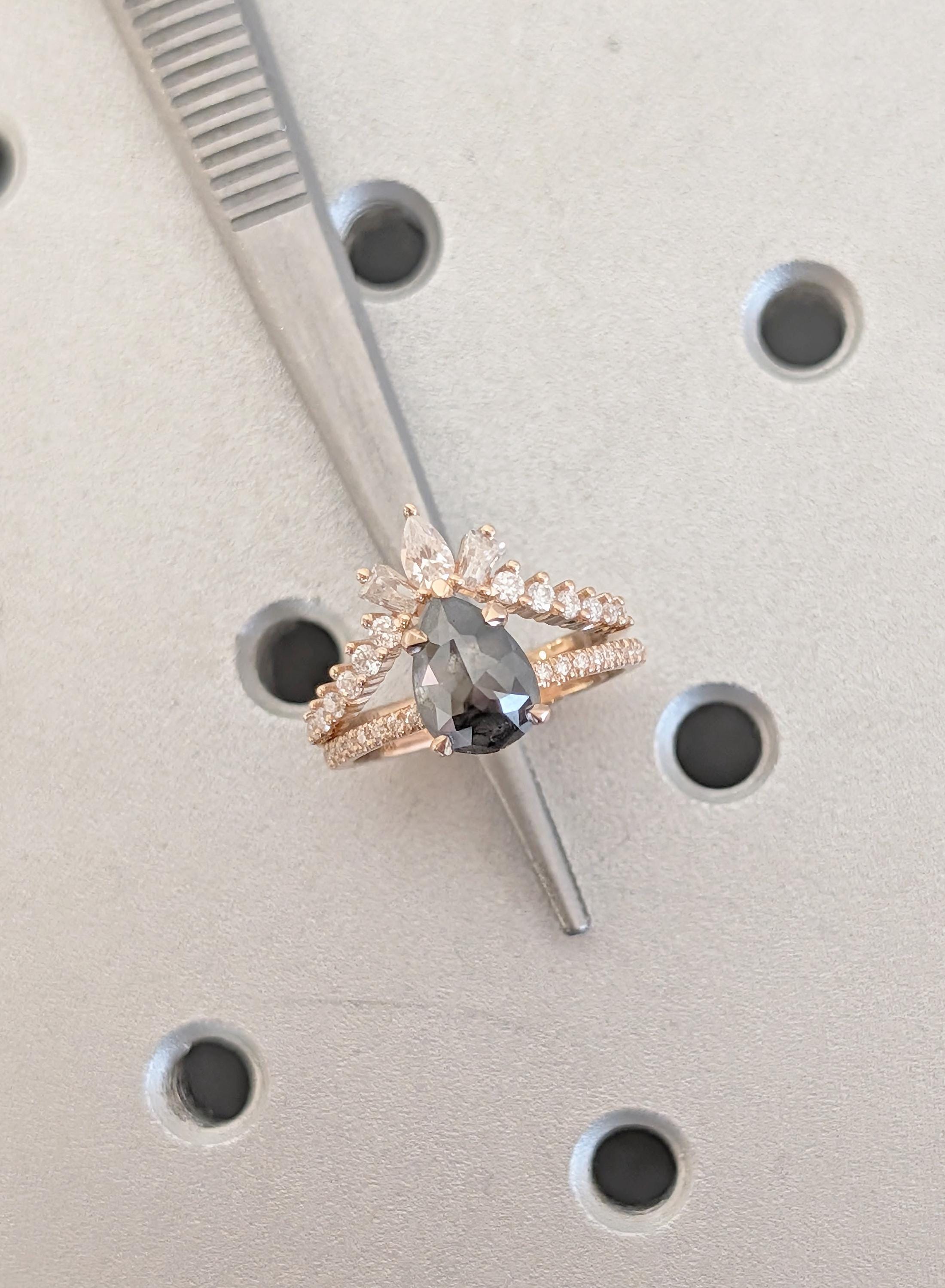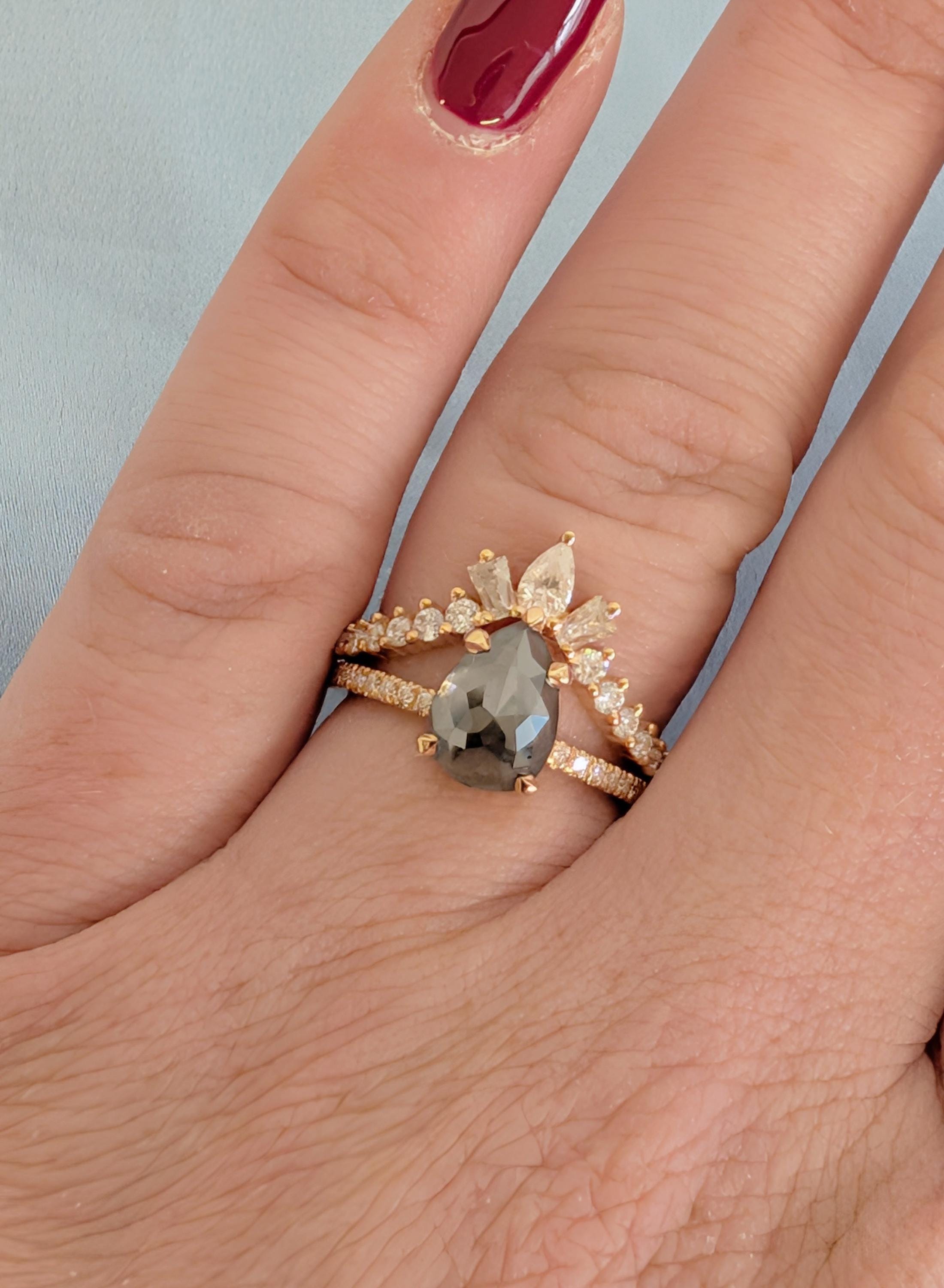 This bridal set centers around a pear cut Natural Salt and Pepper Diamond held in a talon prong setting, paired with a slim pave band lined with round Natural Diamond side stones. The center stone’s organic texture adds character, while the soft sparkle along the band keeps the look balanced and refined. The matching band completes the set with baguette, pear, and round Natural Diamonds set in a mix of pave and prong settings, creating layered depth and gentle brilliance. Together, the rings form a timeless pairing suited for engagements, weddings, anniversaries, or meaningful everyday wear.