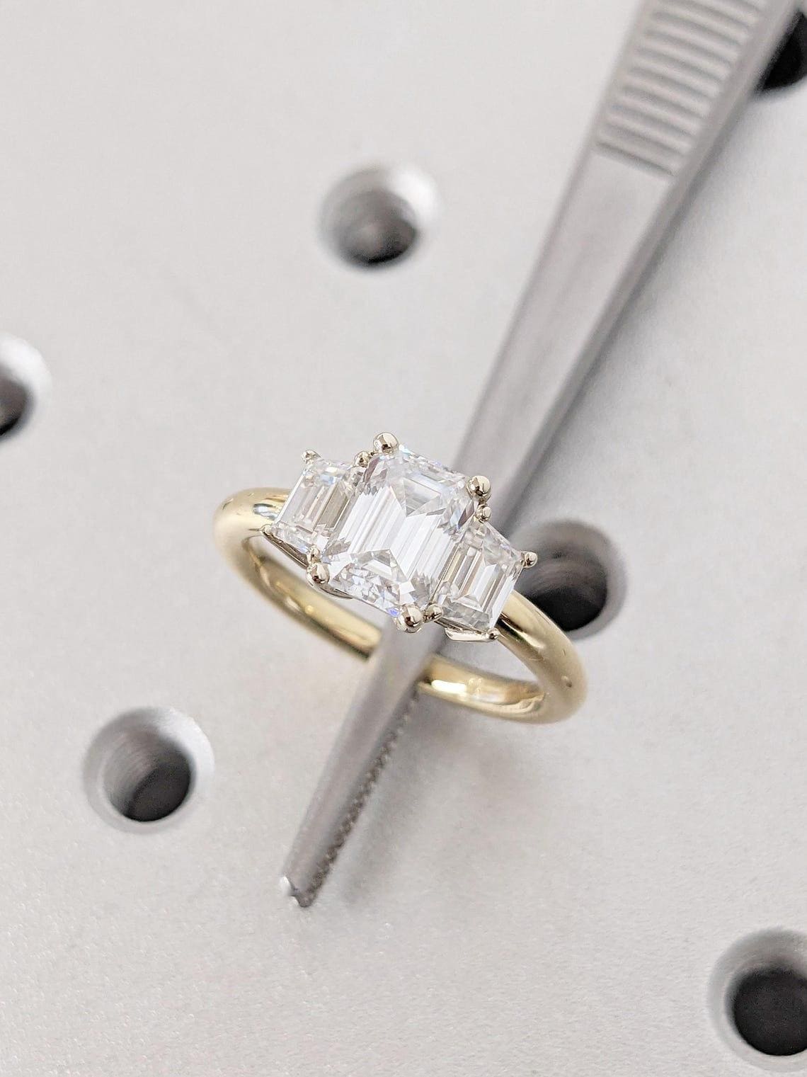 18k Solid Gold Emerald cut CVD Diamond Three Stone Promise Ring | Side Trapezoid