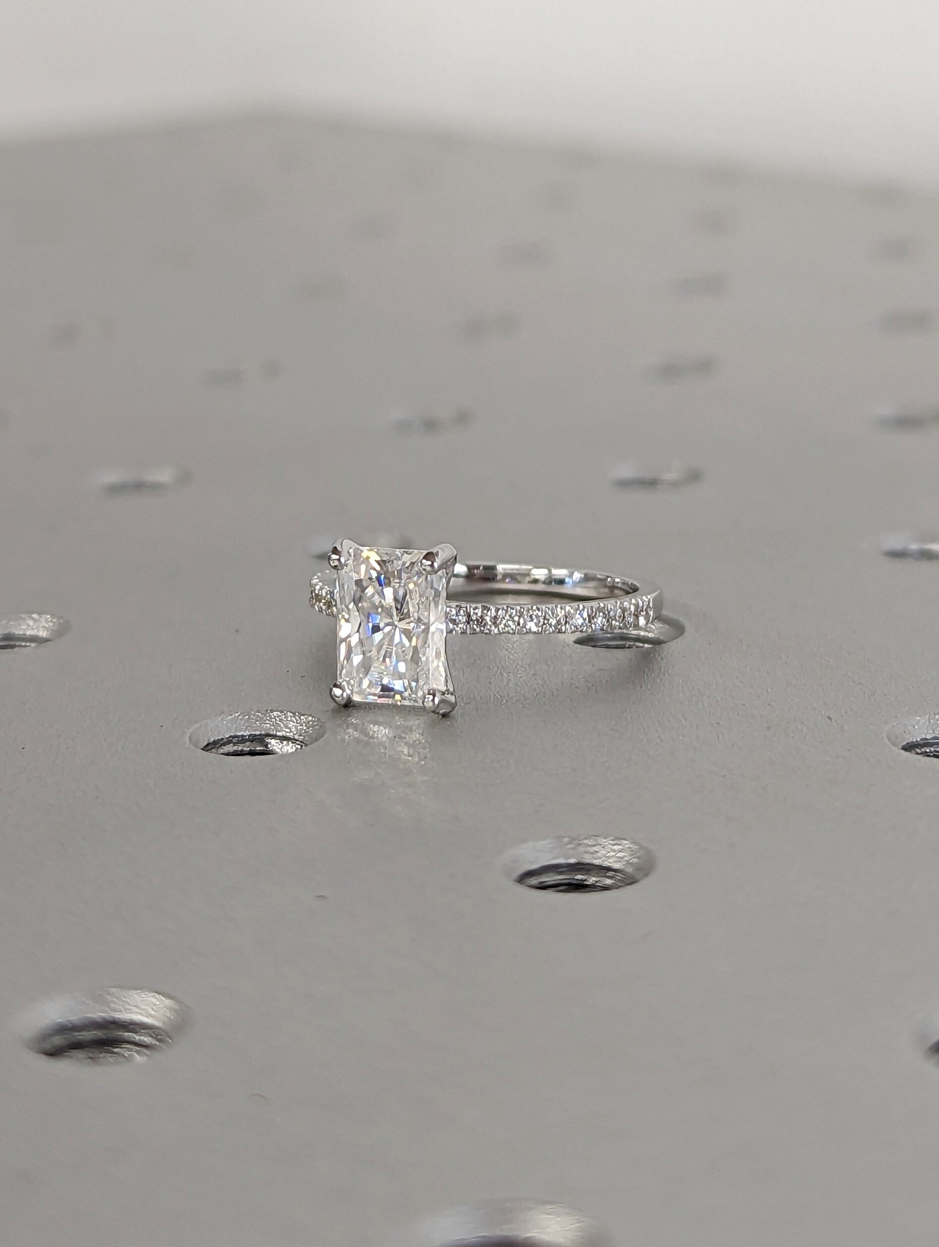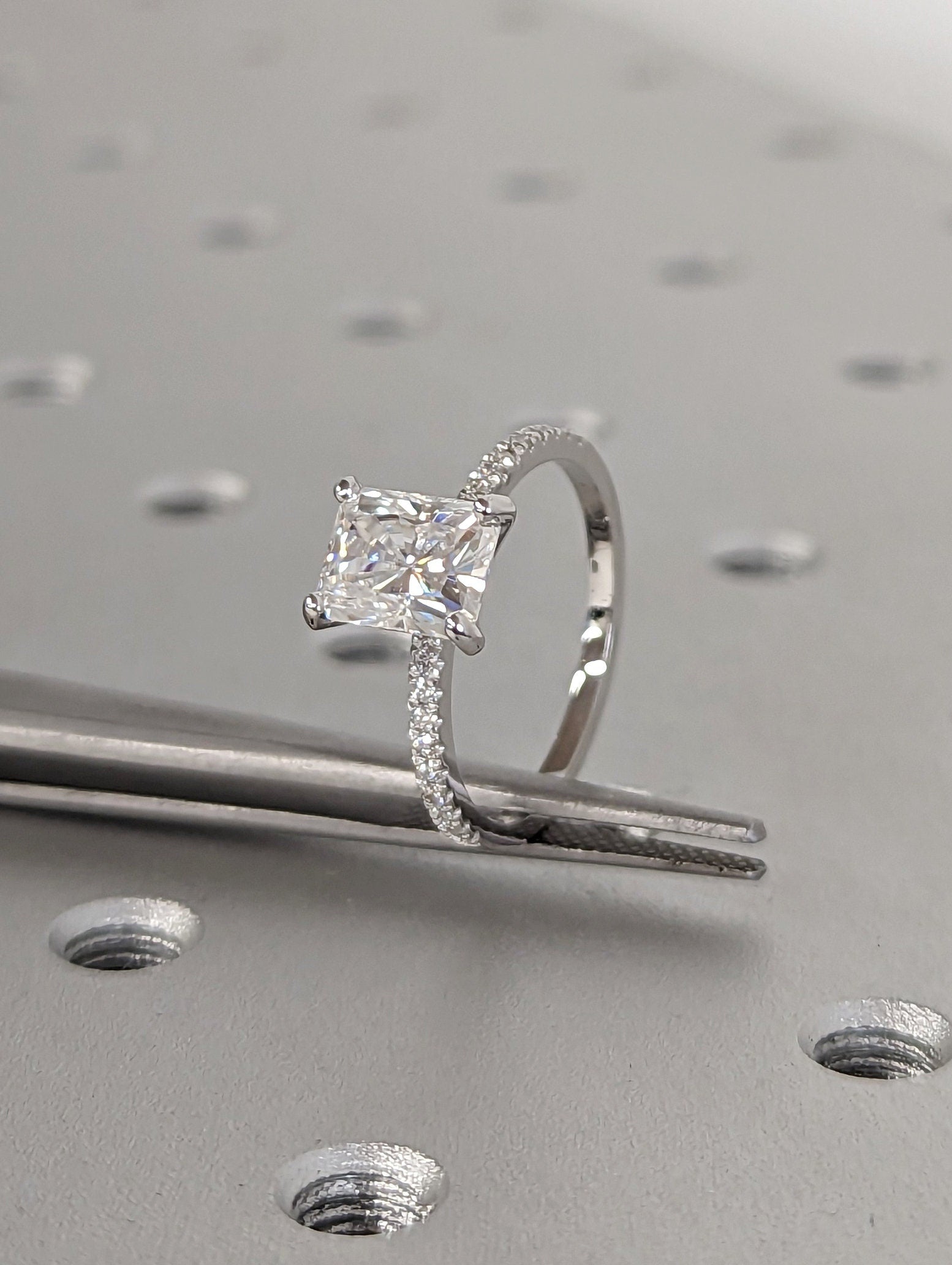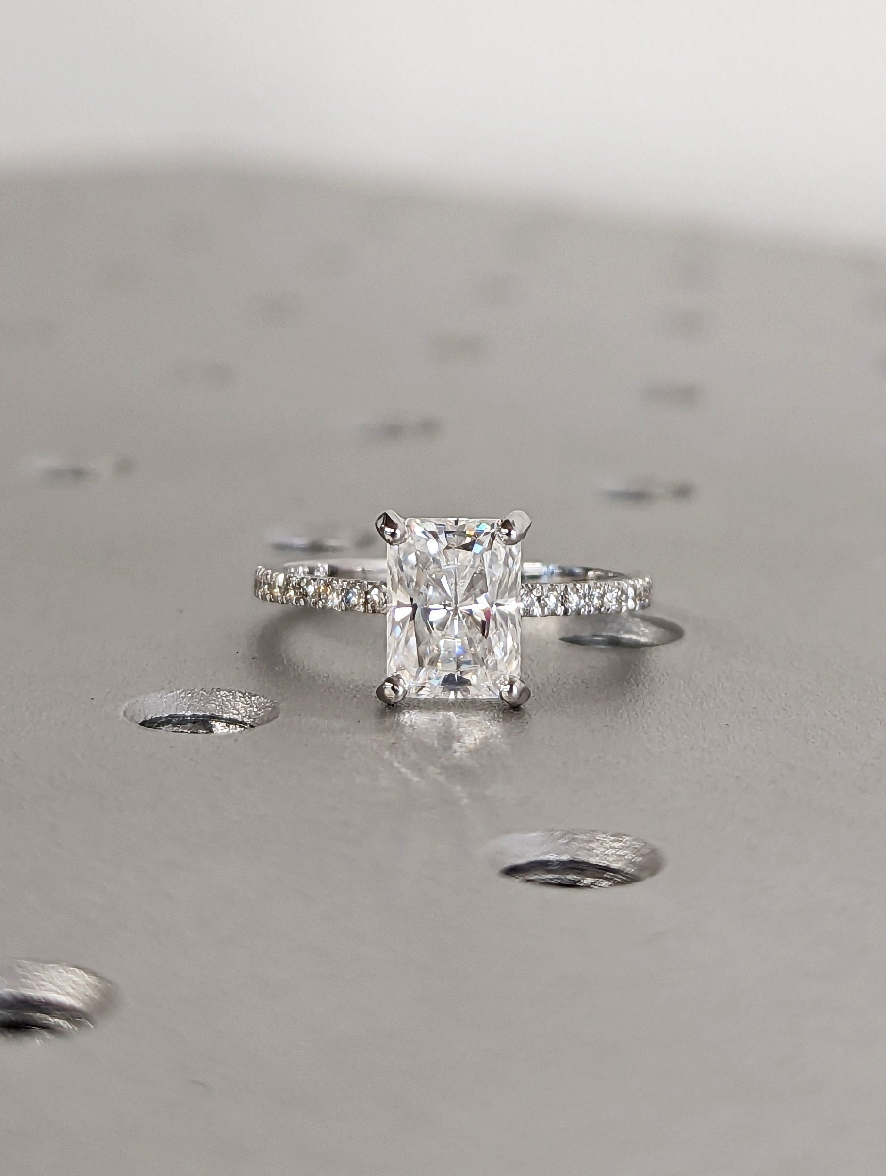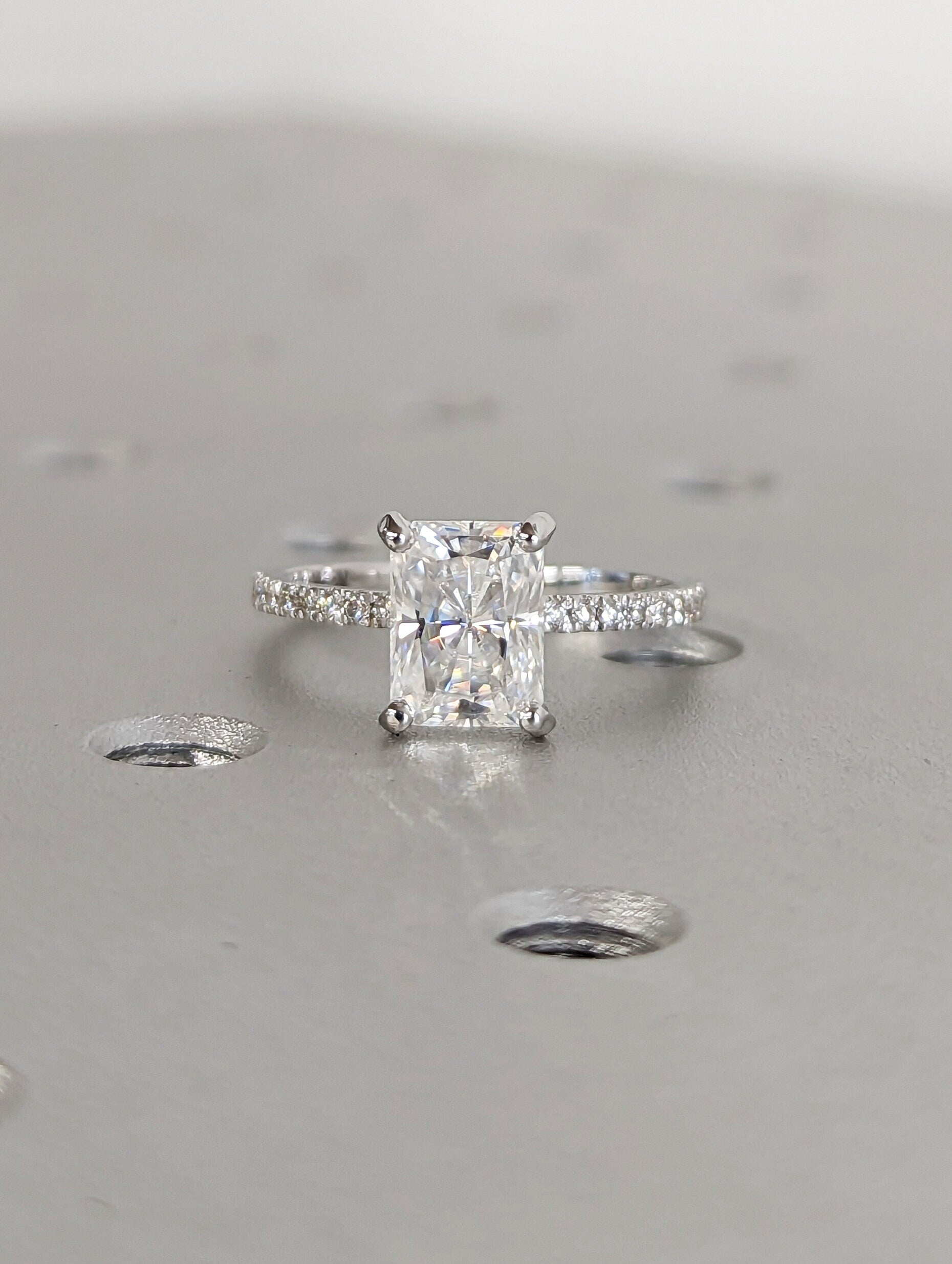 A beautiful radiant shaped moissanite, set with a super delicate and thin setting, paved with a row of diamonds from both sides, a thin band of 1.6mm width, make this ring a true stunner!