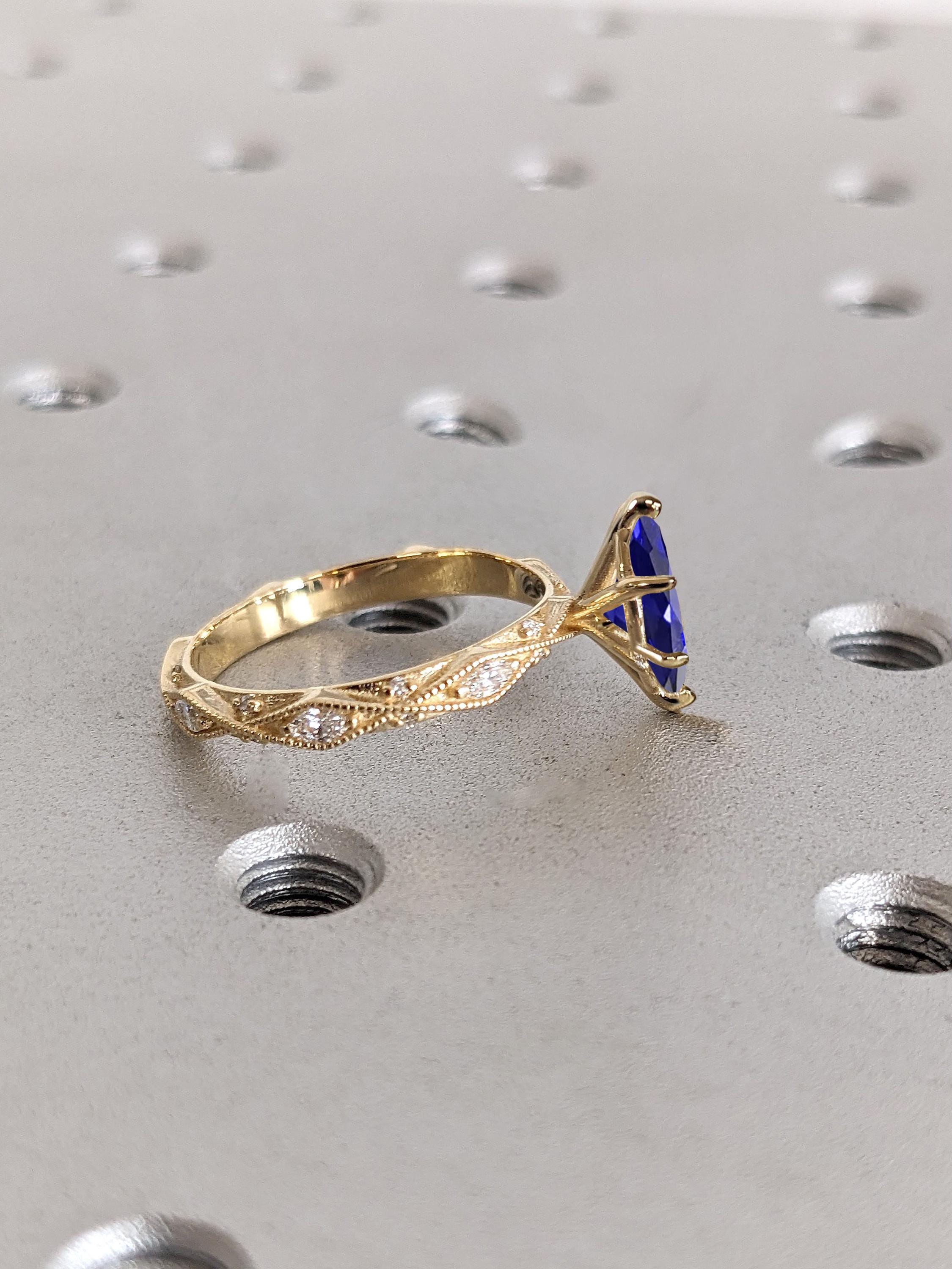 Elegant and intricate, this ring features a marquise-cut Lab Sapphire as its centerpiece. The band is adorned with intertwining milgrain lines, where delicate marquise and round-cut side stones nestle seamlessly into the design. A graceful balance of vintage-inspired detail and modern craftsmanship.