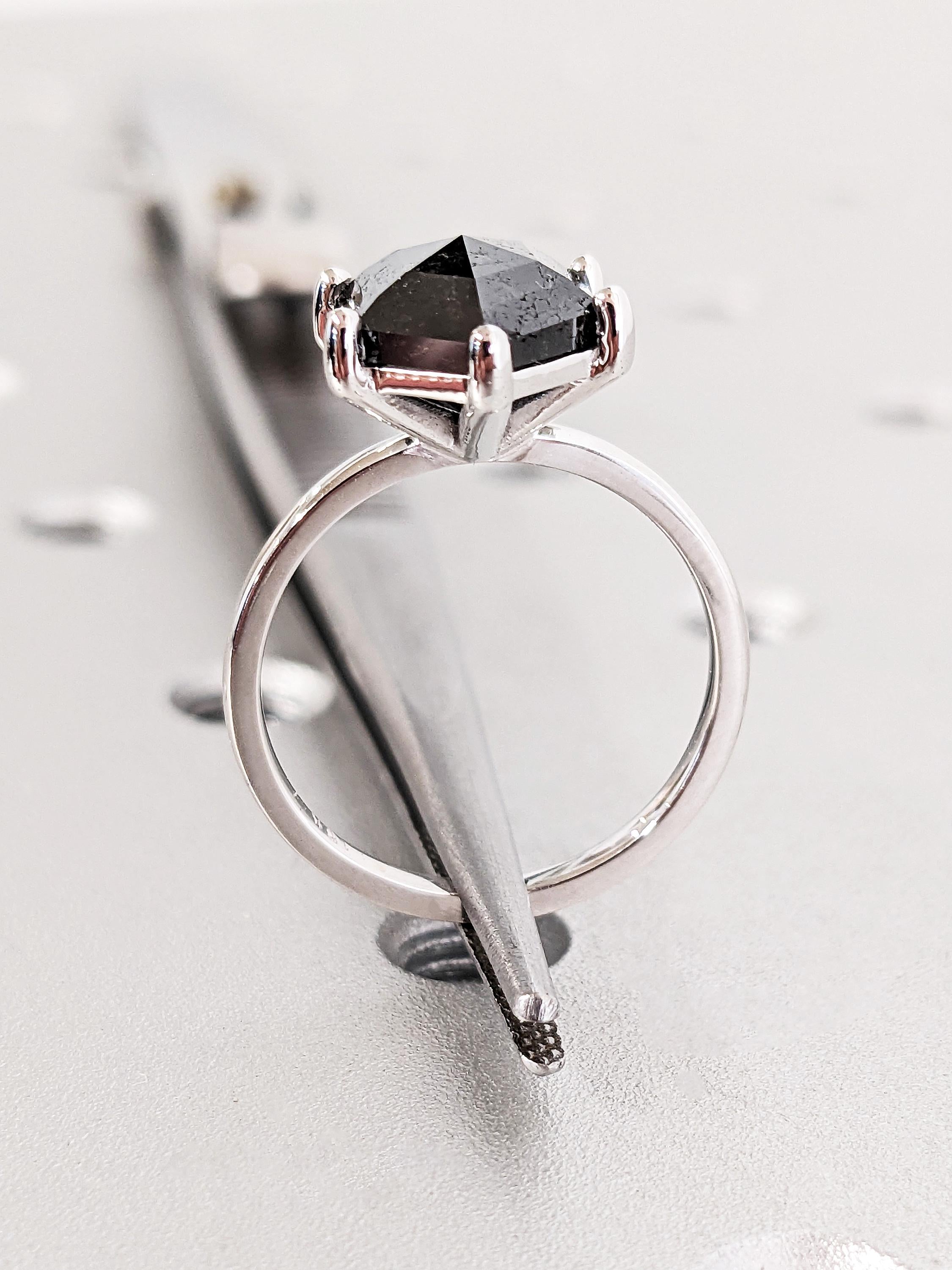 A hexagon cut Salt and Pepper diamond brings a modern edge to this minimalist solitaire design. Its galaxy like inclusions make each stone one of a kind, while the simple band keeps the focus on the diamond’s natural beauty.