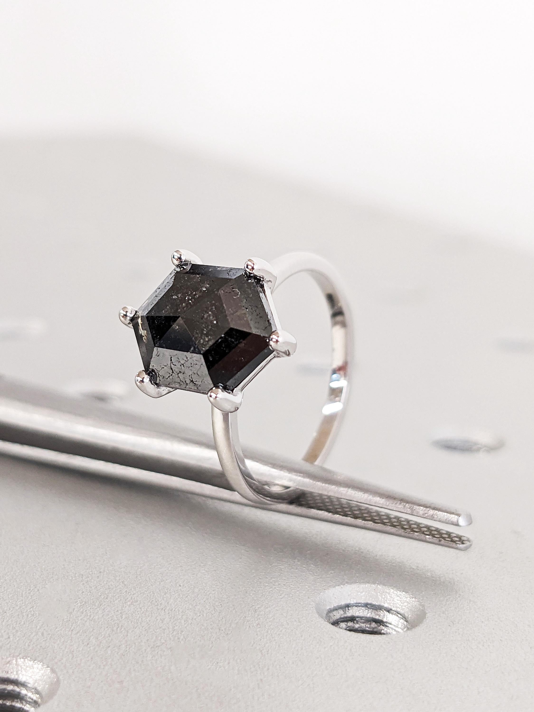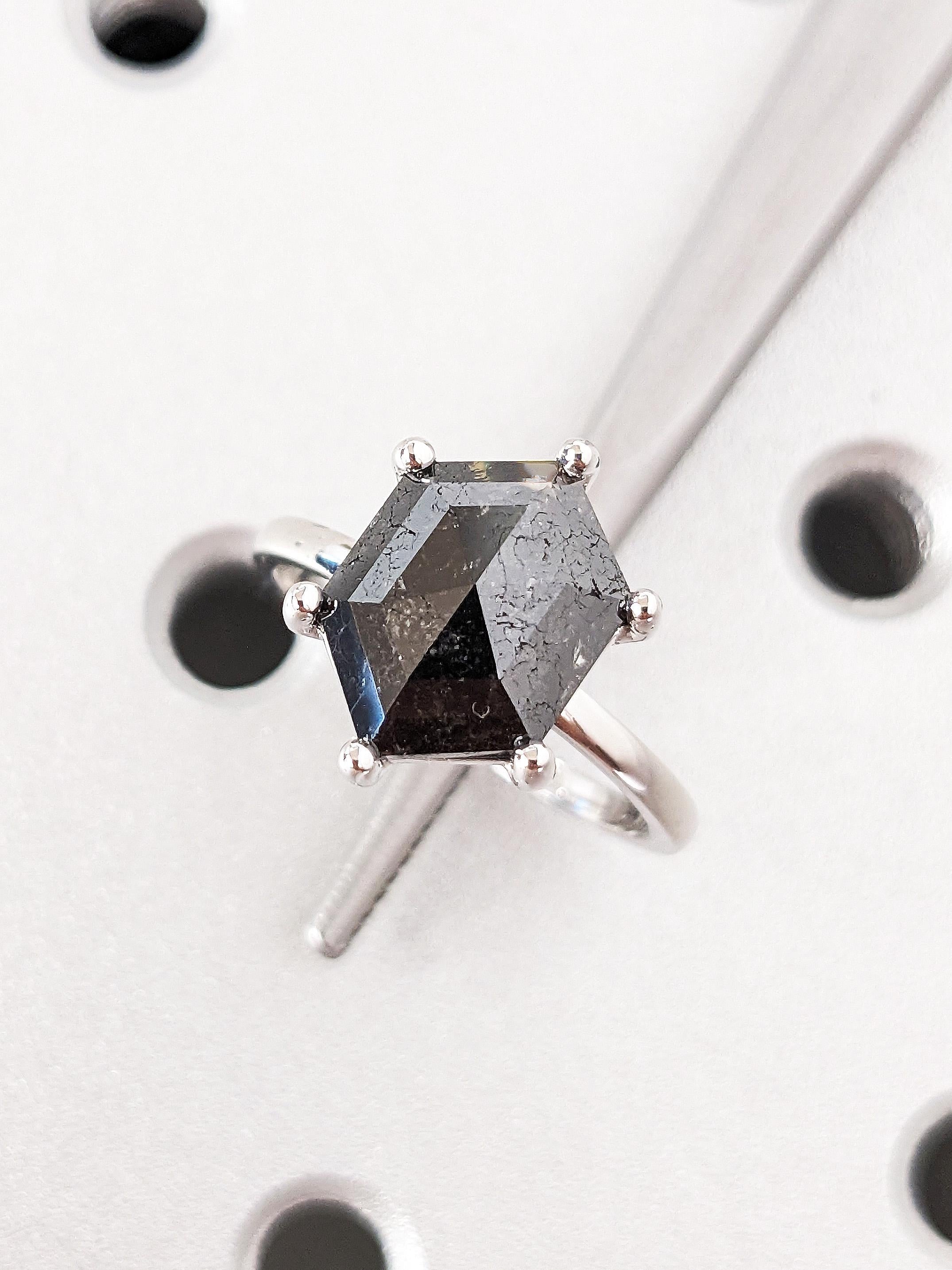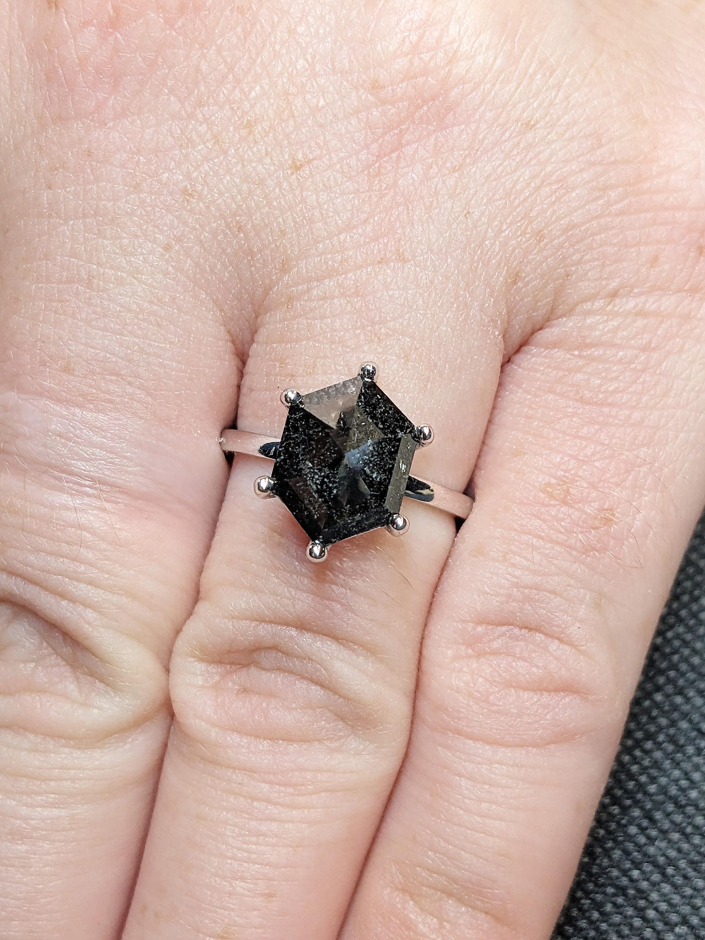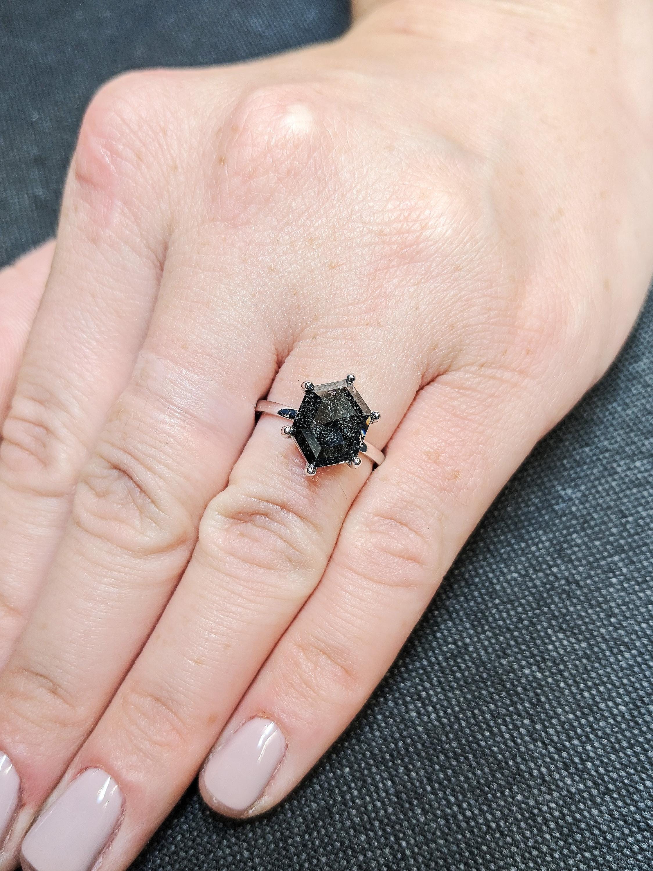18K Solid White Gold Hexagon Cut Salt & Pepper Diamond Engagement Ring, Minimalist Solitaire Black Diamond Wedding Ring, Galaxy Promise Ring